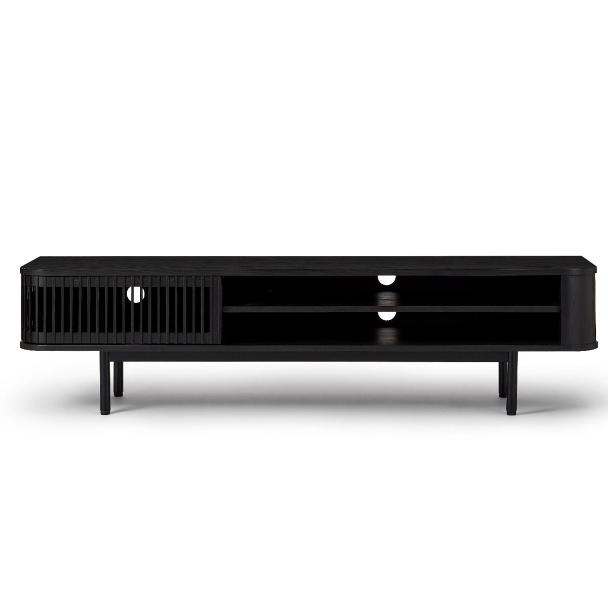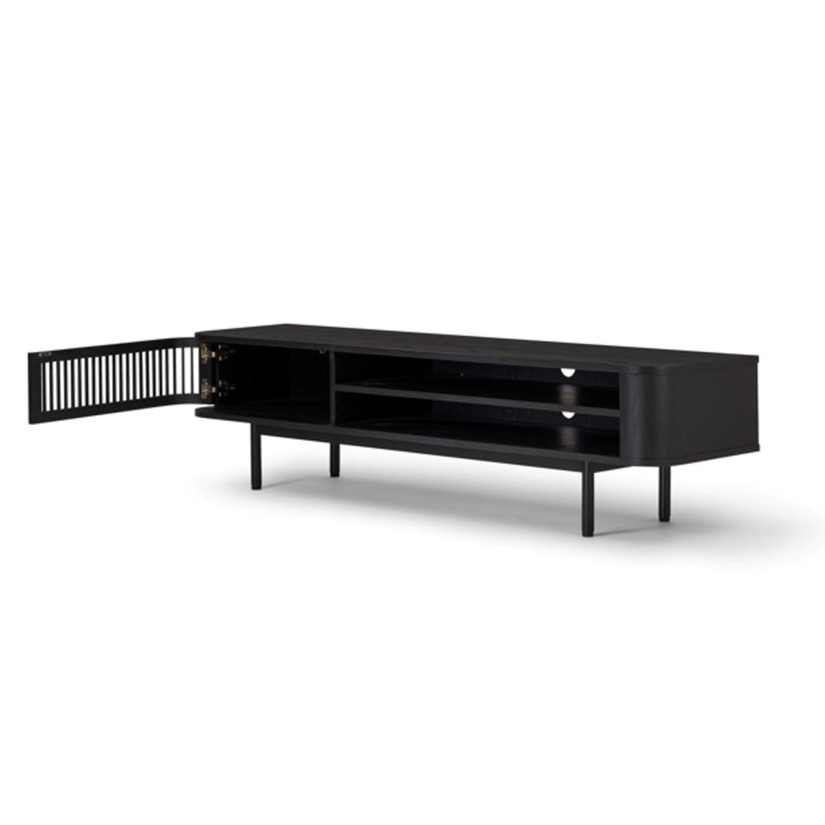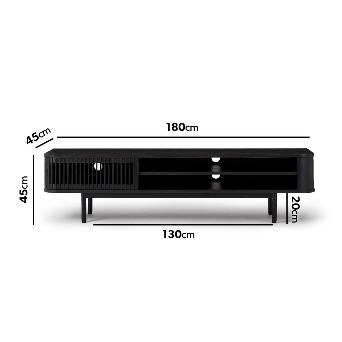 Chic TV stand with a slatted design which adds glamour to any room. Plenty of space with a display shelf with two additional storage shelves. Made from oak veneer, oak door frames and finished in black lacquer while protecting the unique look from the wood grain.
