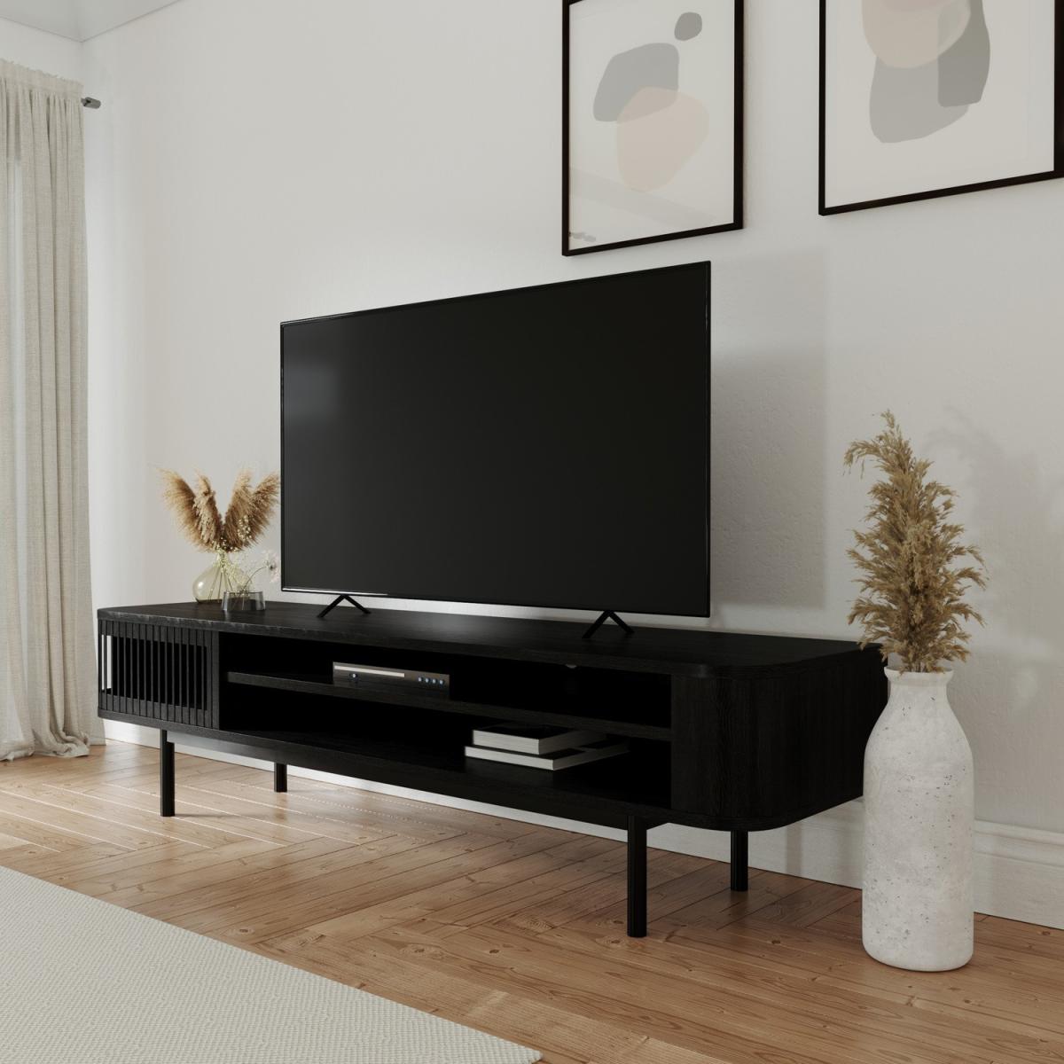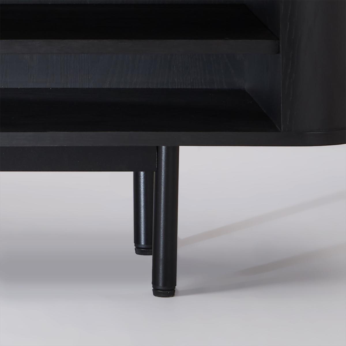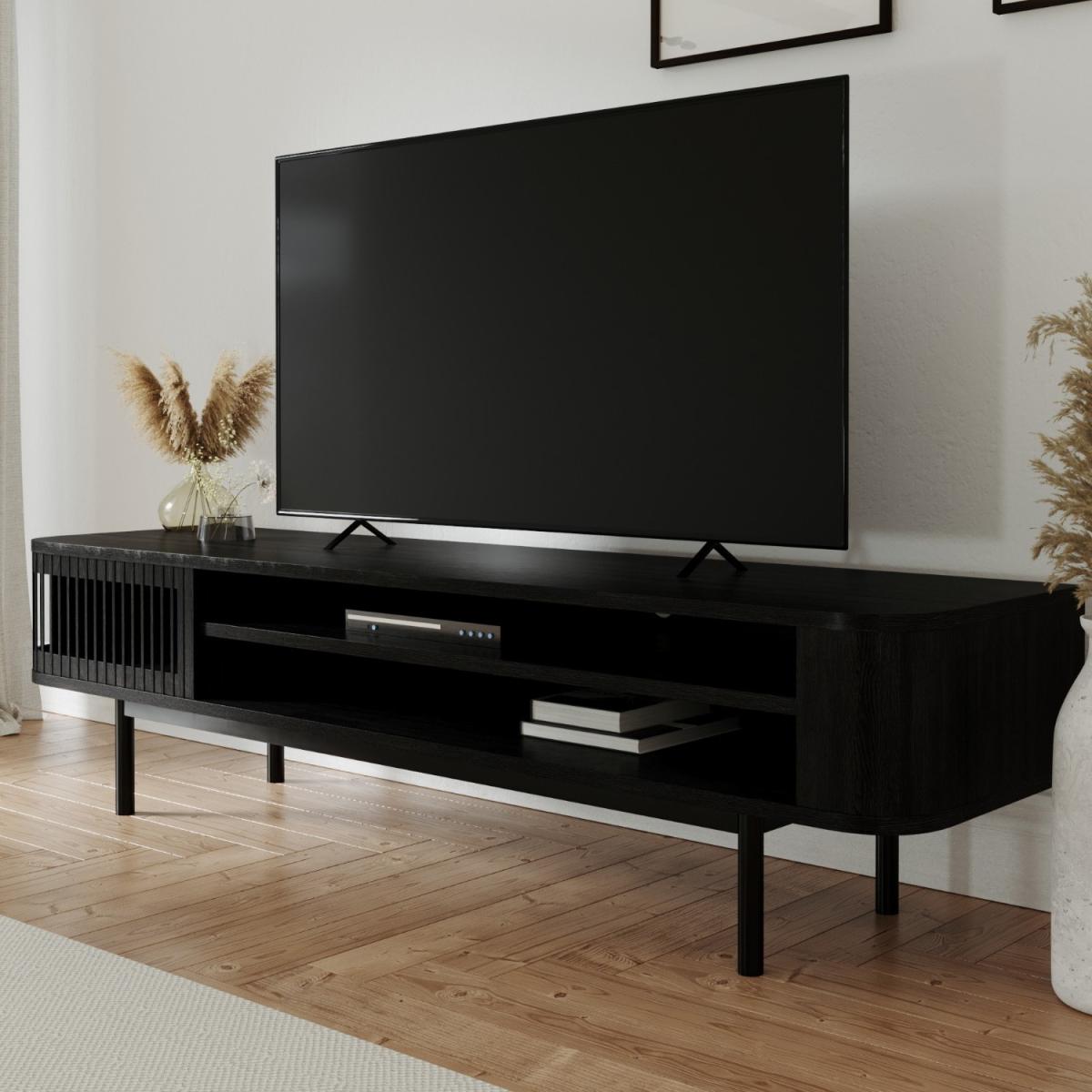 Chic TV stand with a slatted design which adds glamour to any room. Plenty of space with a display shelf with two additional storage shelves. Made from oak veneer, oak door frames and finished in black lacquer while protecting the unique look from the wood grain.