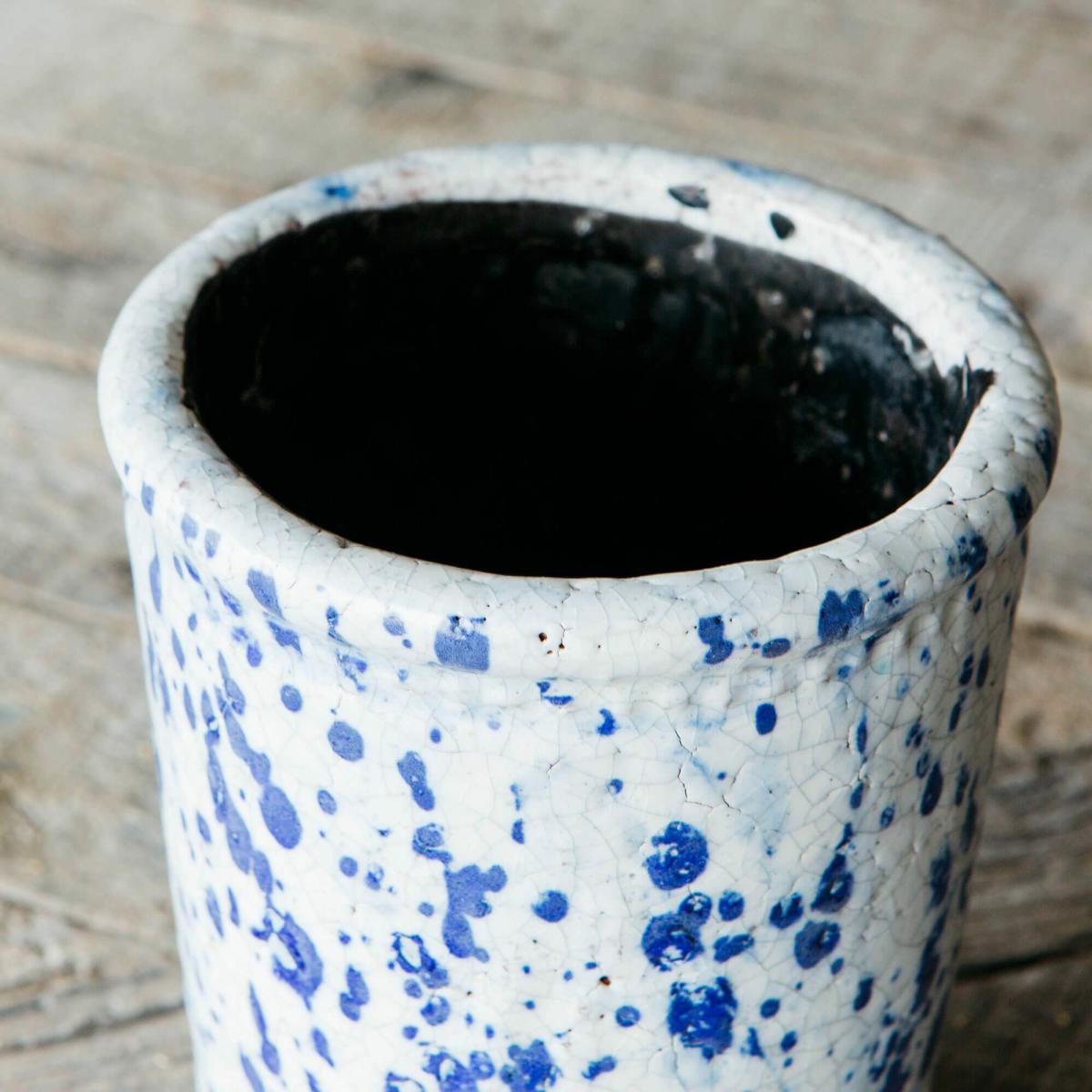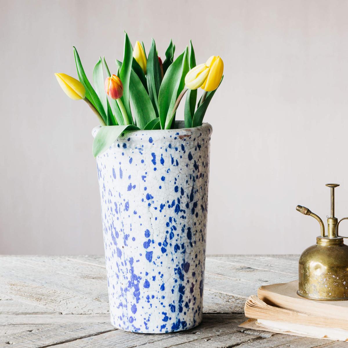 Fill this small painterly vase with dried flowers that complement the splattered blue colour and unusual crackle finish.