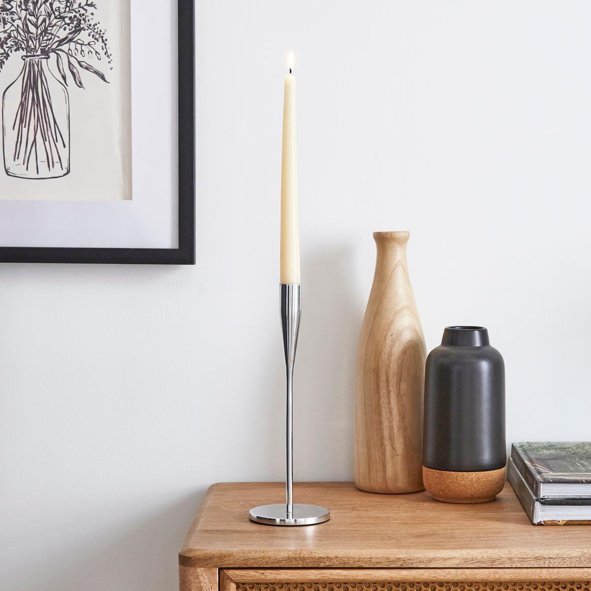 I love this silver candle holder for its sleek, minimalist design that adds a touch of modern sophistication to any space. It works particularly well in contemporary interiors, as well as Scandi-inspired schemes, thanks to its clean lines and reflective surface. For practical styling, consider grouping it with smaller candles in varying heights on a coffee table or sideboard to create an inviting focal point. To keep the look balanced, pair it with matte textures or natural woods, as seen in the background of the image, for a warm yet polished finish. This piece is versatile enough to work as a standalone statement or part of a more layered decor display.