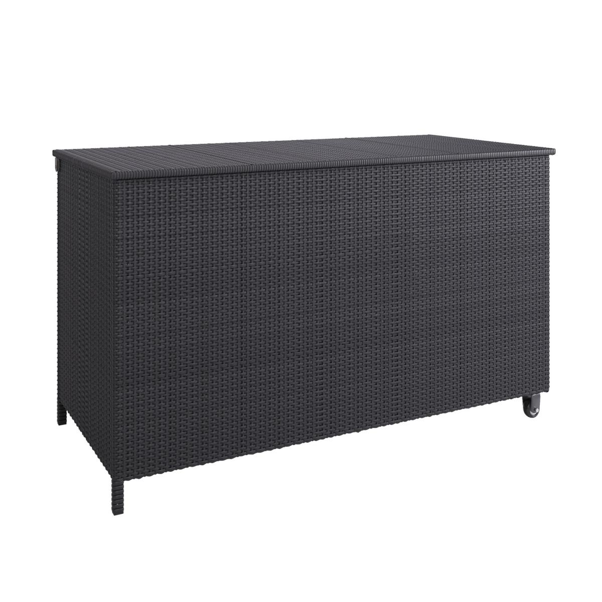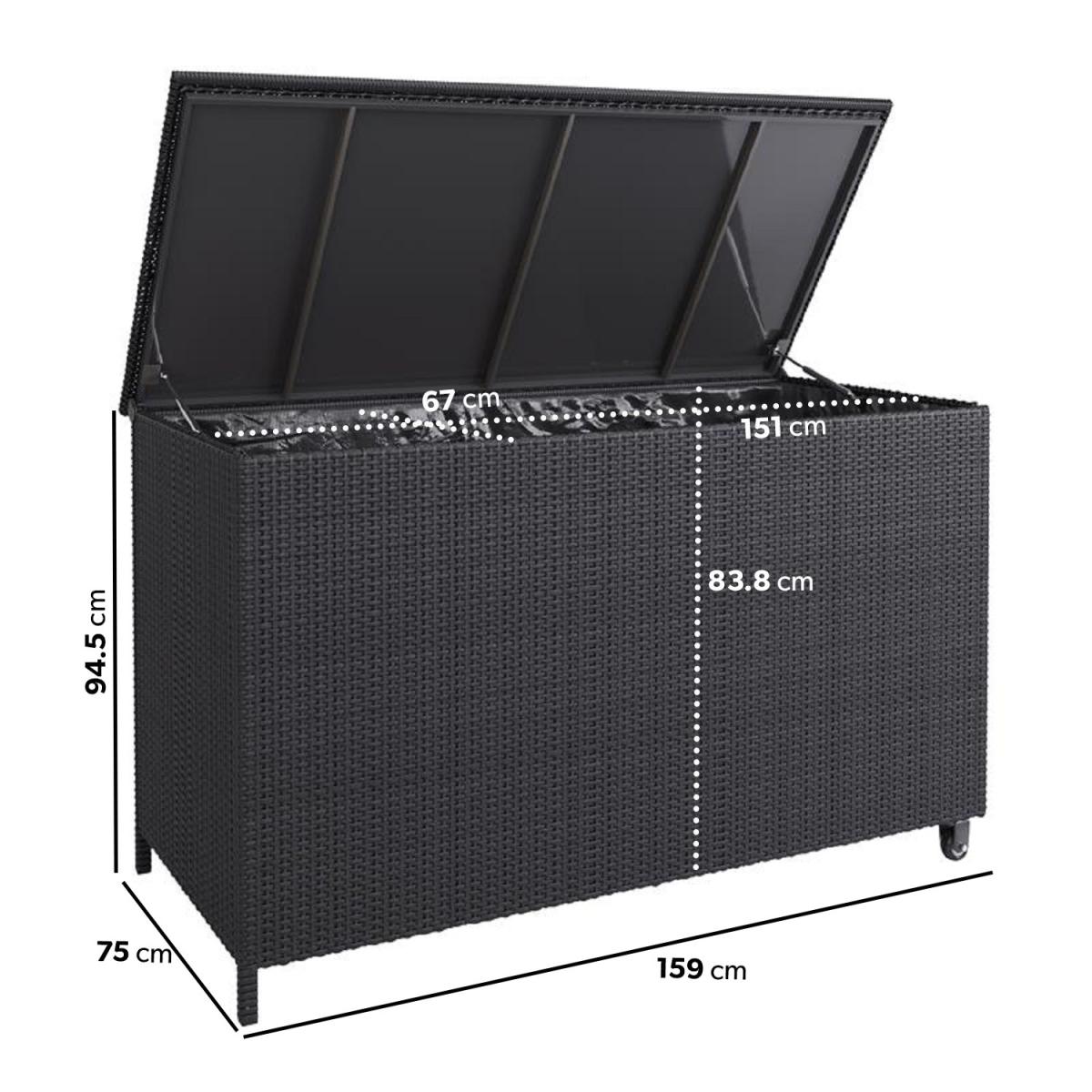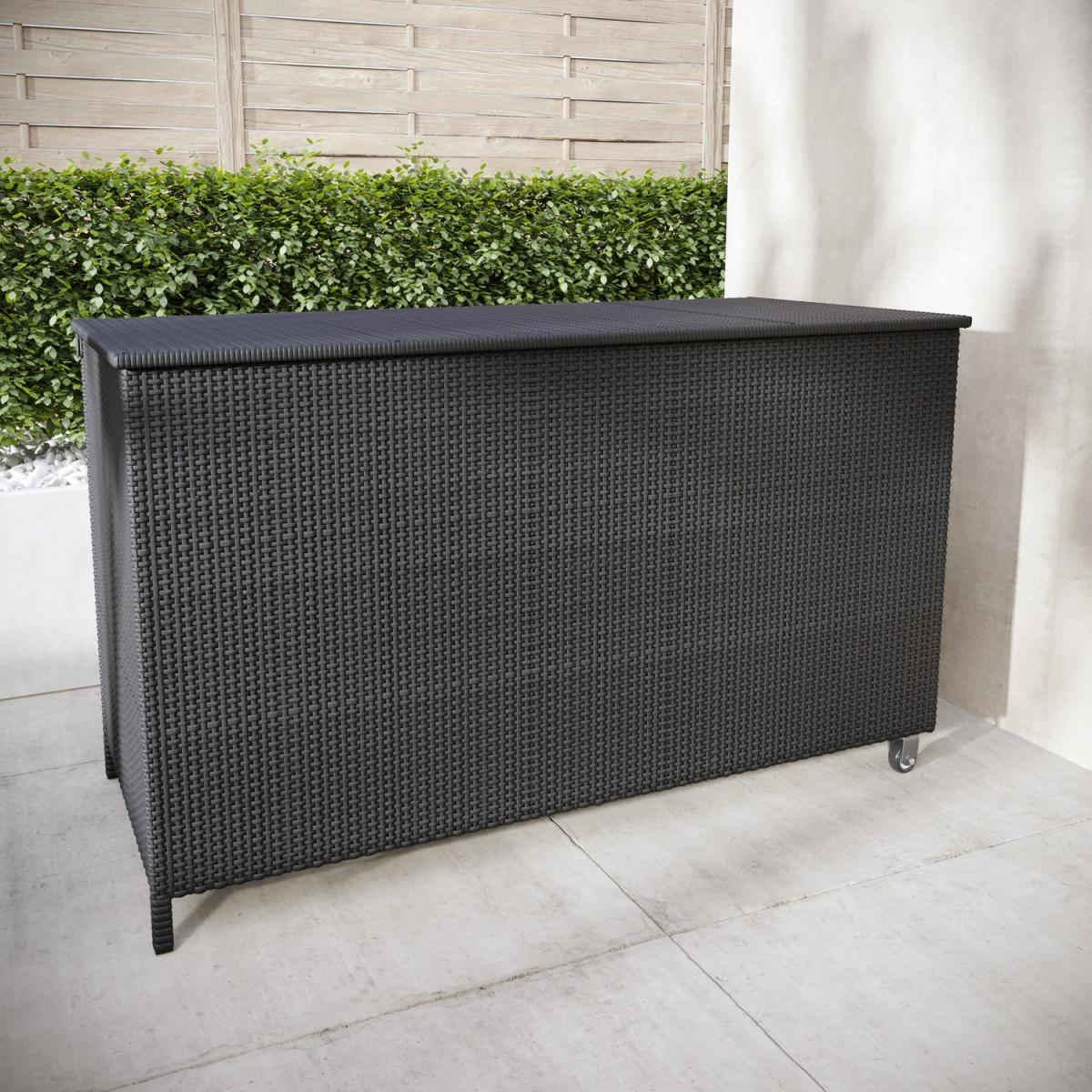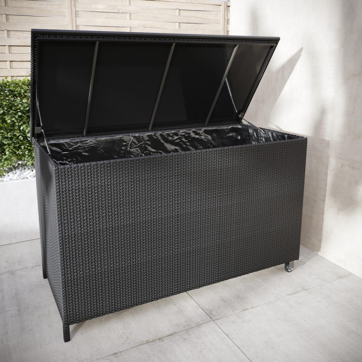 Made from high-quality rattan to withstand light rain, sun, and frost. Effortlessly open and close the lid with built-in gas struts, ensuring a smooth, hands-free experience. Keeps your cushions, blankets, and outdoor accessories dry and protected from moisture and dust. Caster wheels on one side and a sturdy handle on the other allow easy repositioning around your outdoor space. Ideal for storing outdoor cushions, light garden equipment, or pool accessories that you need quick access to. Complements any garden décor with its modern rattan weave and neutral grey finish. Keep your outdoor space clutter-free with this premium weather-resistant rattan cushion storage box, and keep your garden essentials safe, dry, and organised all year round. This spacious storage chest has been designed for functionality and practicality and is perfect for storing outdoor cushions, light garden tools, pool accessories, and more. It features a durable rattan construction, castor wheels and a handle for easy movement, a waterproof lining and a gas-lift lid for effortless access, making it an ideal addition to any garden, patio, or decking area.