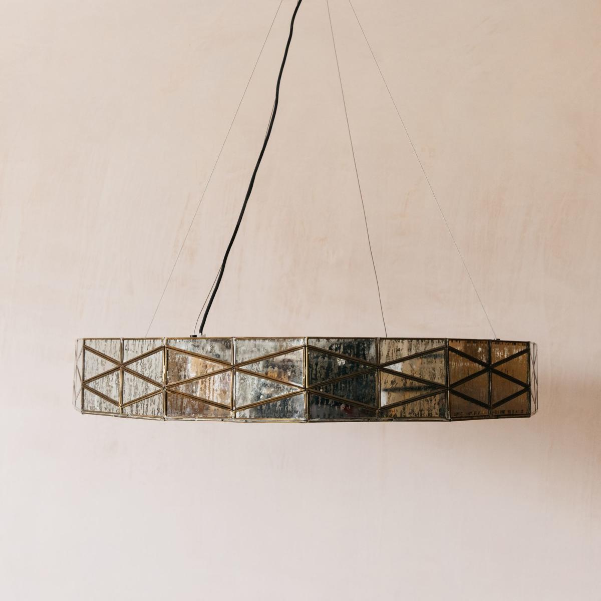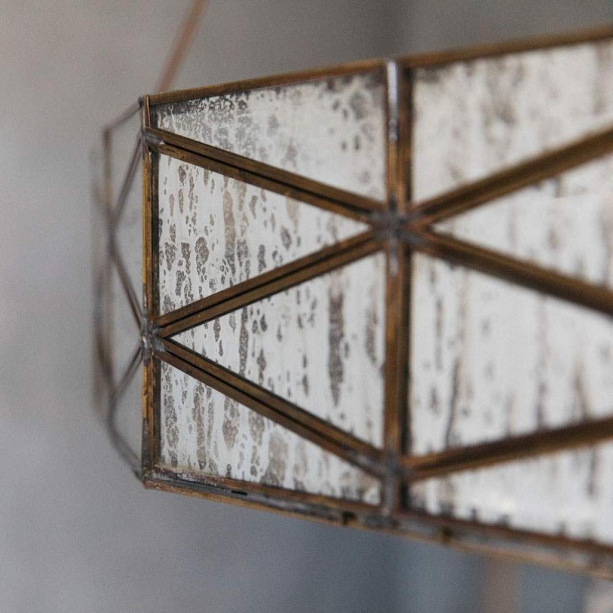 Handcrafted from mottled glass triangles held together by an iron and brass frame with an antiqued copper finish, our Chatsworth chandelier is a statement piece. Oversized with impressive proportions, this striking ceiling light truly captures the glamour of the art deco era.
