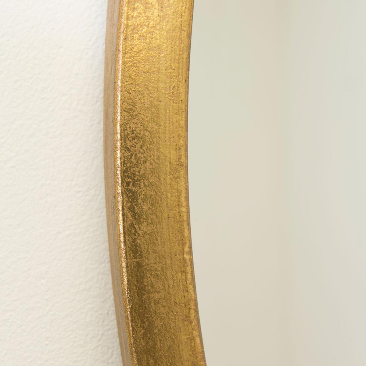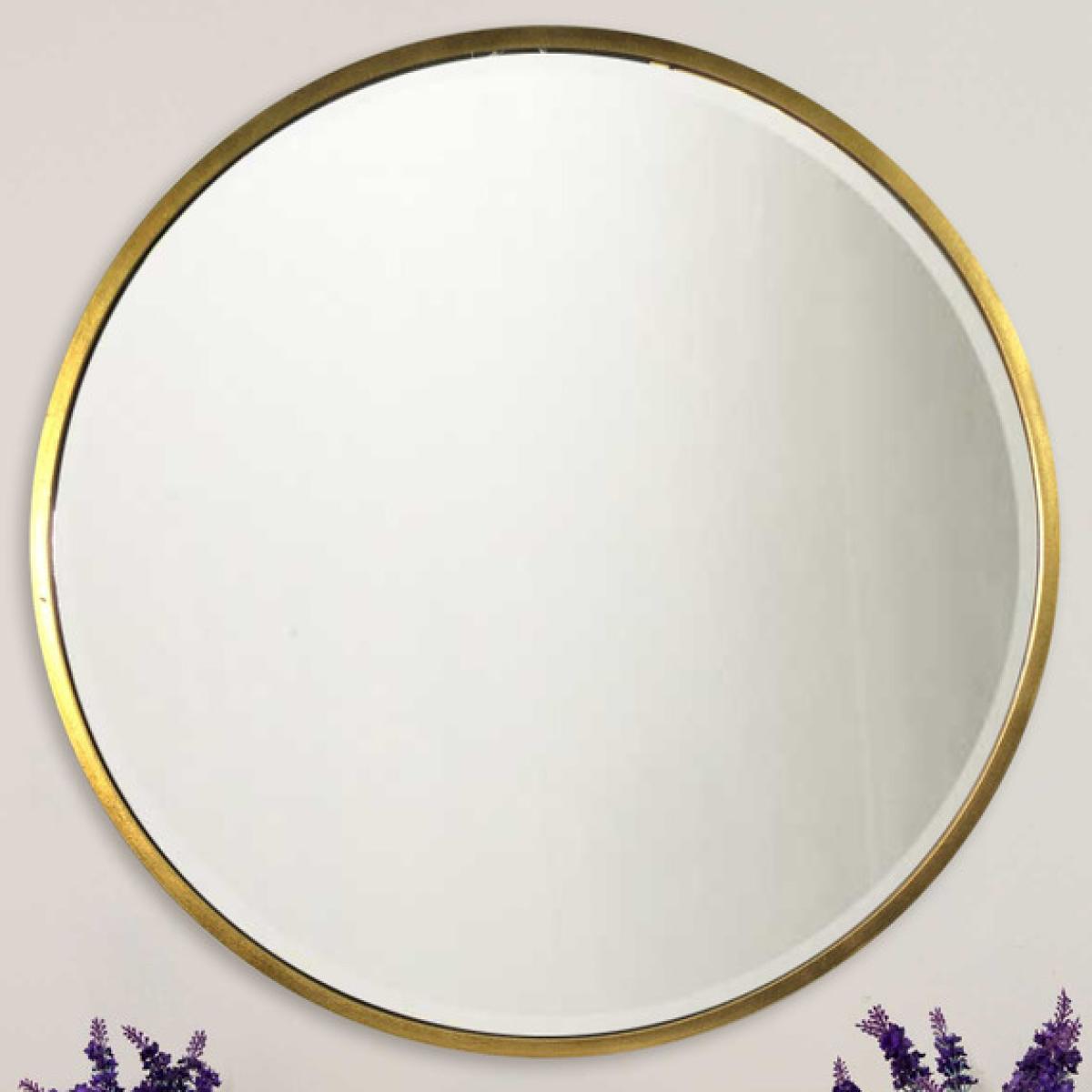 Large circular round wall mirror with a 2cm wide Gold frame around a bevelled circular piece of glass. The overall size is 100cms x 100cm, 3ft3 x 3ft3 and a glass size of 94cms x 94cms. There are hanging lugs on the rear.
