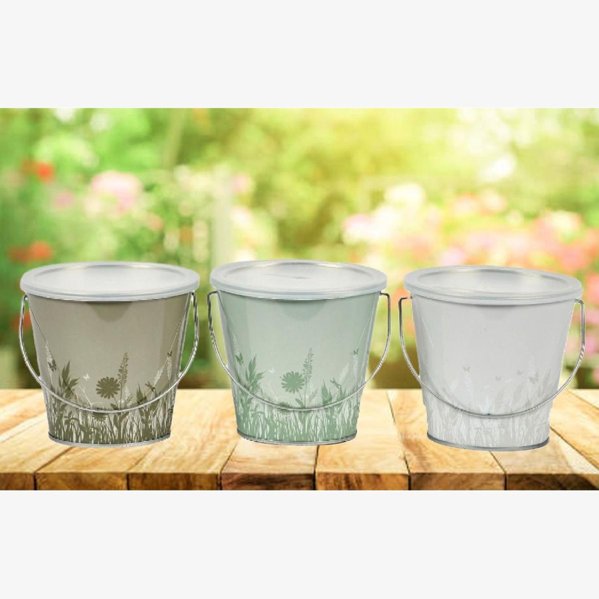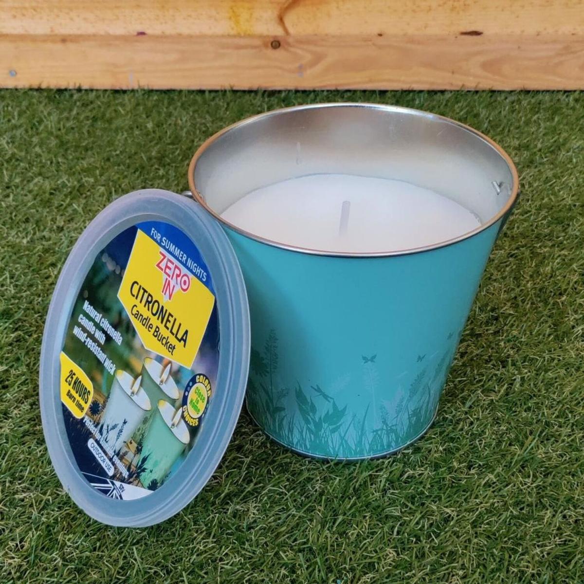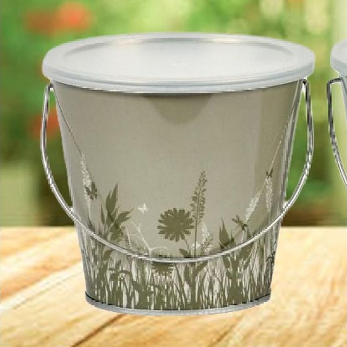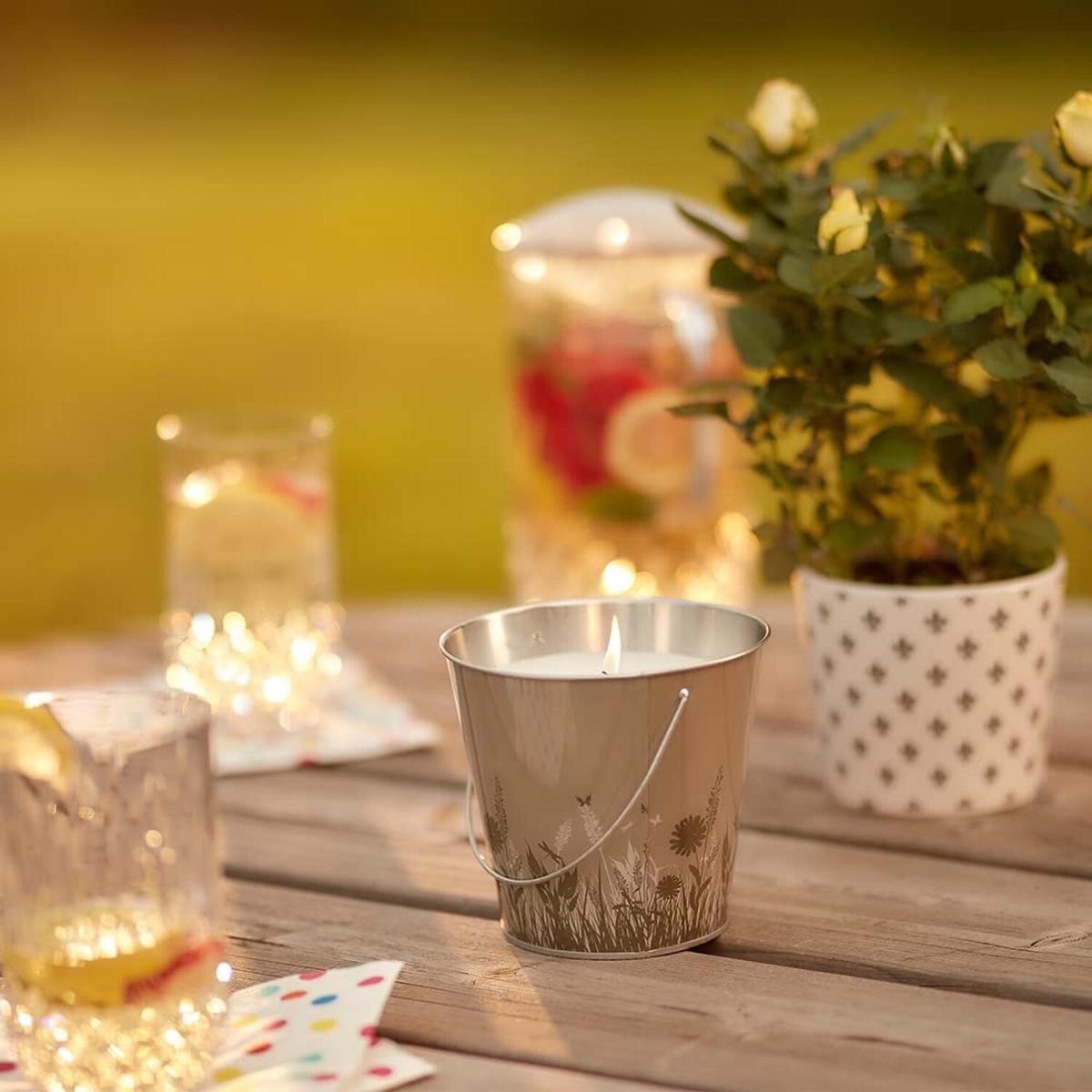 This elegant nature print citronella bucket candle is an ideal necessity for those warm summer evenings. Not only is it great for decorative purposes and creating a warm welcoming atmosphere, but it is also designed to help keep those pesky bugs at bay too. The bucket measures approximately 13cm in diameter and 12cm in height and features a neutral green coloured nature print perfect for those summer days. One coloured bucket supplied at random. The free-standing design enables you to use on tabletops and the integrated handle makes moving about an easy task. Quick and easy to light and will burn for up to 25 hours. Featuring a wind resistant wick and containing natural citronella oil, this bucket candle is a must have for outdoor dining or cozy evenings in the garden.