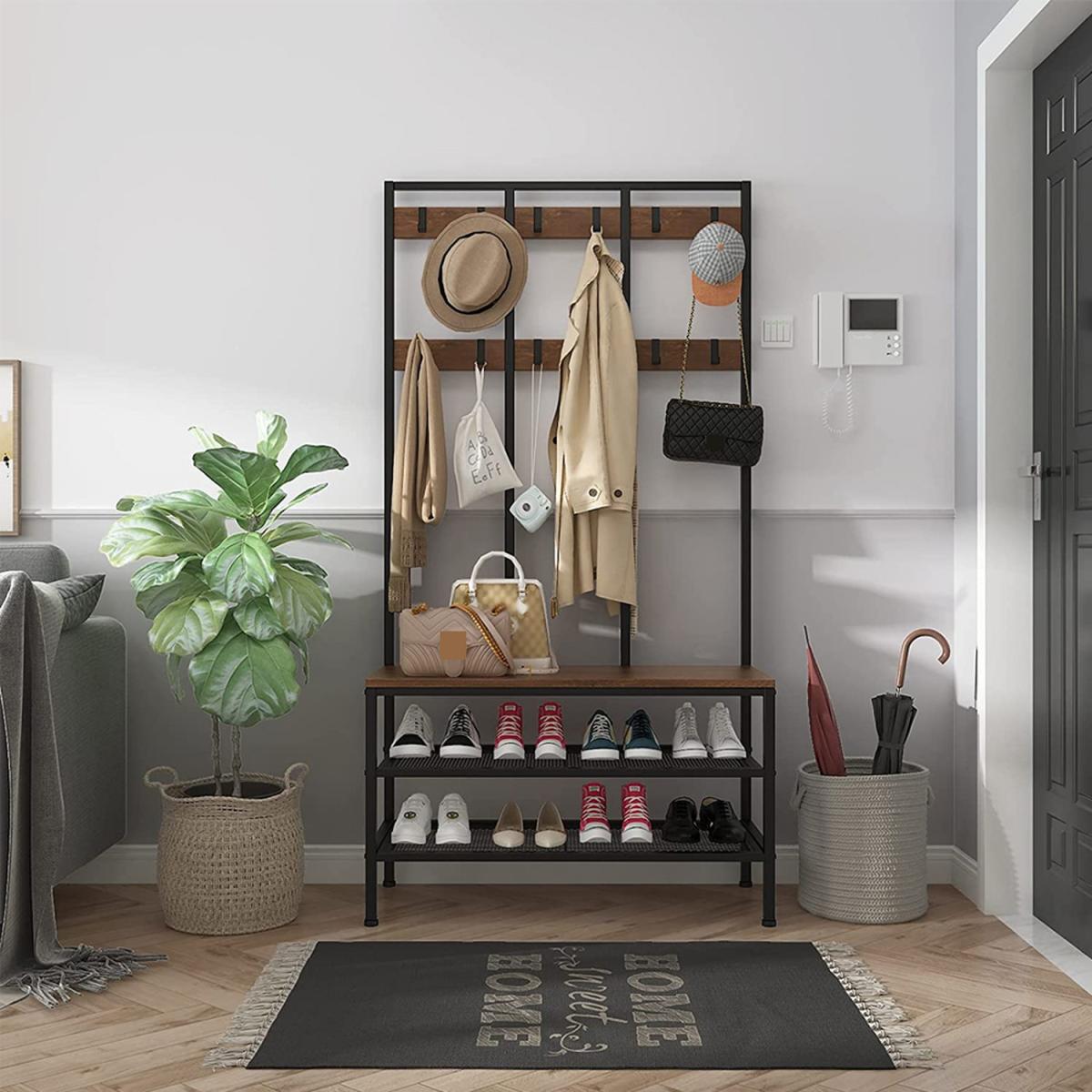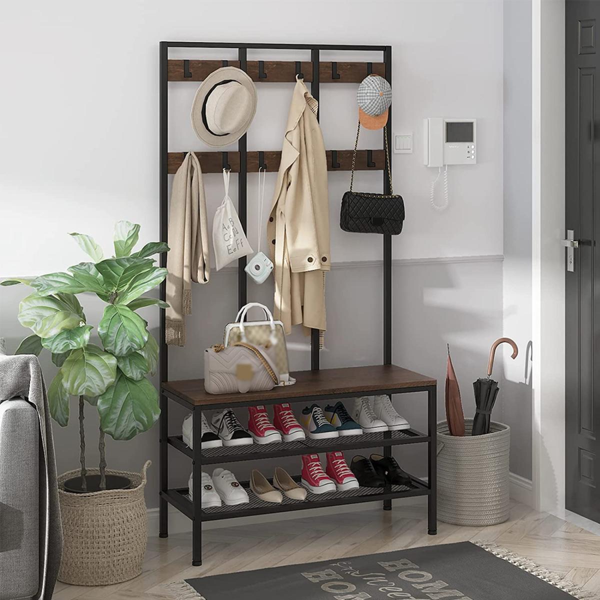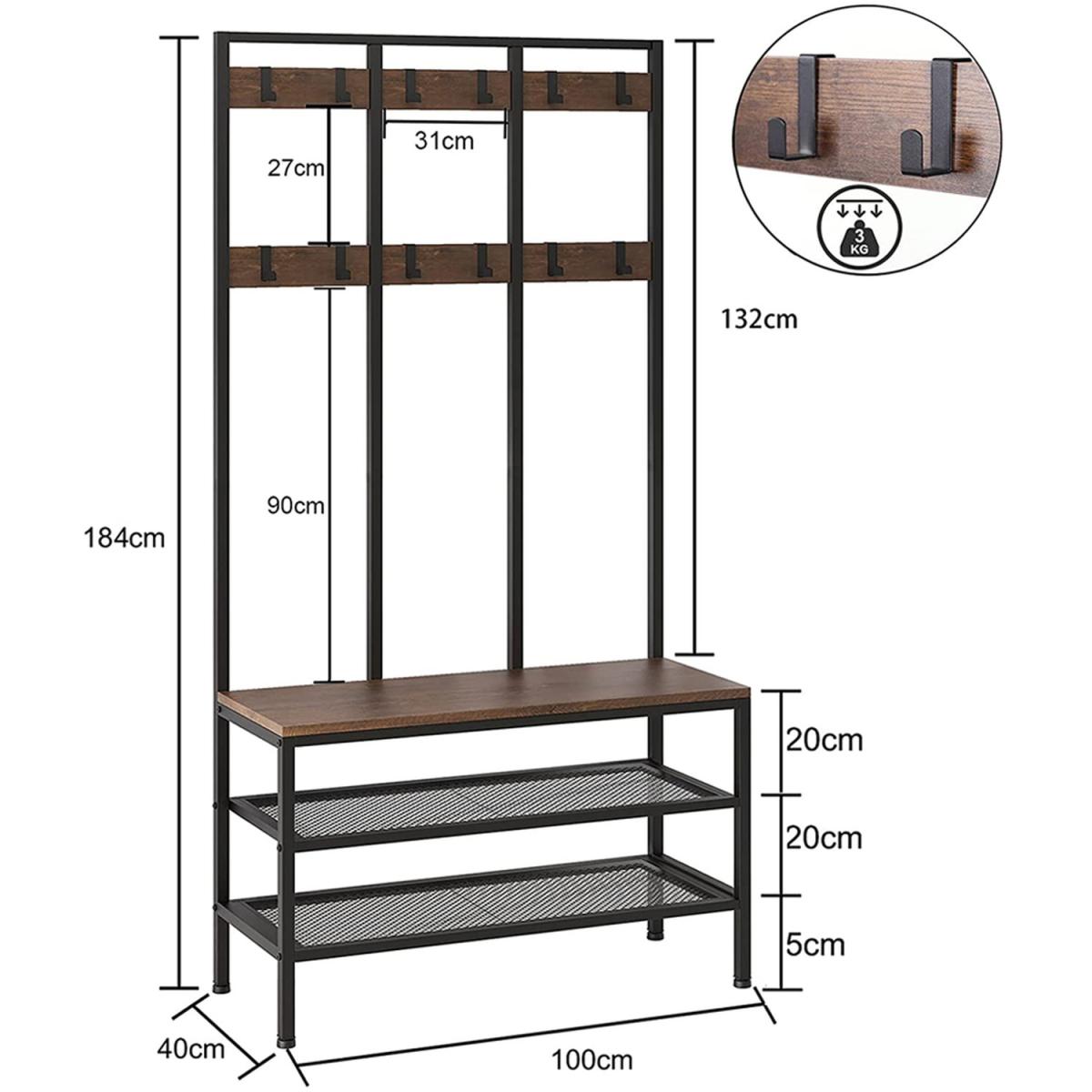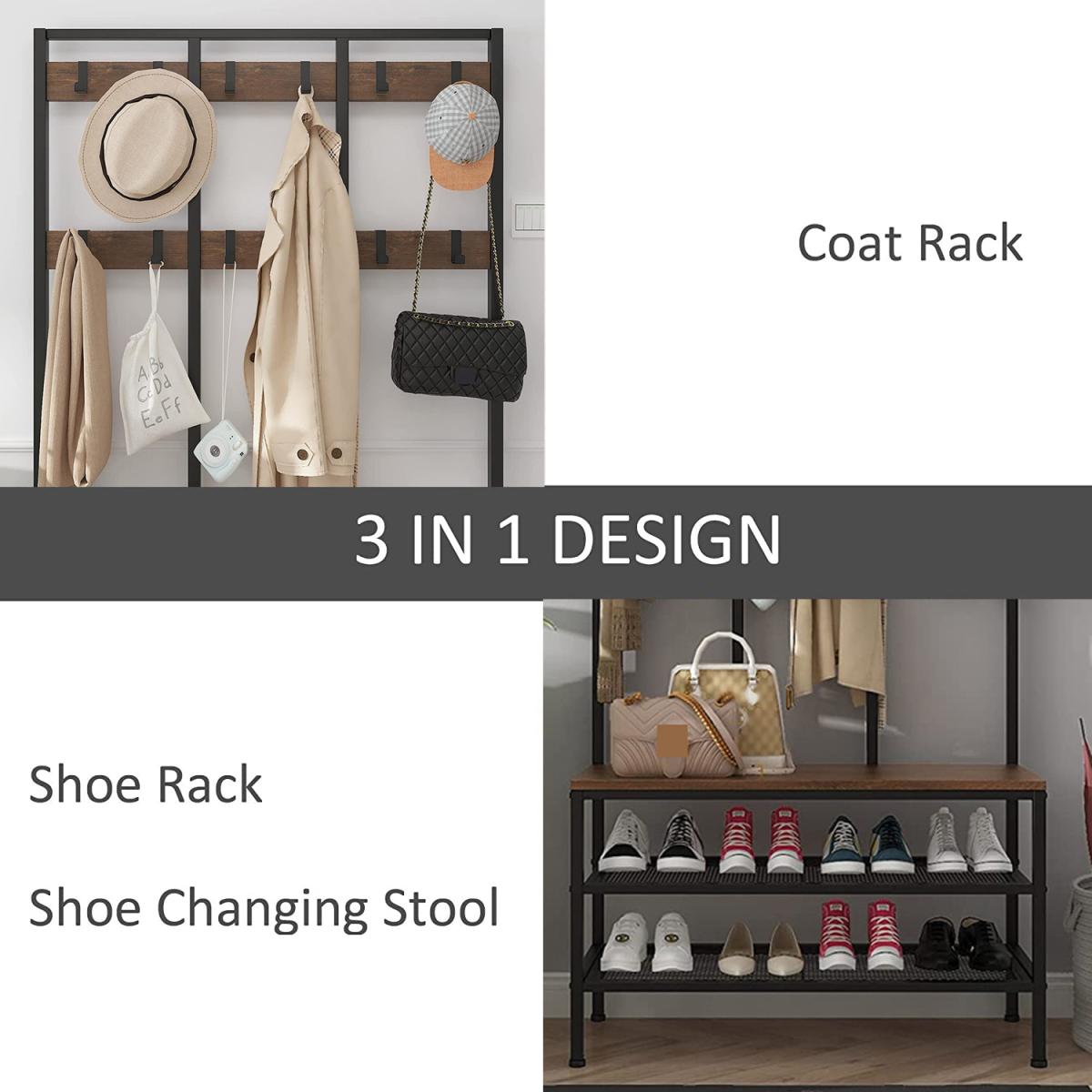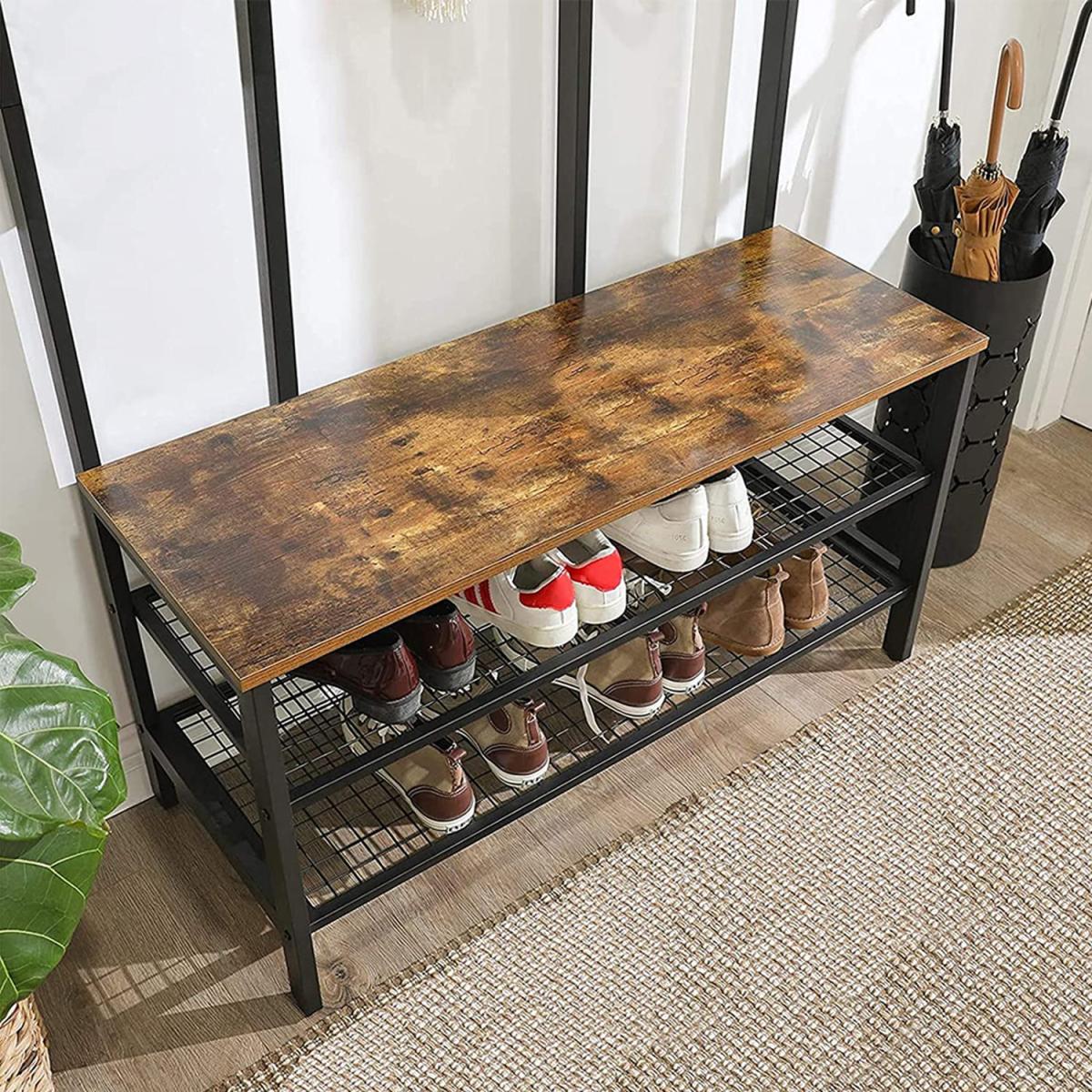The coat rack with 12 dual hooks allows you to hang your clothes, bags, and umbrellas. And a bench can be sit on which holds up to 80kg. 2 metal storage shelves to store your shoes, storage boxes handbags in a limited space. In contrast to other coat stands, this coat rack has 2 extra strong metal rods between the hooks for better stability and strength. Metal hook and can move left and right (each hook load capacity: 3kg). The eye-catching hall tree is made of robust metal tubes and vintage-style MDF board. The coat stands with 4 adjustable feet which can stand perfectly and stably on the carpet or the unbalanced board. An all-in-one coat stand sizes 100x40x184cm collection with coat hooks and a shoe bench is more convenient and practical. Place the versatile hall tree in your hallway, living room, bedroom, or anywhere you need a little more organization, making everything handy when you're in a hurry. Thanks to the simple structure of the coat racks and the detailed instructions, easy to put together.