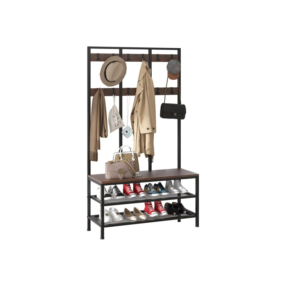 Are you looking for a stylish and functional way to organize your entryway? If so, you¿ll love our coat rack with bench and shelves. This coat rack has 12 dual hooks that can swivel left and right, allowing you to hang your clothes, bags, umbrellas, and more. Each hook can hold up to 3 kg of weight, and the rack has two extra strong metal rods between the hooks for better stability and strength. Our coat rack also has a bench that can hold up to 80 kg of weight, where you can sit and put on or take off your shoes. Below the bench, two metal shelves can store your shoes, storage boxes, handbags, and other items. The rack has four adjustable feet that can stand perfectly and stably on any surface, whether it¿s carpet or hardwood. Our coat rack is made of robust metal tubes and vintage-style MDF board, creating an eye-catching hall tree that can fit any decor. It has a large size of 100 x 40 x 184 cm, offering you plenty of storage space and convenience. You can place the coat rack in your hallway, living room, bedroom, or anywhere you need a little more organization. It will make everything handy when you¿re in a hurry. Our coat rack is easy to assemble and comes with everything you need. It has a simple structure and detailed instructions that will guide you step by step. You can set up your coat rack in no time and enjoy the style and functionality it brings to your home.