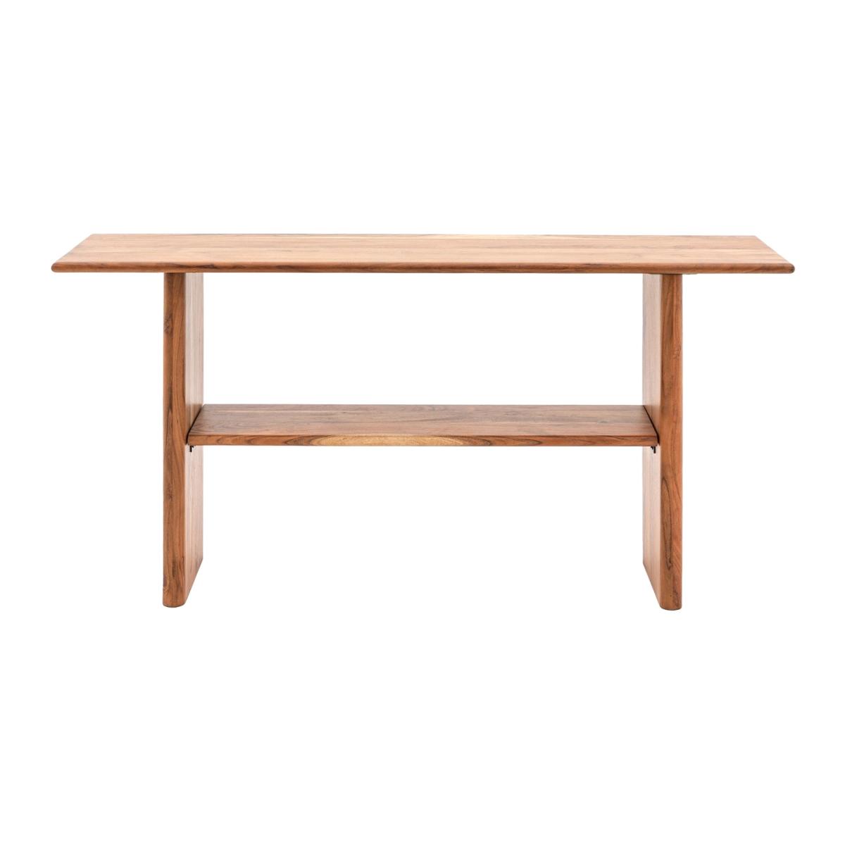 Dimensions:W160 x D43 x H75 cm The simple design of this console table lets the richly grained Acacia wood speak for itself, with a wide top and legs showing off the beautiful wood. An additional lower shelf for extra storage makes this Console table a practical and stylish addition to any room. Coordinating further furniture pieces also available. Features: Natural oak Feet Height 72.5cm Extra storage A wide top and legs showing off Matching items available Some assembly required