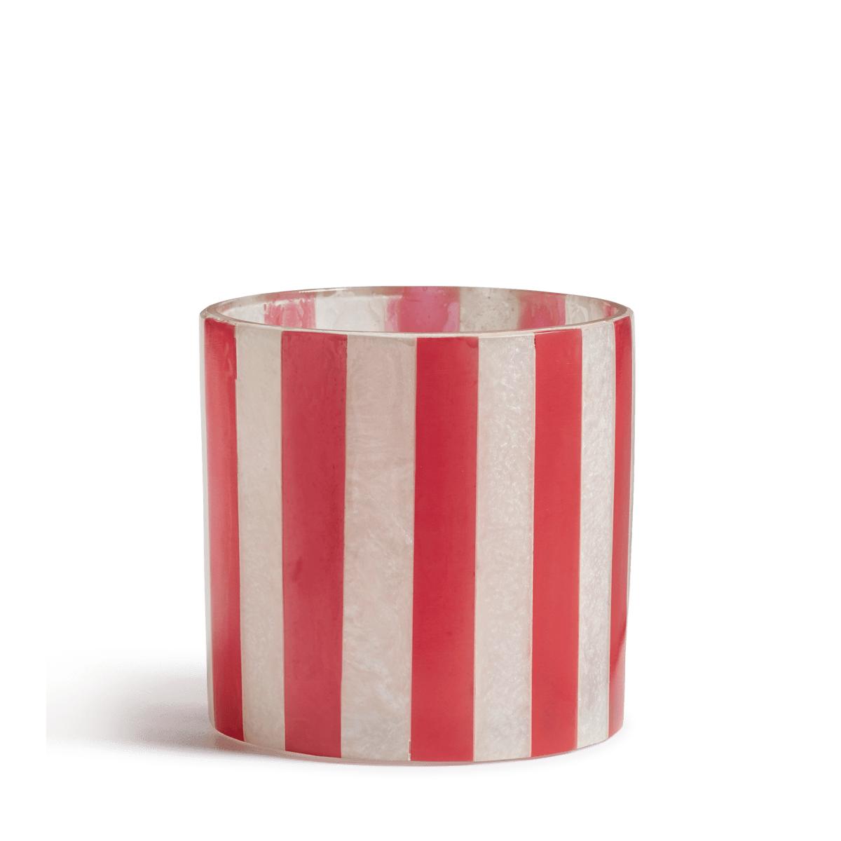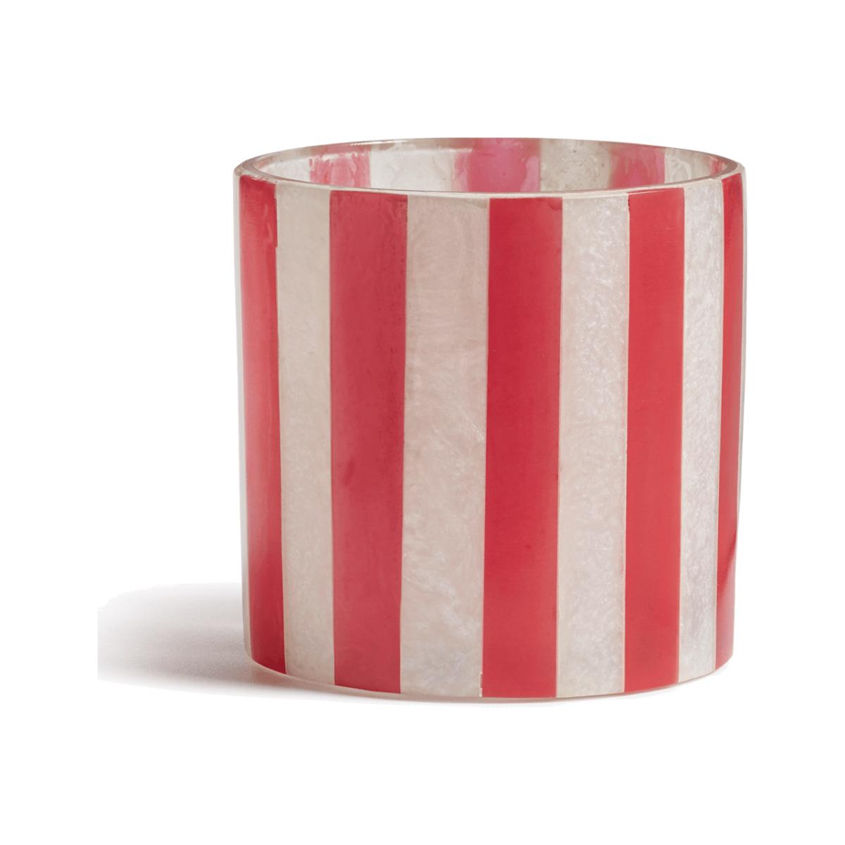 The Cormack is named for its candy cane-like stripe, hand-applied on the glass surface by skilled craftspeople. The chunky shape of the holder brings character to a tabletop, with its irregular thickness adding to the fun appearance. This Cormack comes solo, but smaller versions are also available as a pair.
