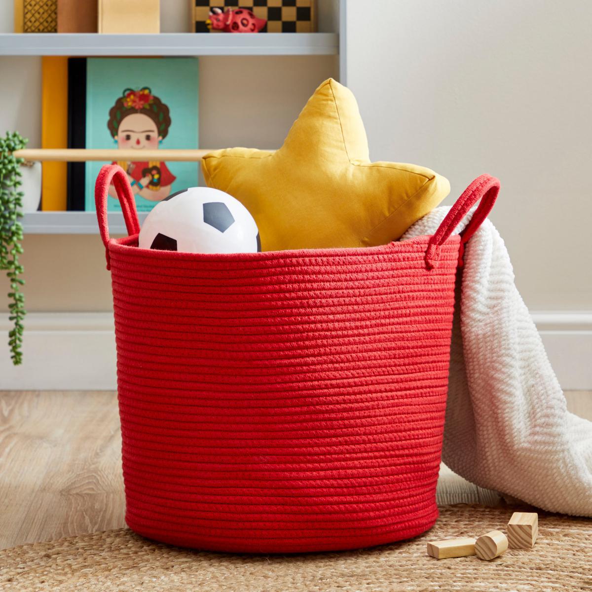 This large cotton rope basket in red is a practical and versatile addition to many interiors, especially those aiming for a contemporary or casual look. I love it for its durability and tactile texture, which adds warmth and a tactile element to a room. It works well in playrooms or children’s bedrooms, where it can neatly contain toys and soft furnishings, or in living areas for organising throws, magazines, or even laundry. To style it effectively, pair it with neutral or complementary colours to let the vibrant red pop, and consider placing it in a corner or against a plain backdrop to avoid visual clutter. Its sturdy handles make it easy to move around, making it both functional and stylish for everyday use.