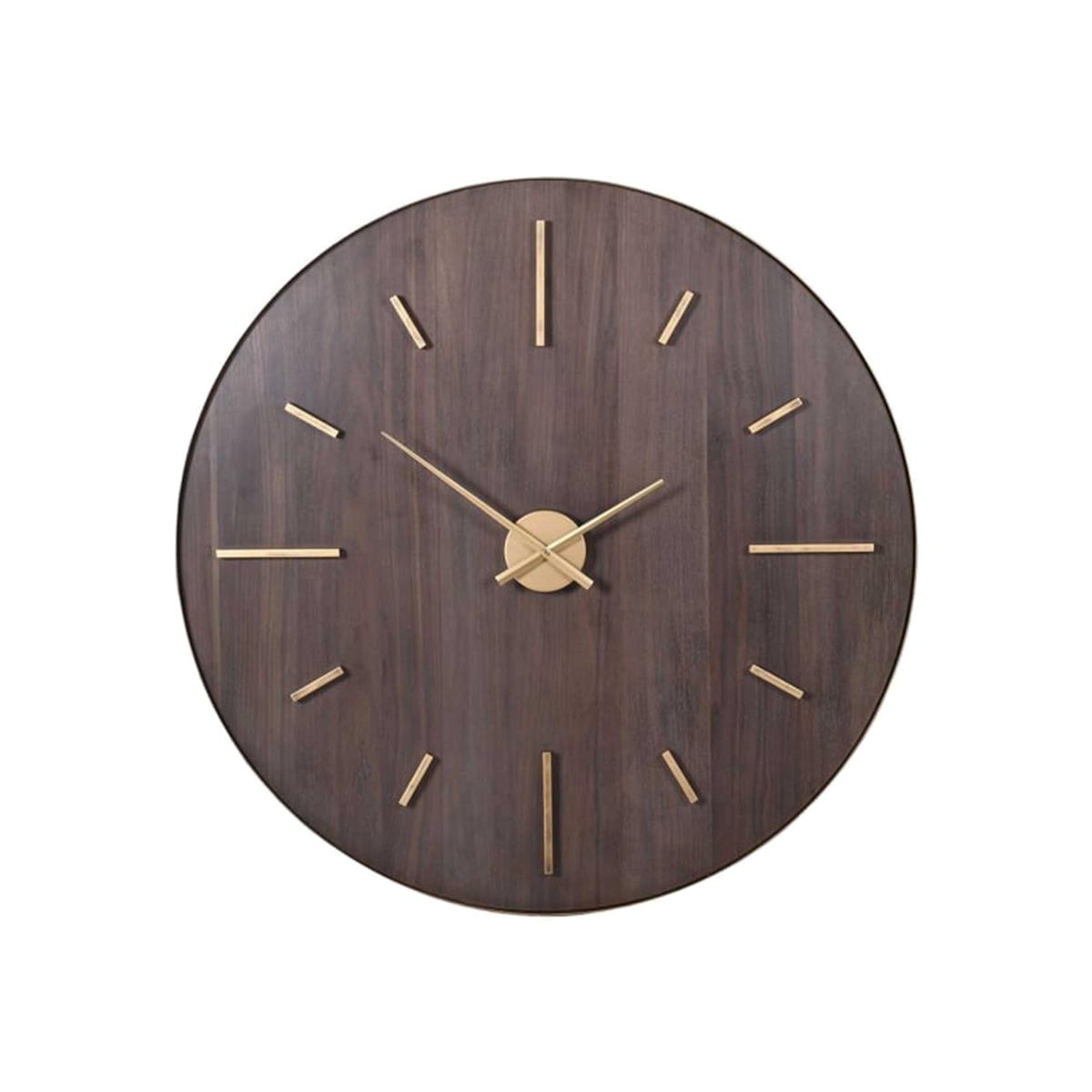 Elevate your interior with the Large Dark Wood and Gold Clock, a perfect harmony of modern style and classic warmth. Its deep, rich wood face is accented by refined gold hands and hour markers, creating a striking yet understated focal point. The minimalist, number-free design exudes sophistication, making it an ideal addition to contemporary, rustic, or mid-century-inspired spaces.