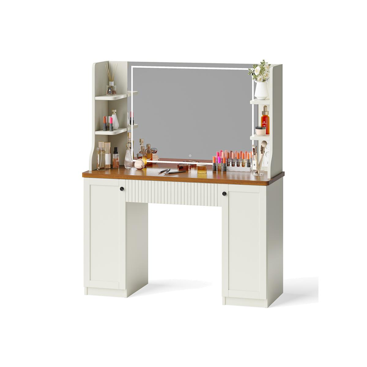 With 4 tabletop shelves, 1 large drawer and 2 doors ( each door has 3 tiers of storage shelves ), our dressing tables offer ample storage space for all your cosmetics, jewellery, books, photos, decorations, mini blow dryer etc. with large LED mirror, touch sense switch, 3 adjustable light colours: cold white, warm white and warm yellow. Our dressing table is equipped with AC and USB sockets, convenient for you to use a hair dryer and charge your phone. Suitable for the dressing room, bedroom, salon, live broadcast etc.