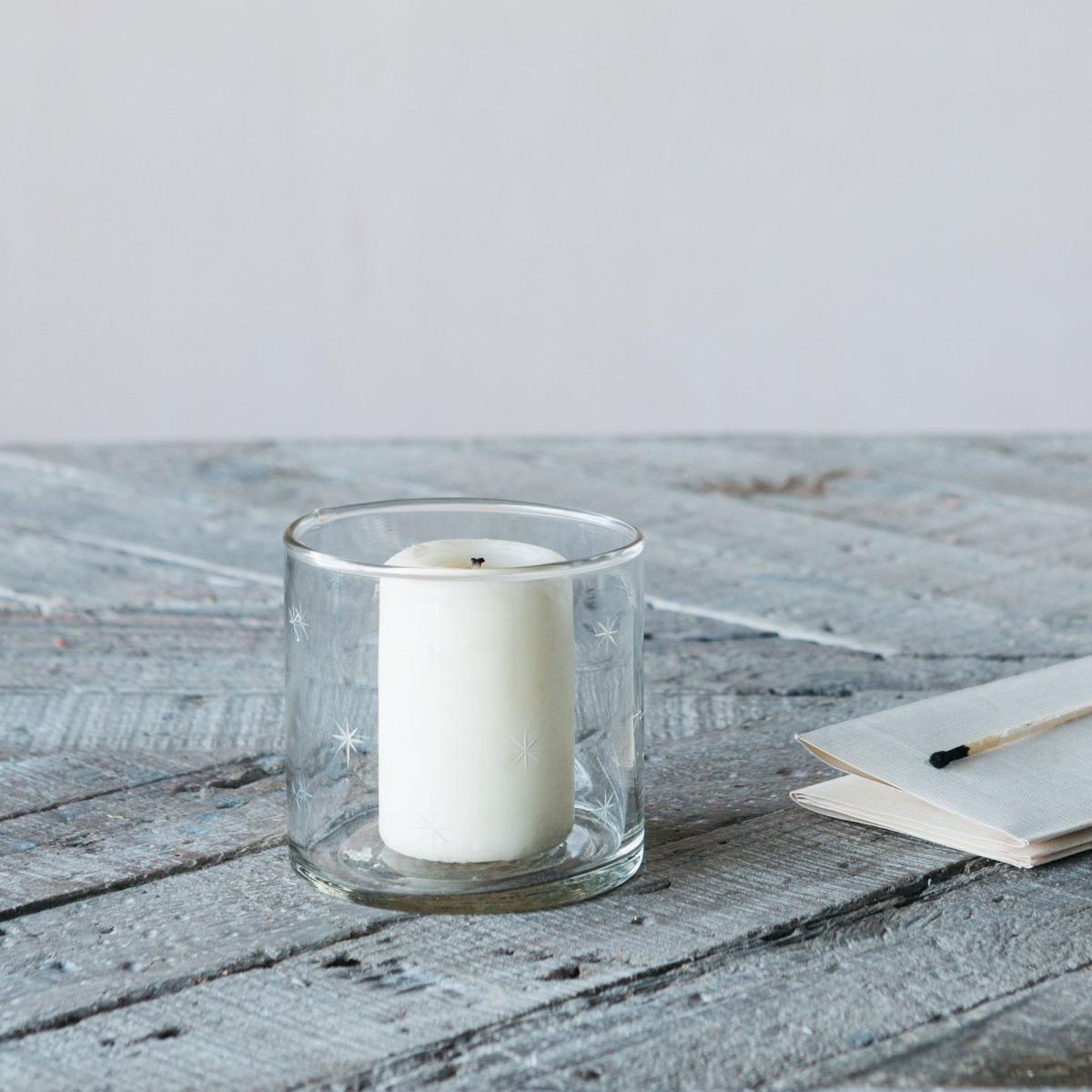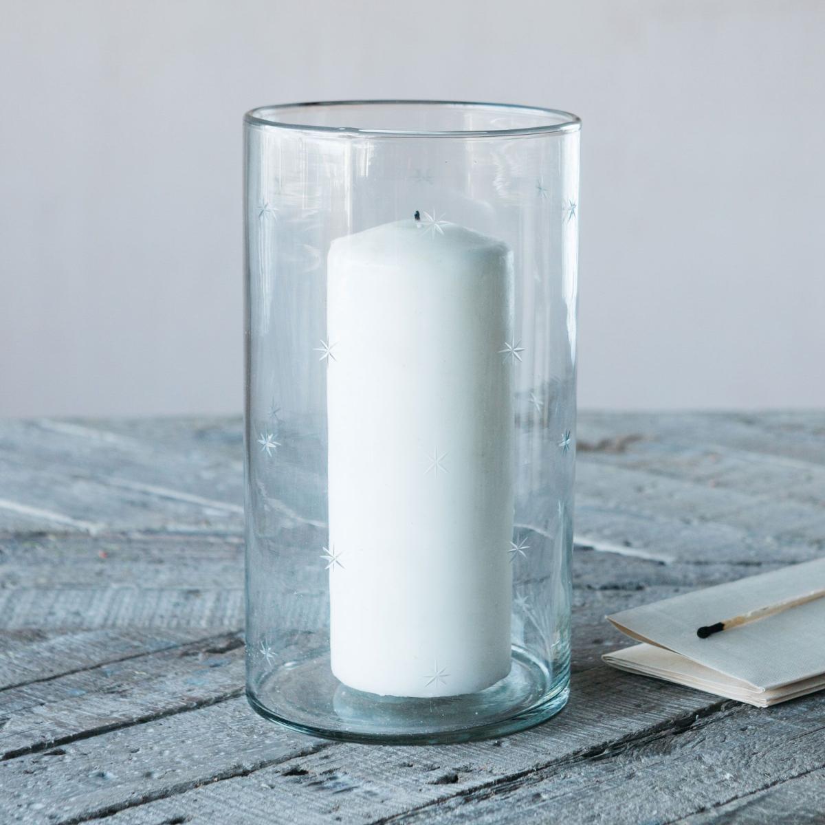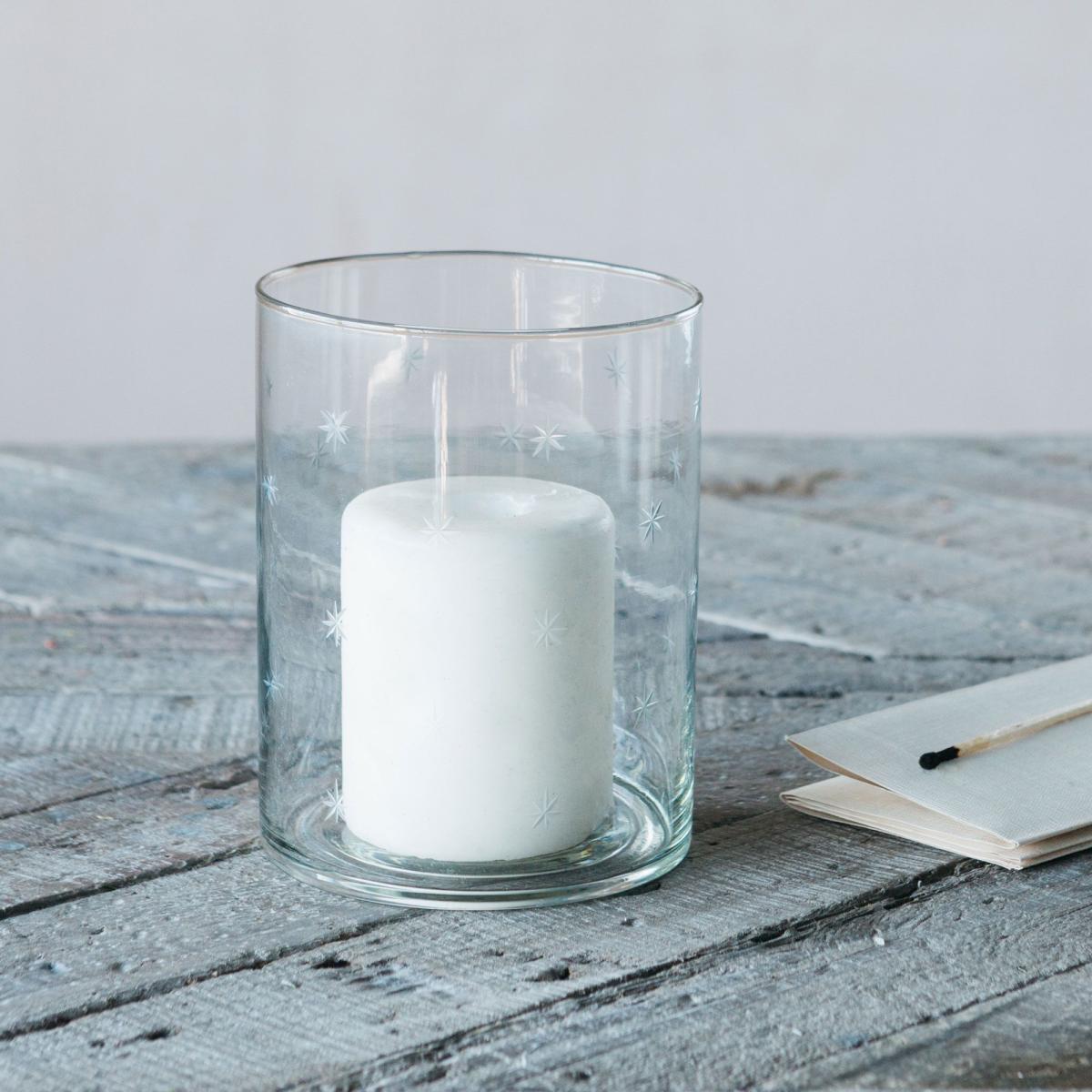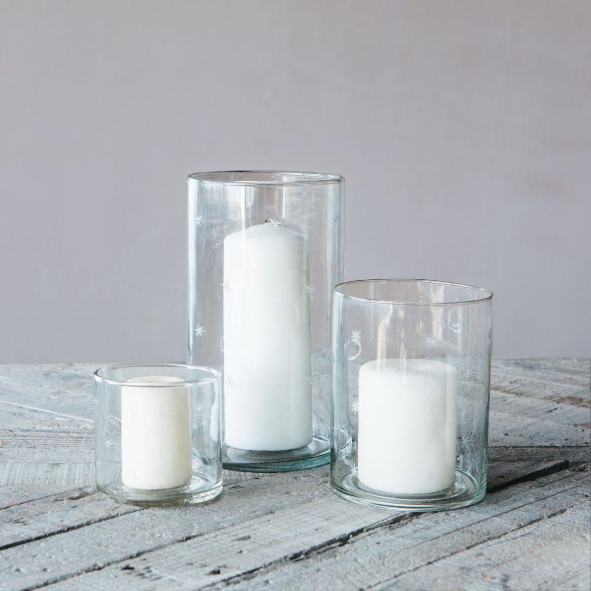 For winter evenings spent star gazing at home, fill these glass hurricane lanterns with candles to illuminate the delicately etched stars. Available in three sizes.