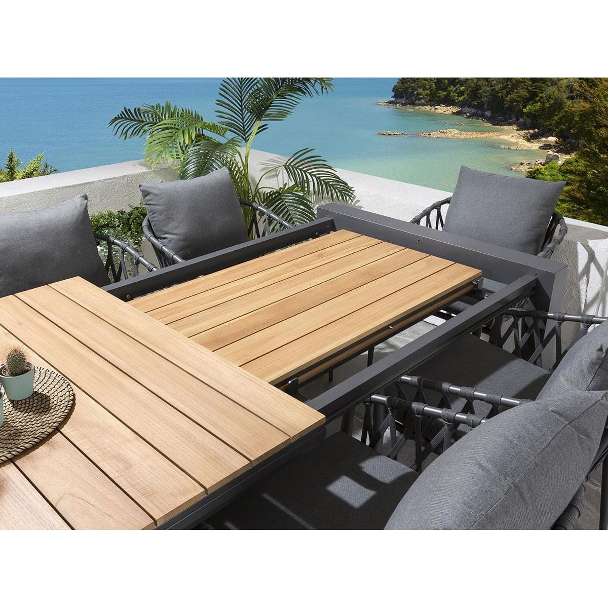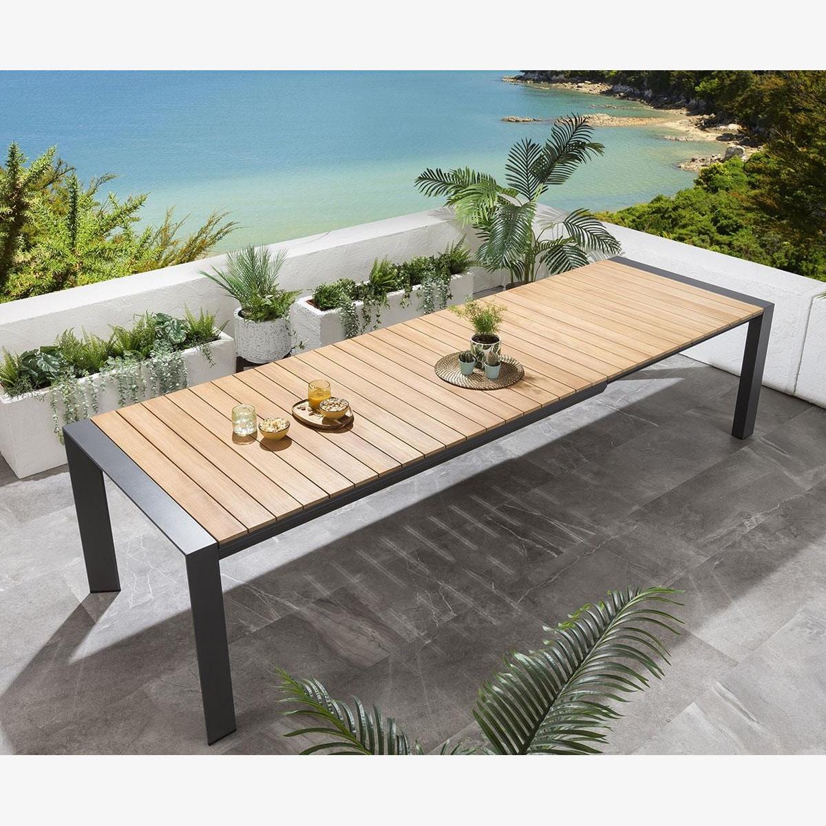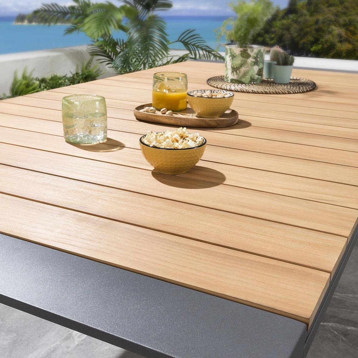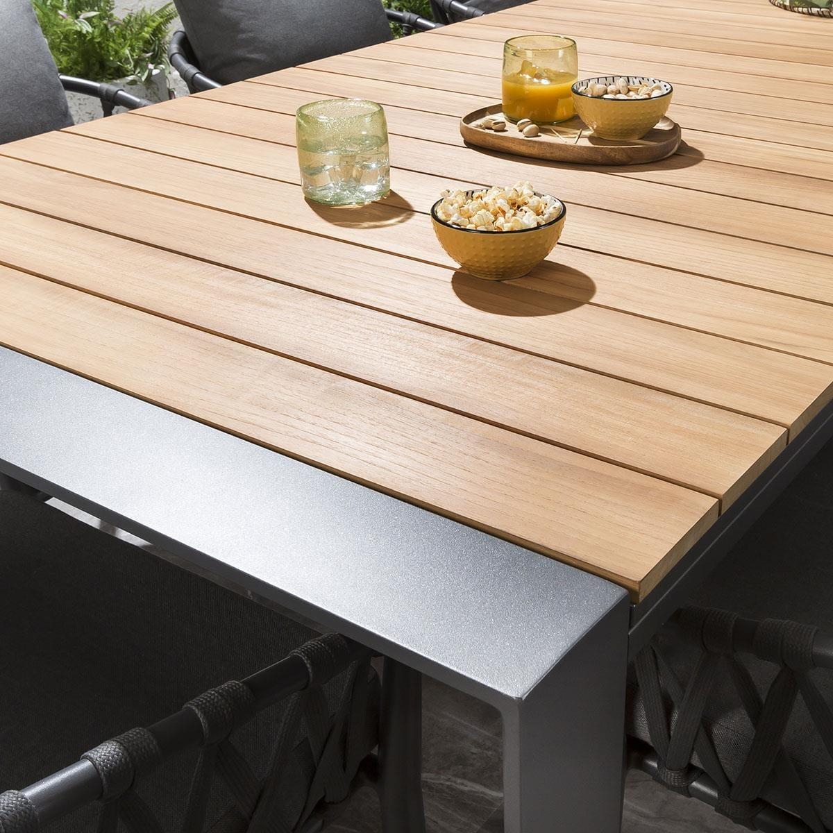 The Samos 6-10 Seater Extendable Garden Dining Table is a modern aluminium table with a Teak Natural Wood Colour top. Expertly crafted with an on-trend, industrial design, the table combines the natural warmth of teak wood with the bold statement of brushed aluminium, to enhance the look of any modern outdoor seating area. The Samos garden table is expandable with stow-away extension leaves, extending from 2 metres to 2.6 metres, then to a huge 3.2 metres. Extending the table is easy, simply pull out the extending size to reveal the two concealed extension leaves.