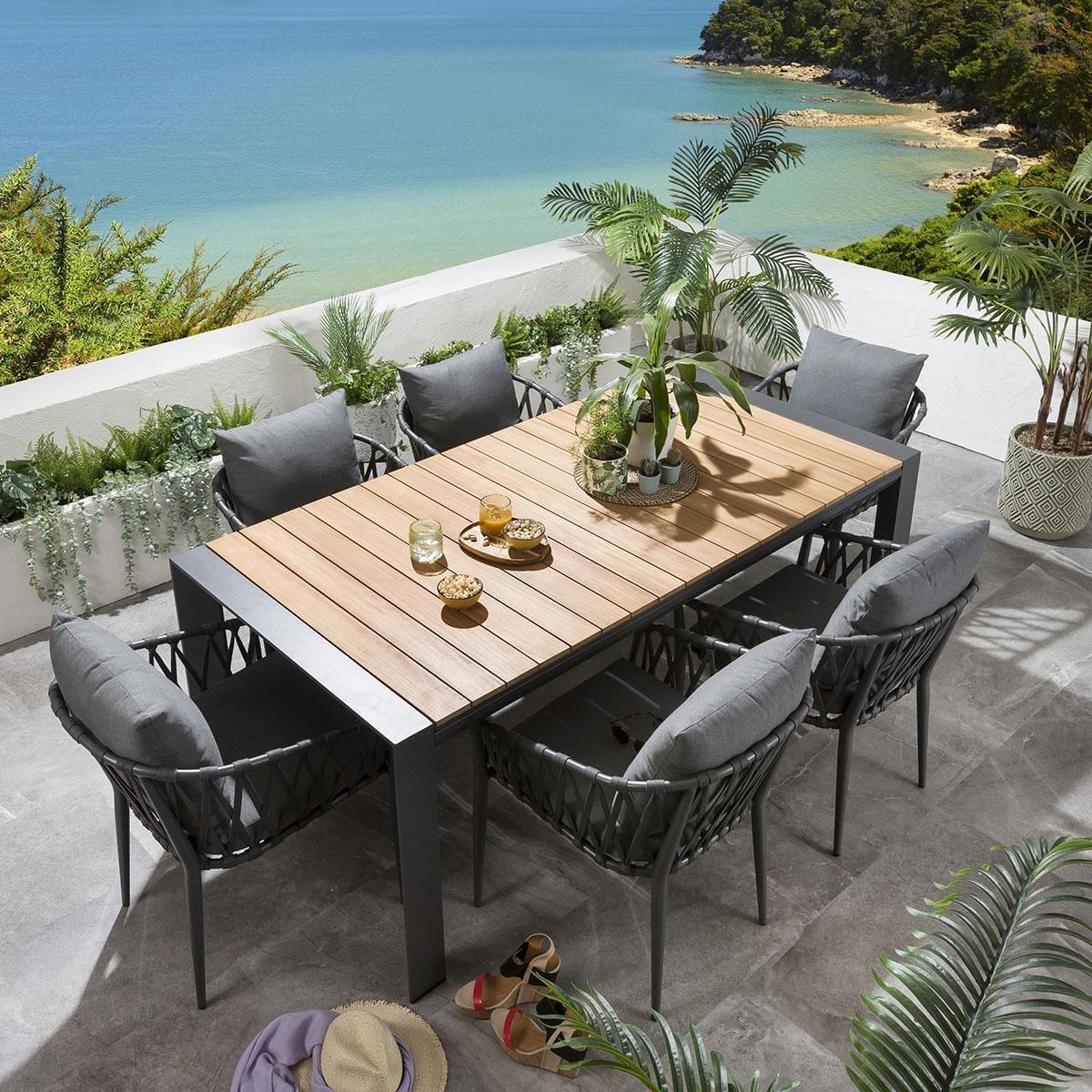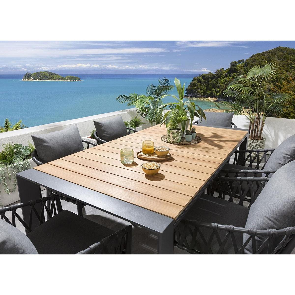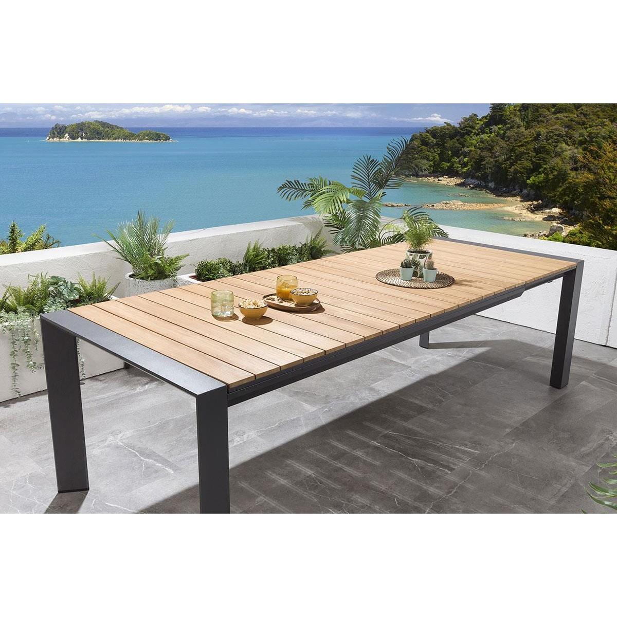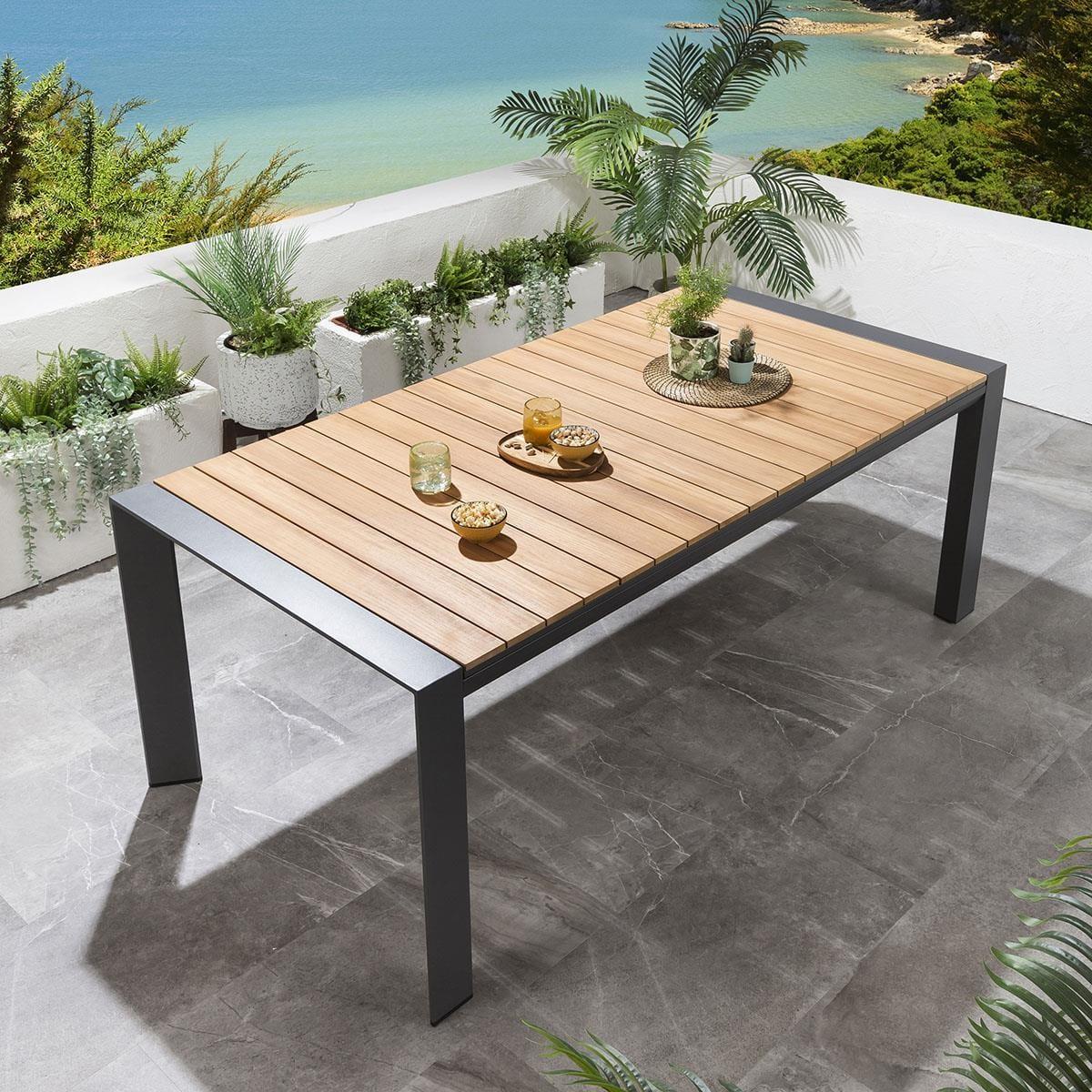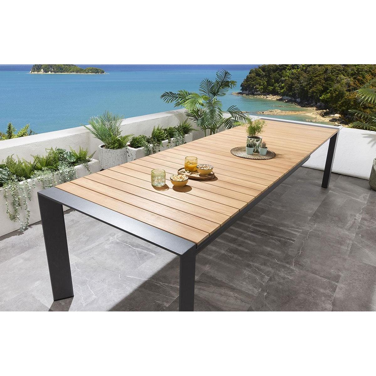 The Samos 6-10 Seater Extendable Garden Dining Table is a modern aluminium table with a Teak Natural Wood Colour top. Expertly crafted with an on-trend, industrial design, the table combines the natural warmth of teak wood with the bold statement of brushed aluminium, to enhance the look of any modern outdoor seating area. The Samos garden table is expandable with stow-away extension leaves, extending from 2 metres to 2.6 metres, then to a huge 3.2 metres. Extending the table is easy, simply pull out the extending size to reveal the two concealed extension leaves.