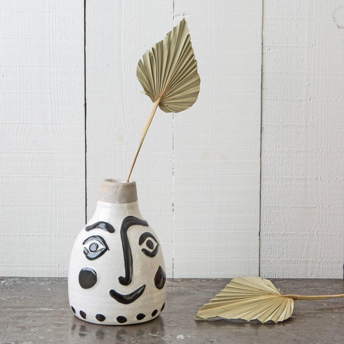 Our quirky stoneware vases feature an off white crackle glaze finish with a raised painted face and a textured stone rim. Available in small and large with different facial features, these handy pots can be used for storing anything, from pencils and pens to faux flowers and stems.