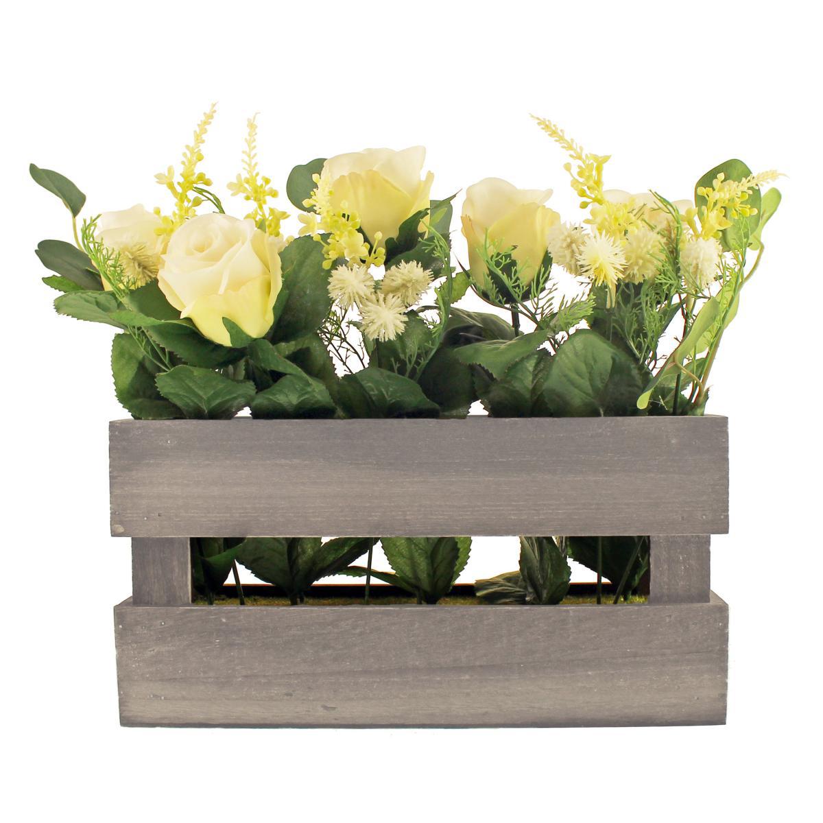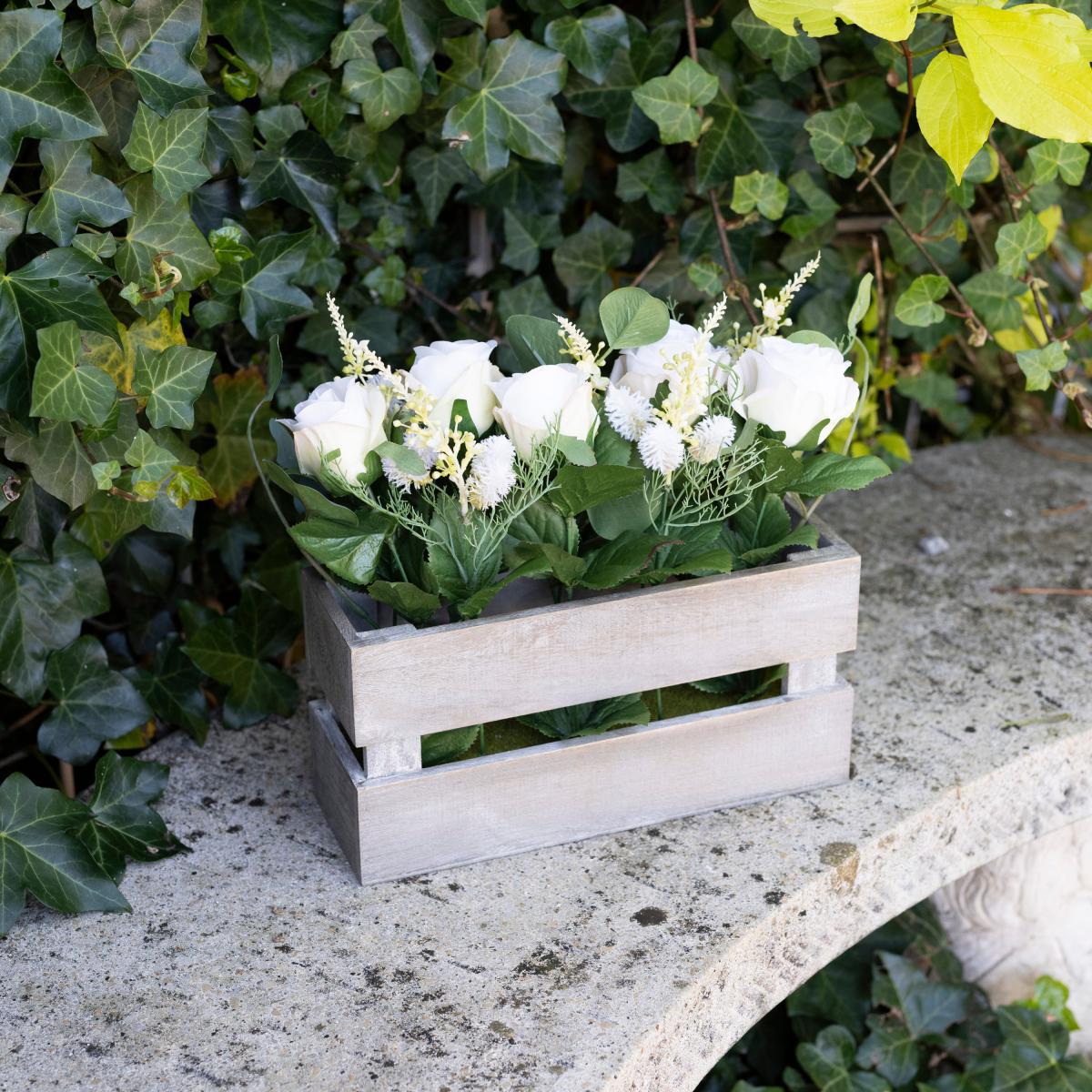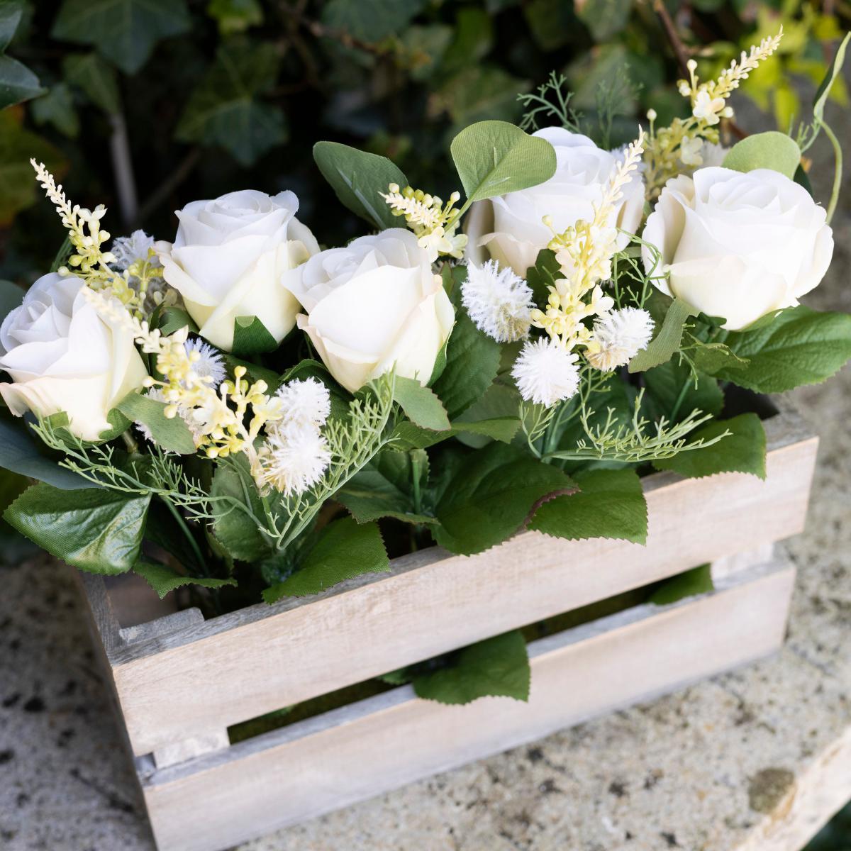 Featuring beautiful cream roses, this traditional floral arrangement in rustic wooden crate is ideal for wedding table centrepieces or room décor. Requiring no maintenance, this crate has a stunning colourway and a range of co-ordinating traditional traditional wedding florals are also available.