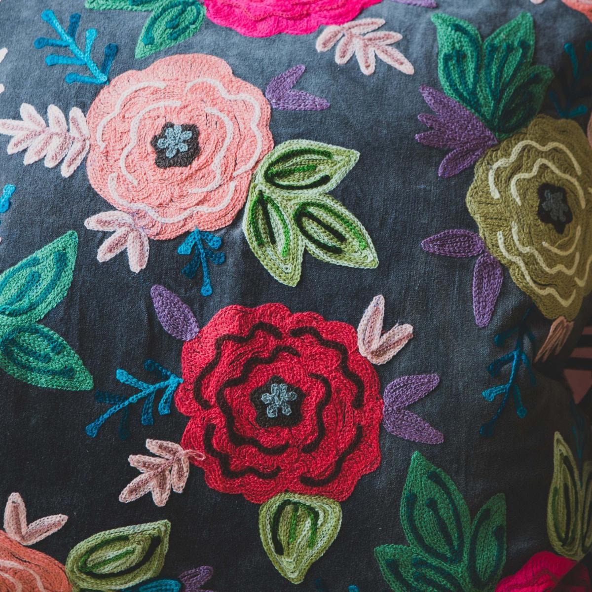 A square velvet cushion covered with Mexicana-inspired embroidery and a small white pom pom trim, creating texture and vibrancy.