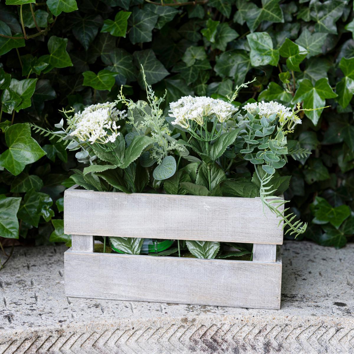 Featuring eucalyptus, fern, and Queen Anne's lace, this traditional floral arrangement in rustic wooden crate is ideal for wedding table centrepieces or room décor. Requiring no maintenance, this crate has a stunning colourway and a range of co-ordinating traditional traditional wedding florals are also available.
