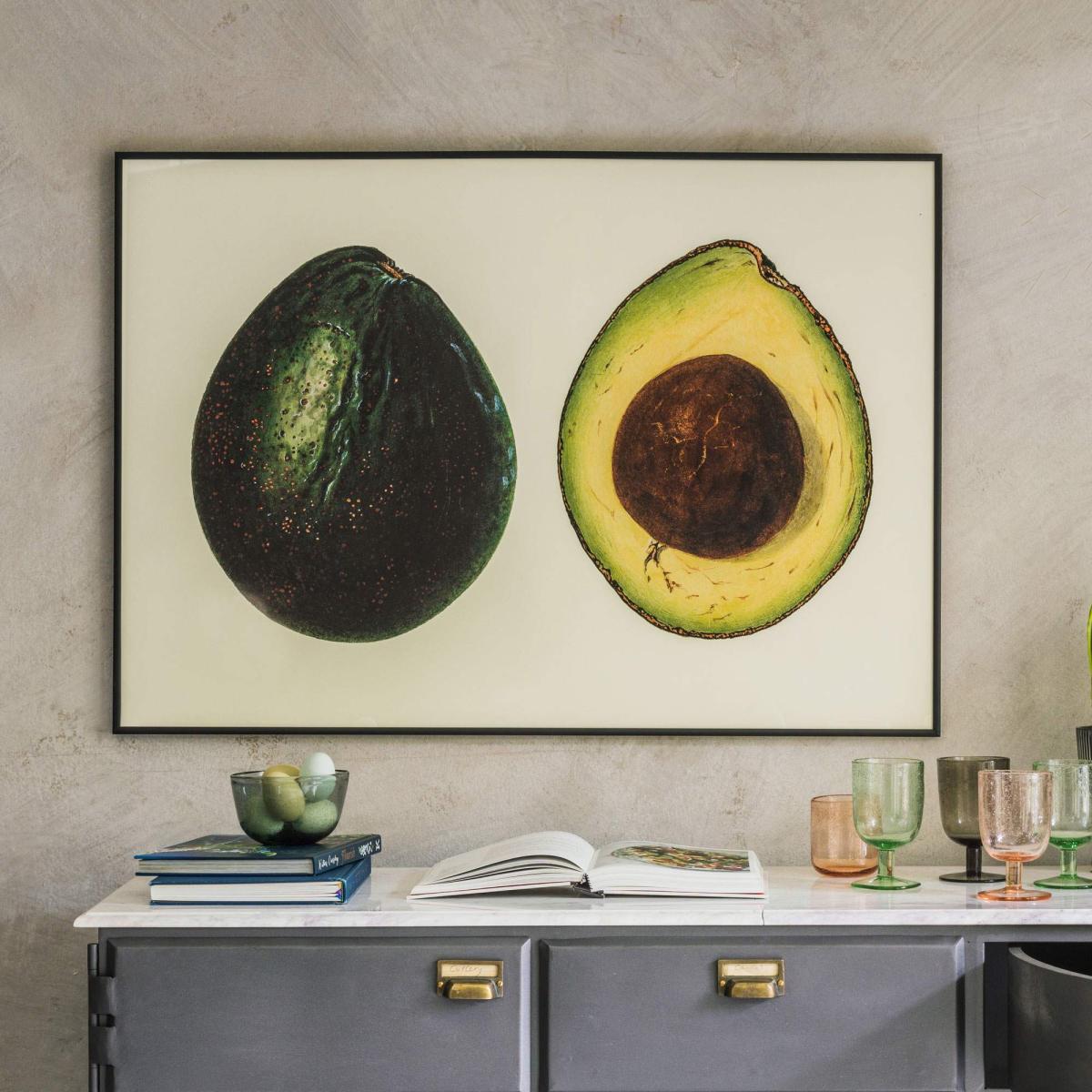 A vintage-style framed print displaying a colourful illustration of an avocado, a perfect way to add life to a kitchen wall. H70 x W100cm. Includes black metal frame. Features a single fixture.