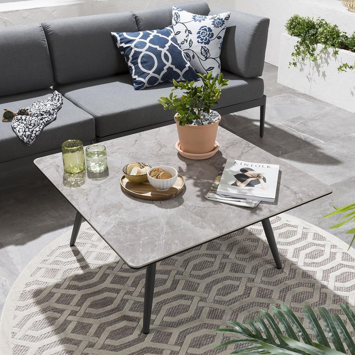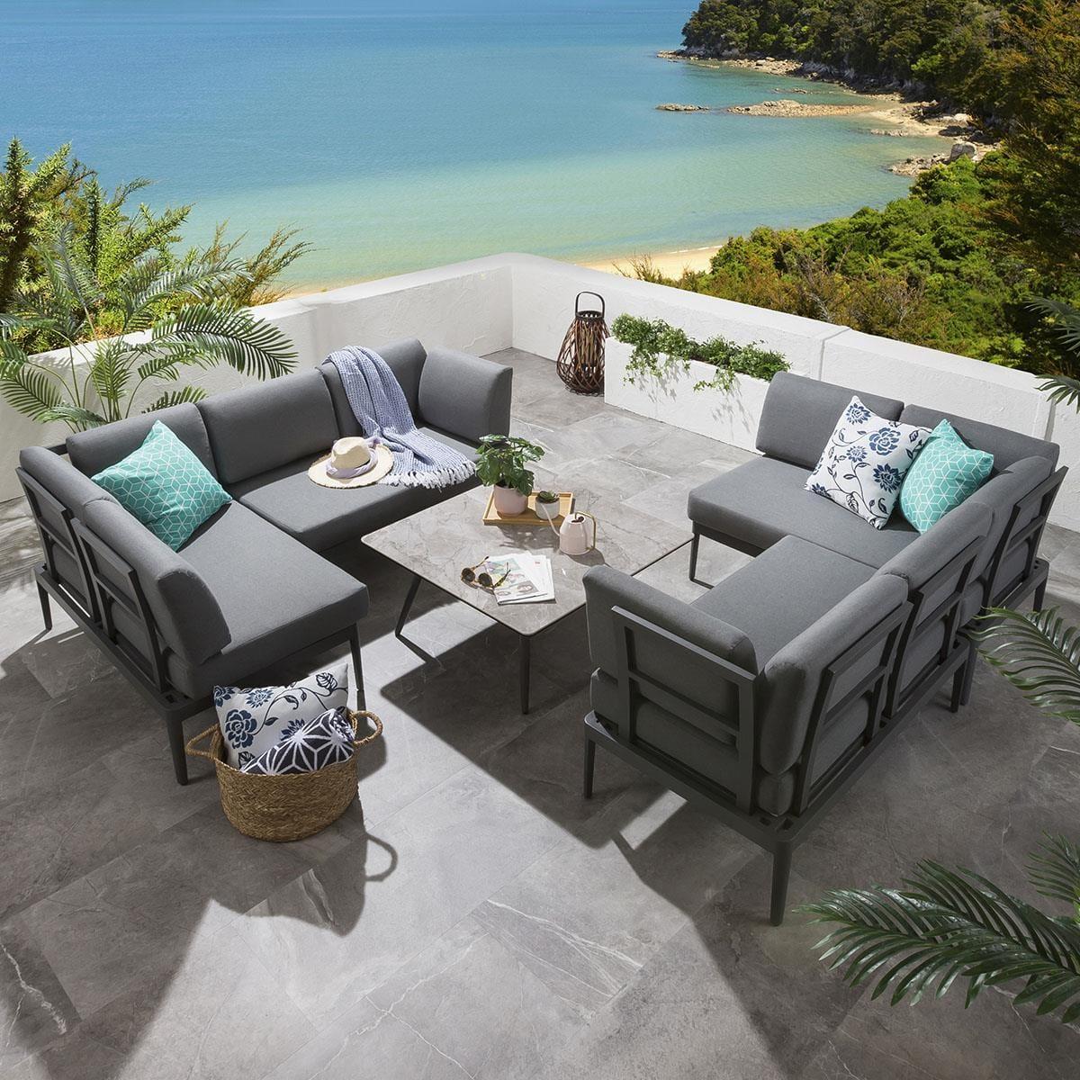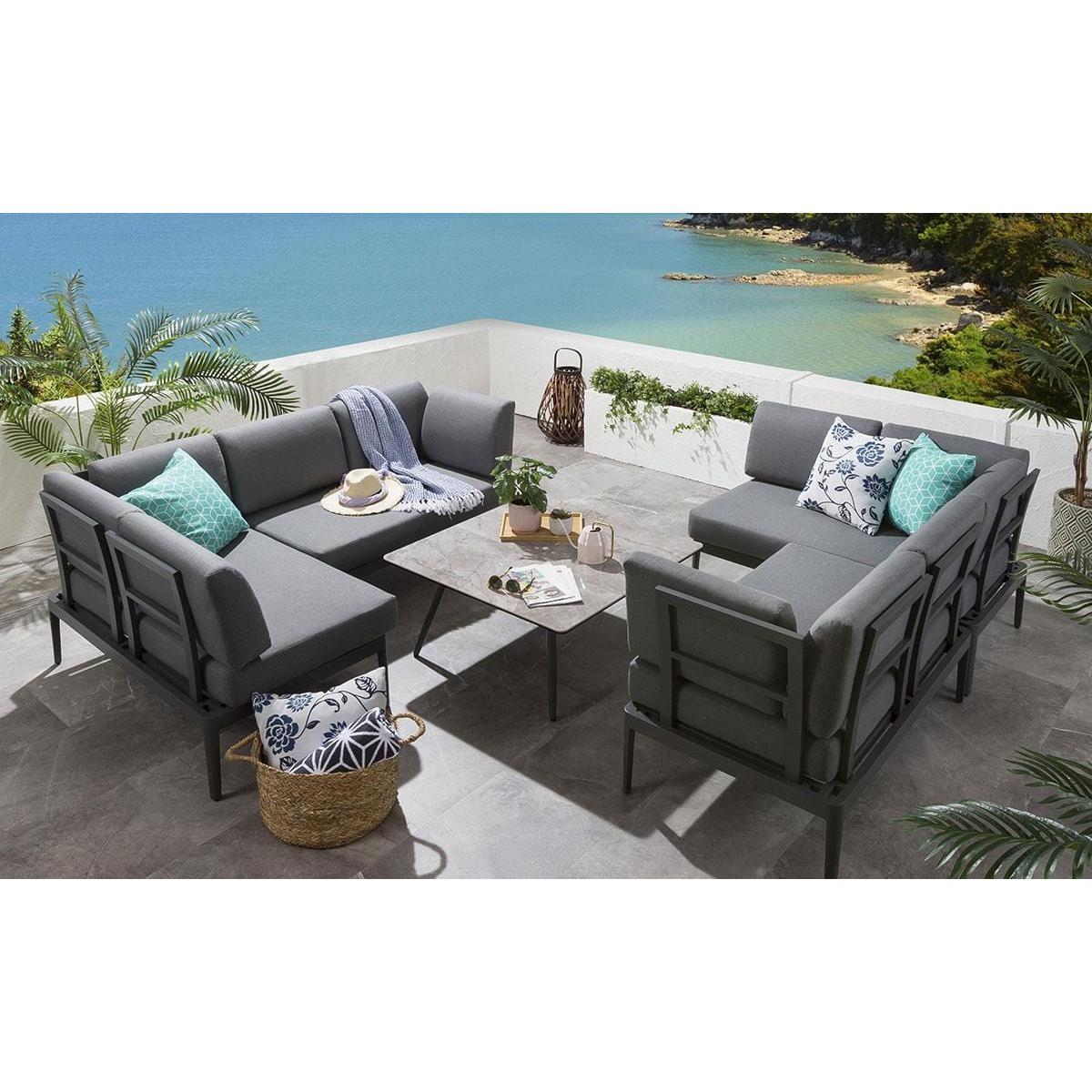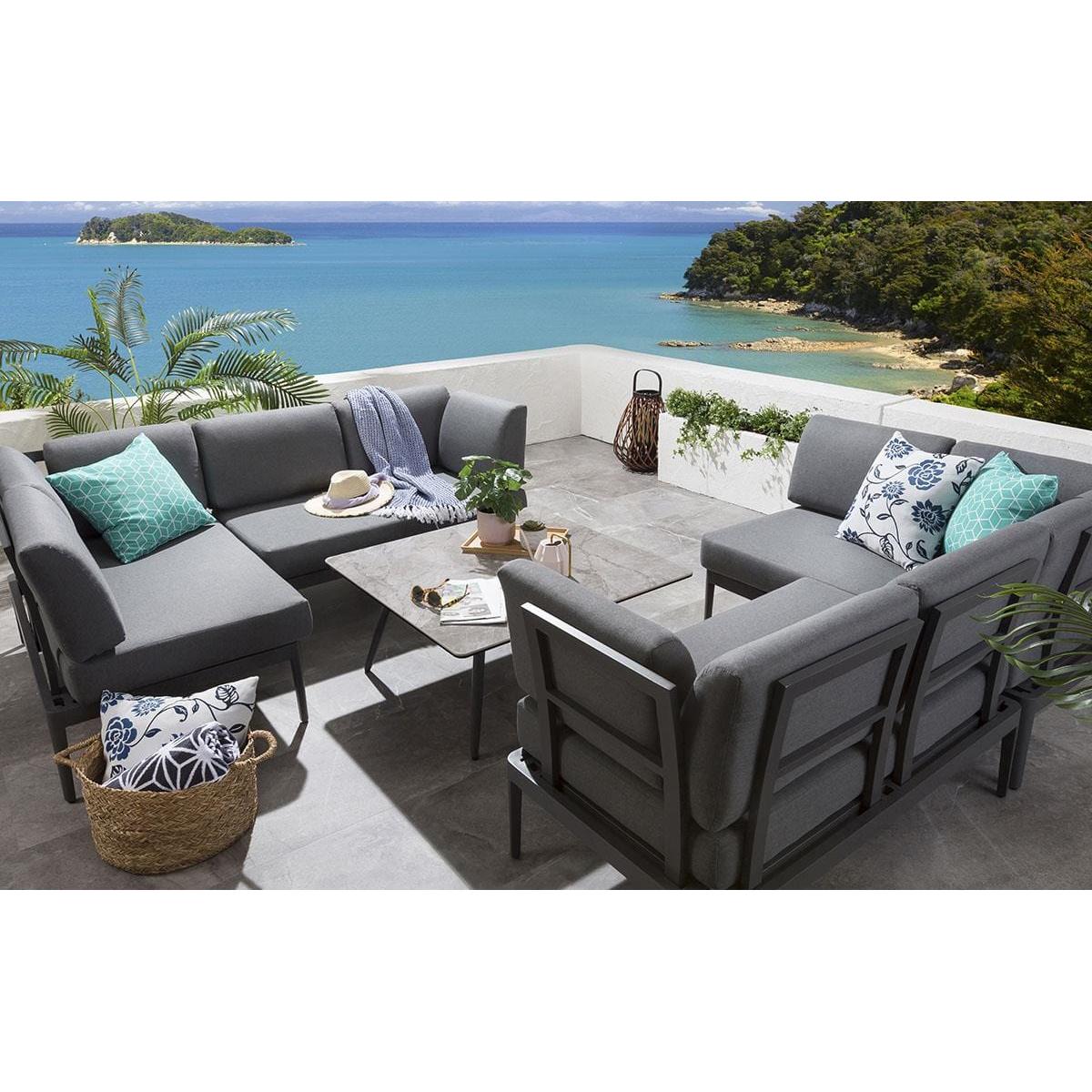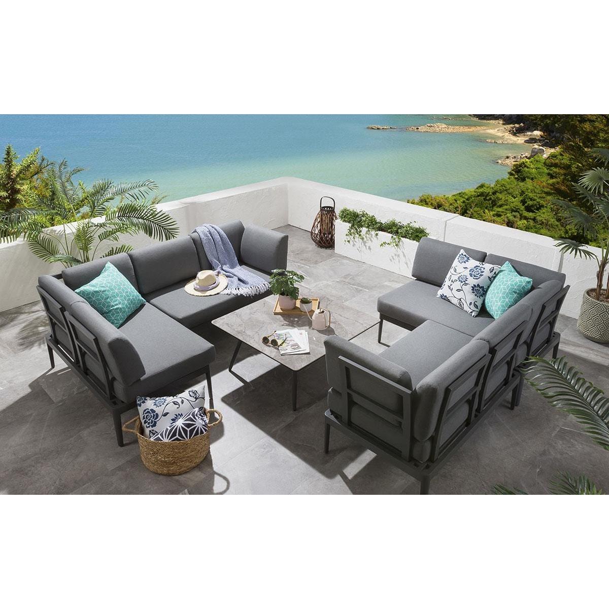 It's the perfect compact grey garden sofa for smaller gardens - including four simple sections that come together to form a luxury 8 seater garden sofa that can be configured in a straight, left or right-hand layout depending on your space. This set also comes with a ceramic coffee table. Our clever Ada Modular Corner Sofa will make a stunning addition to your outdoor seating area or patio. The small garden corner sofa comes complete with our signature luxuriously thick cushioning that offers unbeatable comfort, topped off with rich Beige high-end marine fabric which has amazing resilience to colour fading and damage caused by extreme weather conditions and also a free winter cover. Expertly crafted aluminium frames are highly durable, complemented by clean lines that lend contemporary style. It is robust and weather-resistant for outdoor use & the firm-cushioned seating offers comfortable support that's shower-resistant, but we advise that cushions are stored when not in use. If you need more information about this product, use the Live Chat service to speak to the team or send us a message. Spread the cost our with interest-free finance options. Minimum spend applies. W300cm D300cm H81cm 8-Seater Grey Garden Corner Sofa Set - Modular Design For Your Outdoor Space Set includes 4 reversible sofa sections and a coffee table