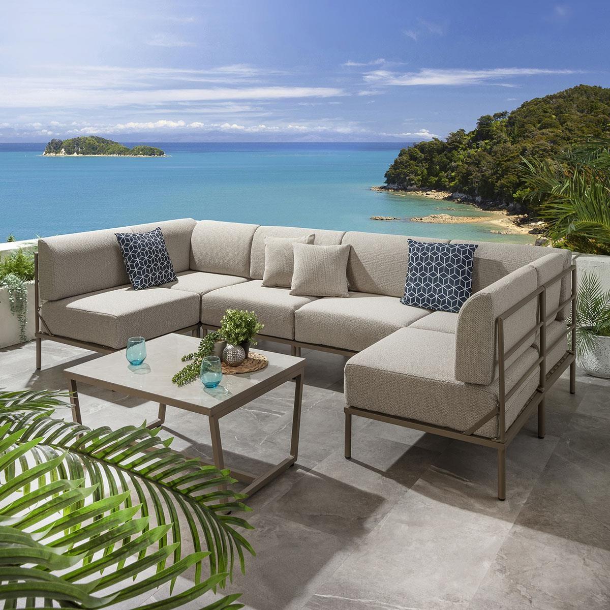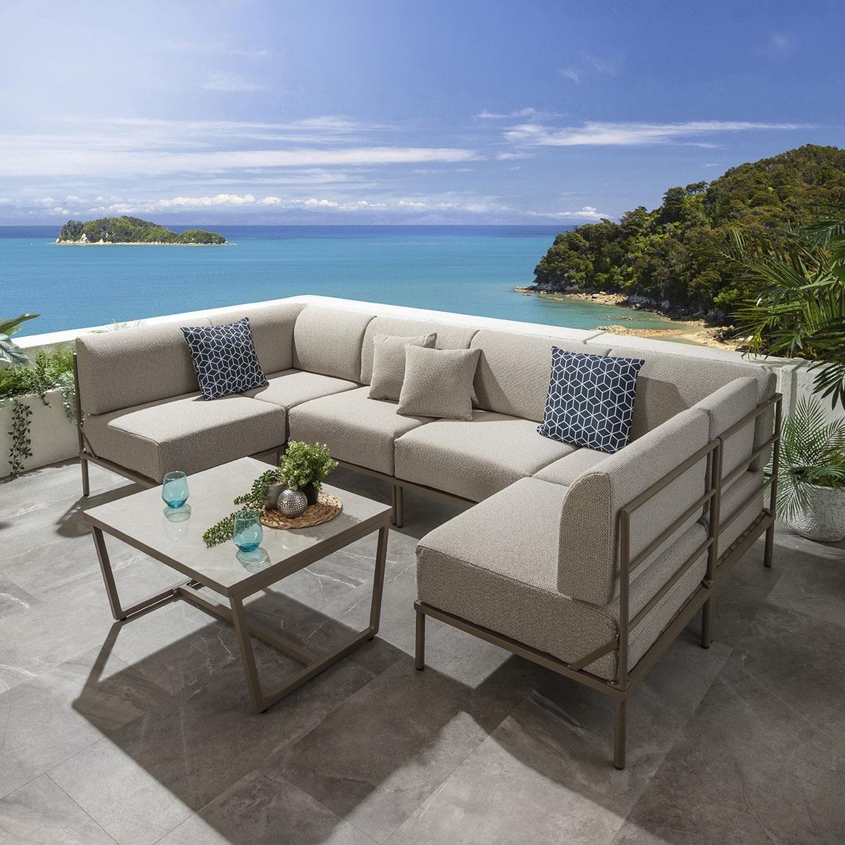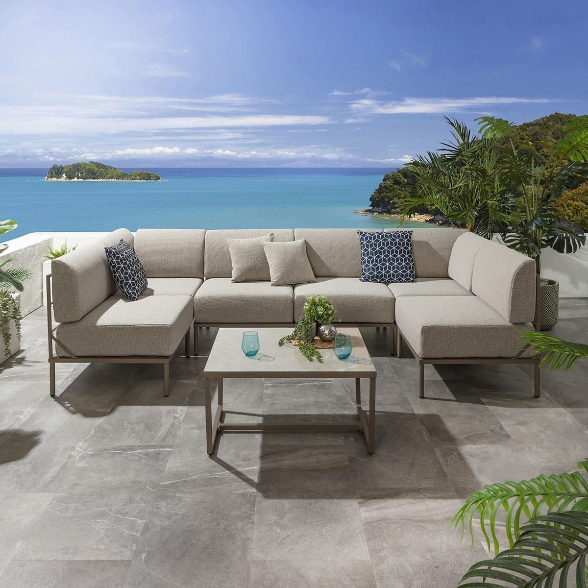 Experience the versatility of the Alfie outdoor modular U-shape corner sofa set, made of seven pieces, it's a 288cm x 144cm modern U shape garden sofa with a coordinating coffee table. Crafted with weather-resistant aluminium frames in an elegant beige finish and super-thick cushions, covered in premium cream fabric. The clever modular design is based on two key modules a corner and a middle section, effortlessly connected using provided clips to create a bespoke configuration at any size. The square modules, each measuring 72cm, simplify planning for your unique space, ensuring a perfect fit. The super-thick cushions, upholstered in premium latte cream fabric, provide unparalleled comfort at a convenient seat height of 44cm. Our Alfie sofa cushions feature zips for easy removal and cleaning, promoting longevity and easy maintenance. For prolonged durability, we recommend storing the cushions when the sofa is not in use. The coffee table boasts a robust marble-effect ceramic top, adding a touch of sophistication to your outdoor lounging experience. Assembling the frames is a straightforward process, requiring just a few bolts per module frame, and all the necessary tools are included. Additionally, for added convenience and an extended product life, weather protection covers can be purchased separately. W288cm D144cm H73cm 7 Piece Garden Sofa Set including Coffee Table 6 Seater Sofa