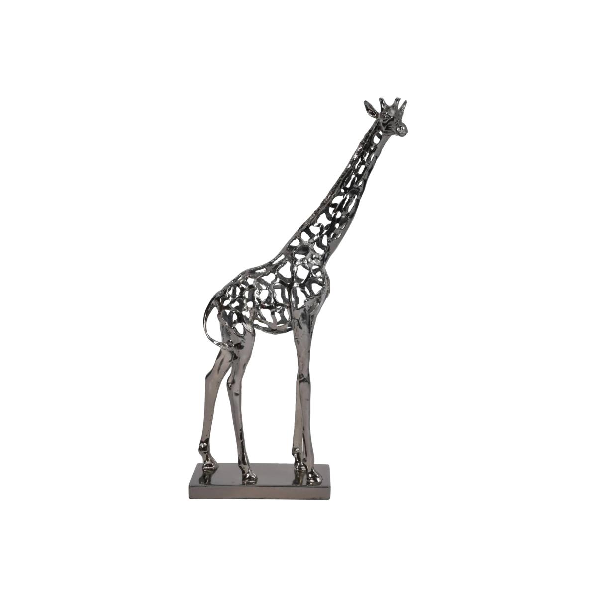A must for lovers of the natural world, this beautifully rendered antique silver giraffe sculpture will capture your heart. And at over 70 cm tall it will effortlessly take centre stage in any home. Why you'll love it This giraffe sculpture pays homage to this most beautiful of creatures. Contemporary style. At over 50 cm tall, this is an imposing piece for any room. Silver-plated strands across a hollow frame create the giraffe’s distinctive markings. Black nickel finish. This large giraffe sculpture is part of the Furniture Village accessories collection. What you need to know Made of silver-plated metal and resin. For indoor display only. Dimensions Height: 72 cm (29 in). Depth: 18 cm (8 in). Width: 38 cm (15 in).