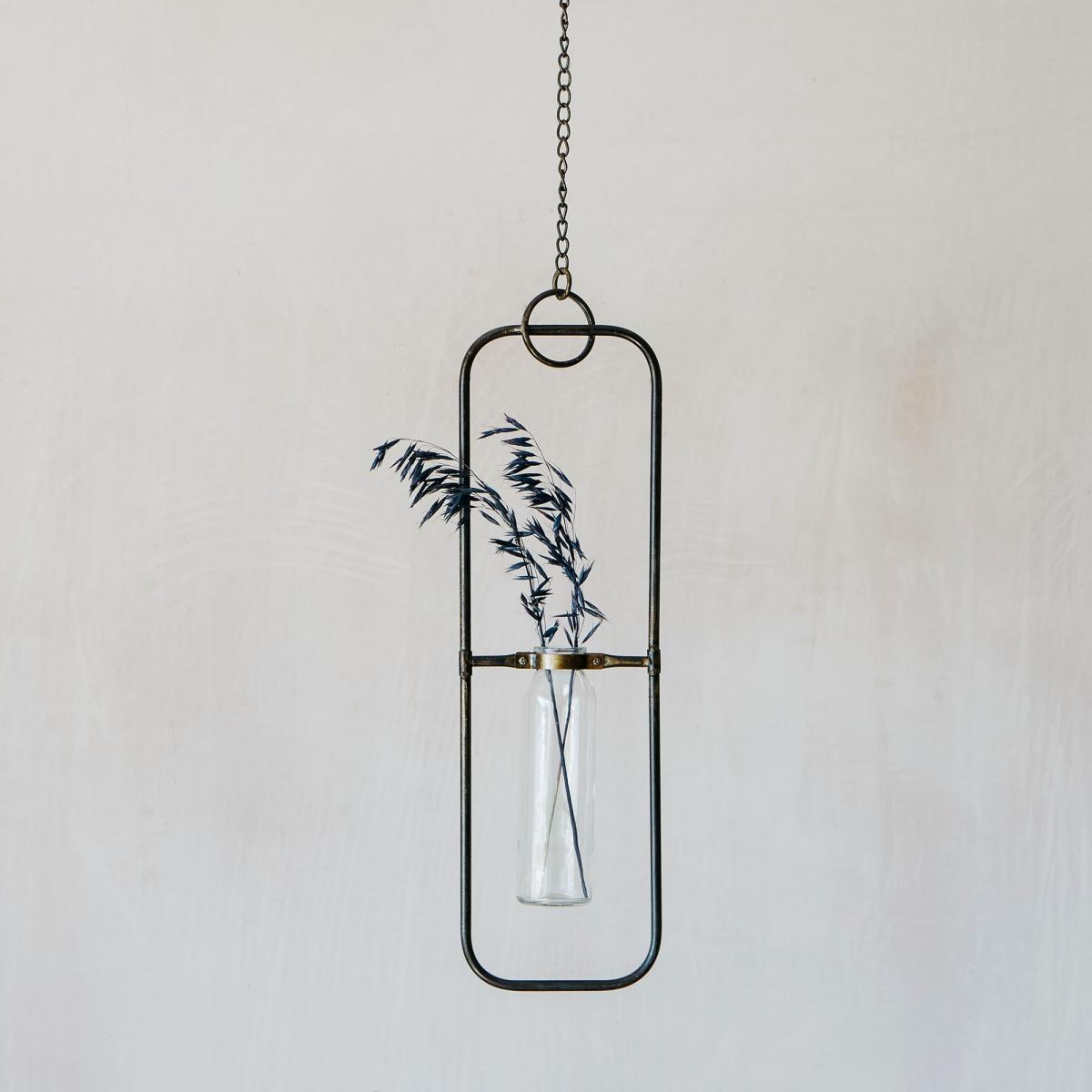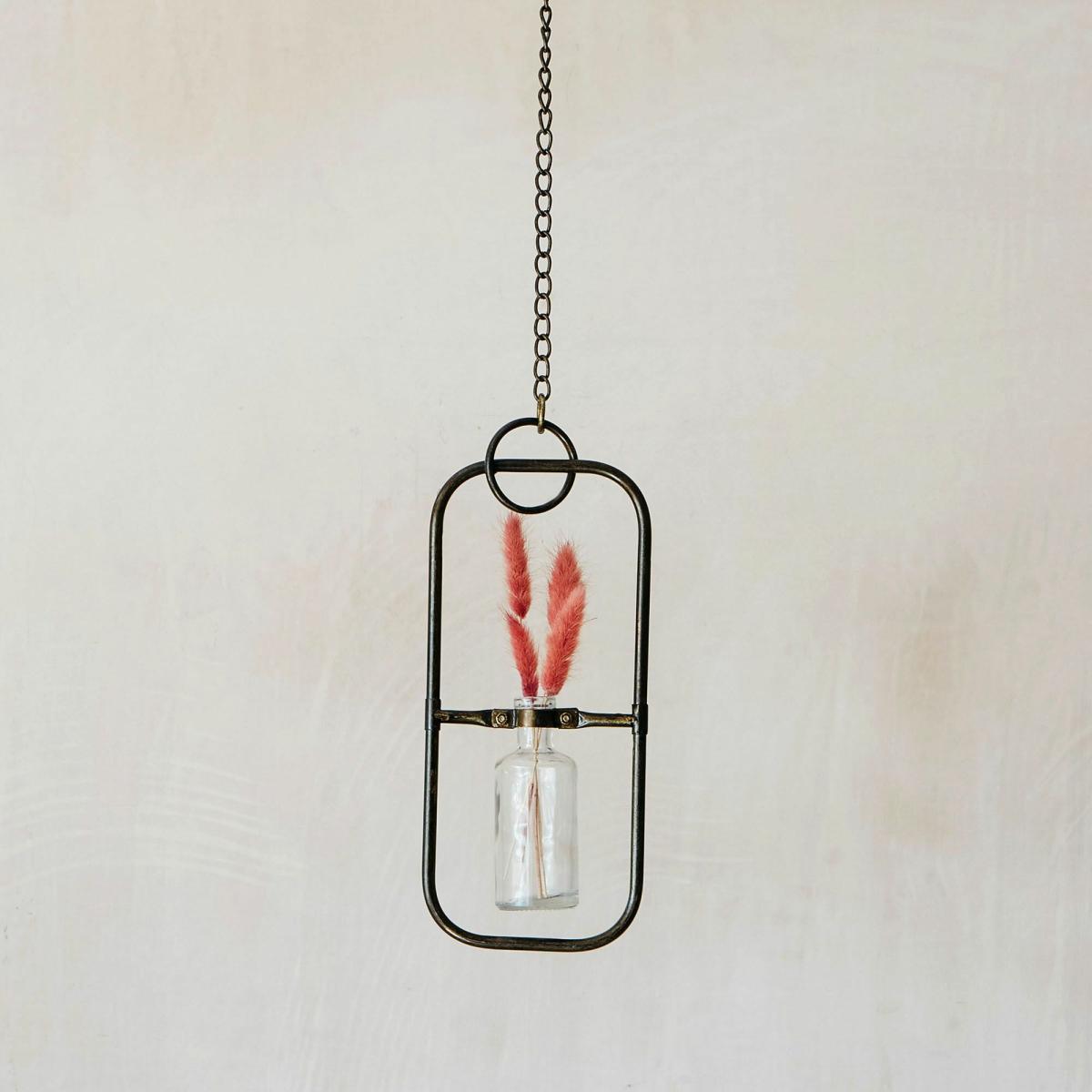 I love this hanging bud vase for its minimalist and versatile look-it adds a subtle sculptural element without overwhelming a space. It works particularly well in modern, Scandinavian, or industrial interiors thanks to its simple metal frame. Practical styling tips include pairing it with single stems or delicate foliage for a fresh, understated touch; hanging it at different heights can create visual interest, especially in a narrow hallway or above a console table. It also lends itself well to grouping with other hanging decor or placing as a focal point in a corner, making it a flexible piece for both everyday use and special occasions.