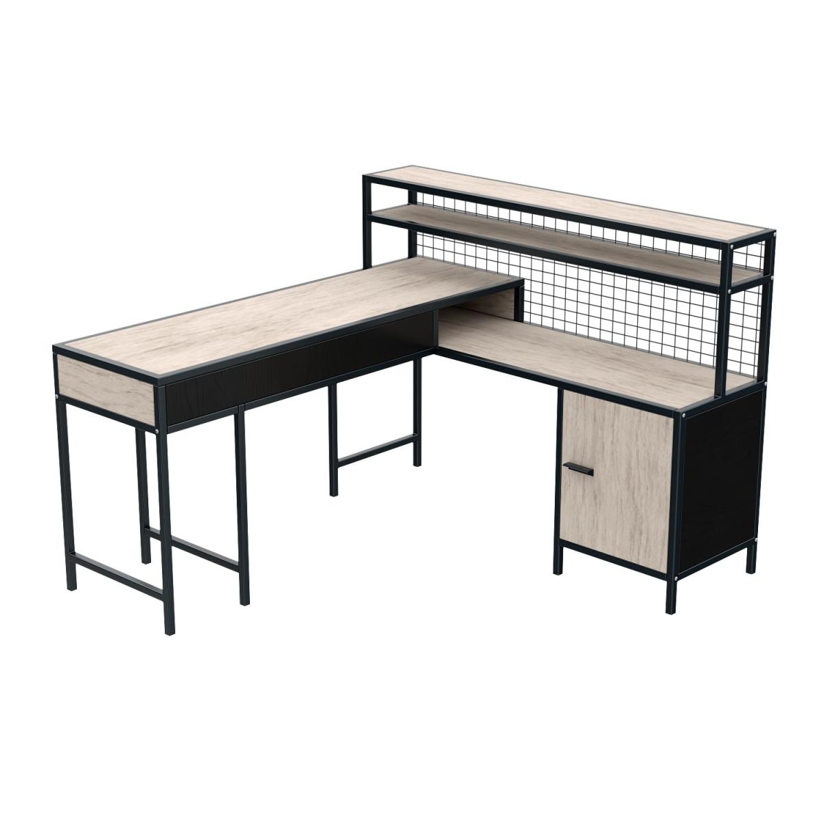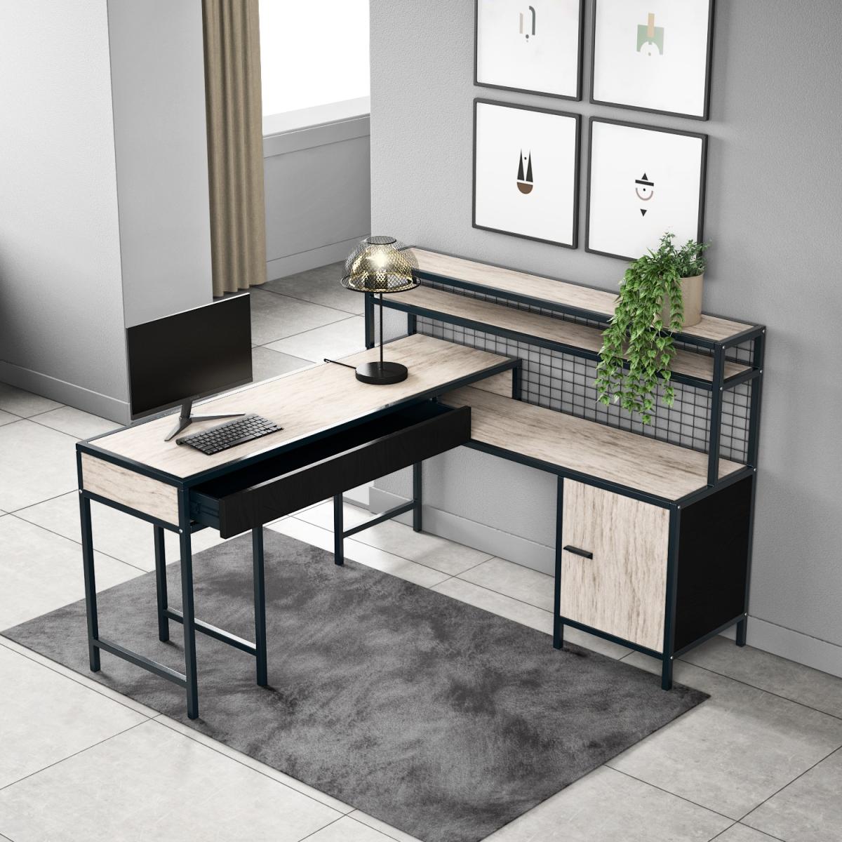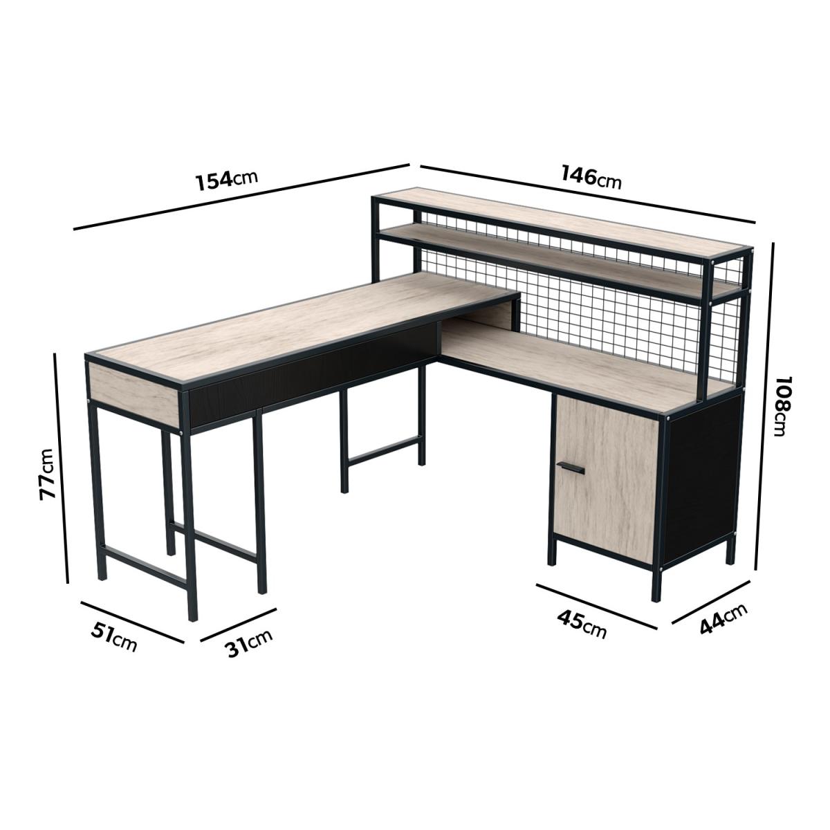 Large industrial corner desk ideal for a home office Black metal complements and contrasts the wood finish Lots of storage with a cupboard, shelves and drawer Closed cupboard helps to keep your space clutter-free Seamless design with a push to open handleless drawer Clip any notes to the metal mesh frame for a tidy desk Need to know Number of drawers: 1 Number of shelves: 2 Number of cupboards: 1 Weight: 35kg Colour: Natural with black frame Finish: Laminated board Material: MDF board and metal frame Assembly required: Yes