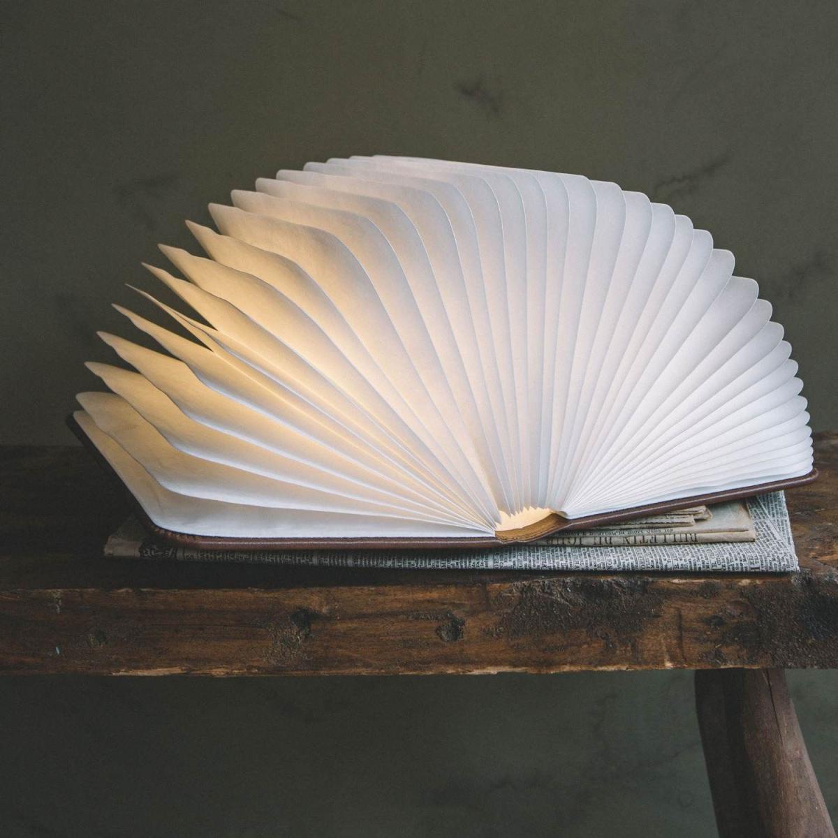 A unique gift idea for avid readers, these book lights feature a luxurious leather cover and white Tyvek pages emulating the appearance of a vintage novel. When closed, these books masquerade as a simple notebook, but open to form an intriguing table light.