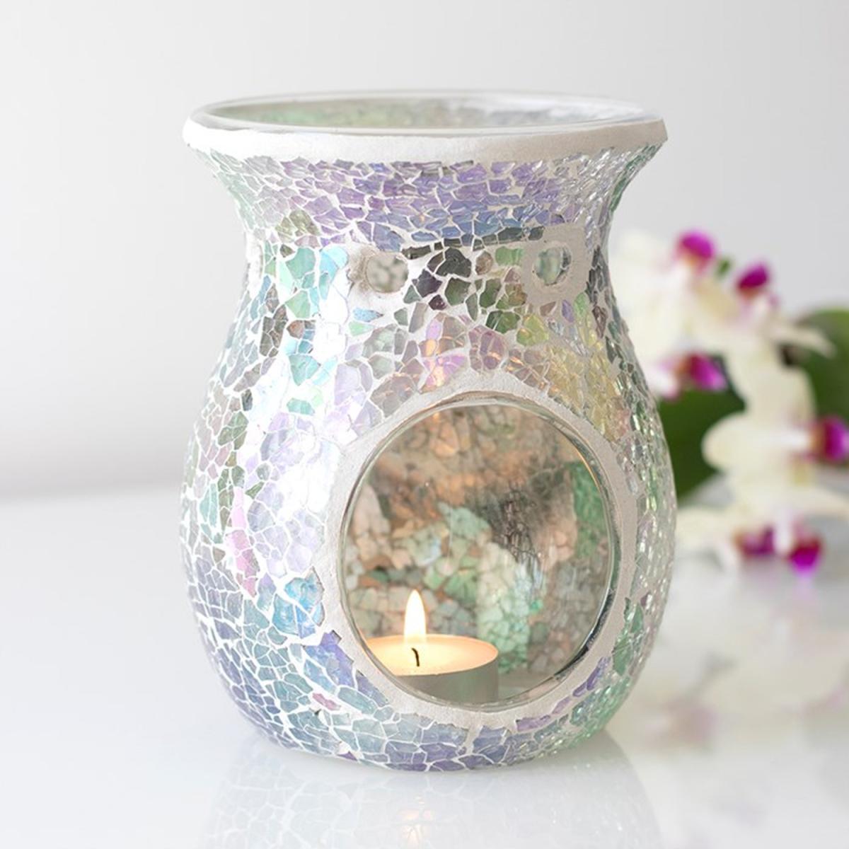 Elevate your aromatherapy experience with our Large Light Iridescent Crackle Oil Burner. This exquisite piece features a mesmerizing iridescent light blue mirrored crackle effect that shimmers elegantly. Its substantial size ensures an extended aromatic journey, accompanied by the option to use it as a wax melt burner. Create a tranquil atmosphere in your space, where the soothing scents and radiant aesthetics merge harmoniously. Immerse yourself in the captivating play of colors and fragrances, as our Large Light Iridescent Crackle Oil Burner brings a touch of shimmering serenity to your surroundings.