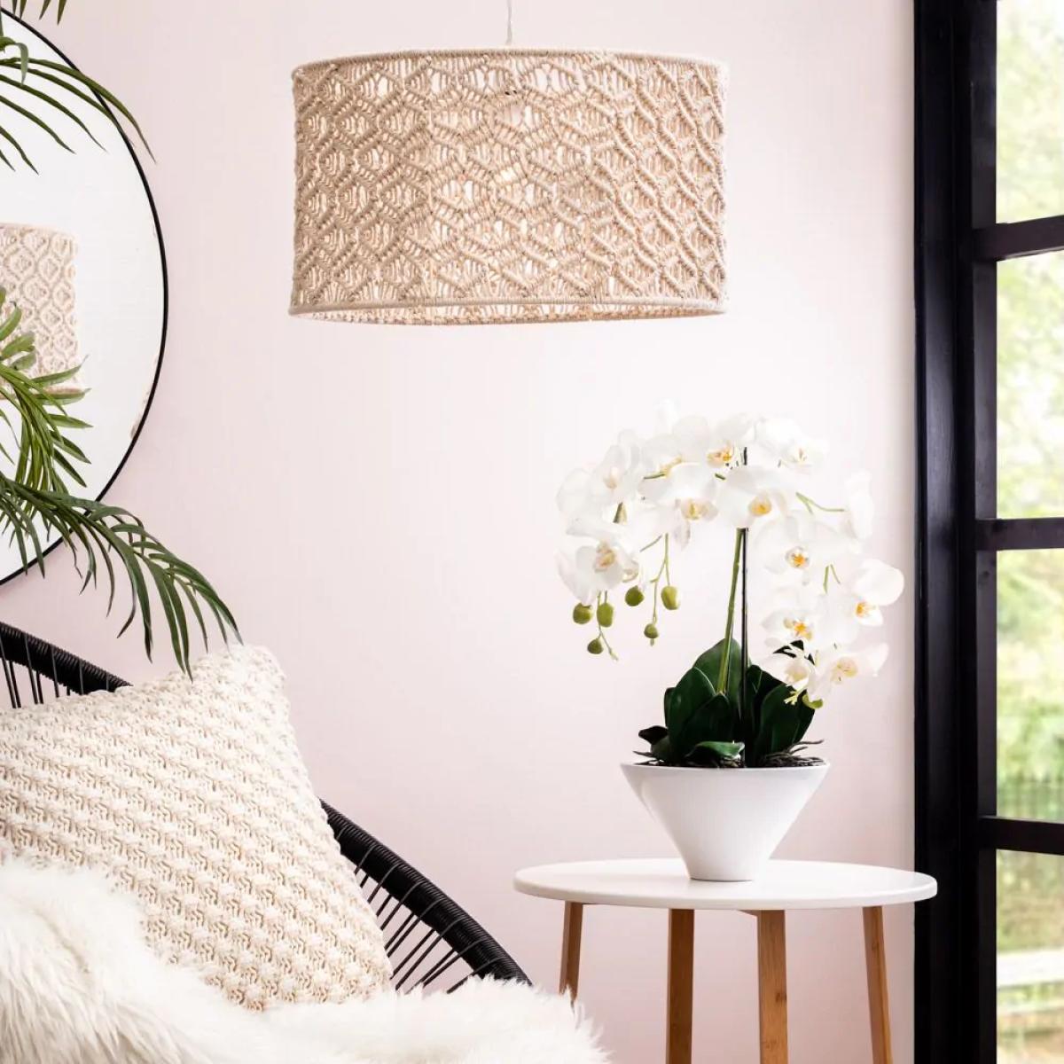 I love this big macrame shade for its relaxed, bohemian vibe and its versatility. It works particularly well in coastal, eclectic, or laid-back interiors, adding texture and warmth to any space. Its neutral ivory colour makes it easy to pair with a wide range of colour schemes. Practical styling tip: hang it in a room with high ceilings to let its size shine and create a cosy yet airy focal point. It’s perfect over dining tables, in living rooms, or even in bedrooms where you want to bring in some tactile detail without overwhelming the space. Keep the surrounding decor simple to let the intricate macrame pattern do the talking.