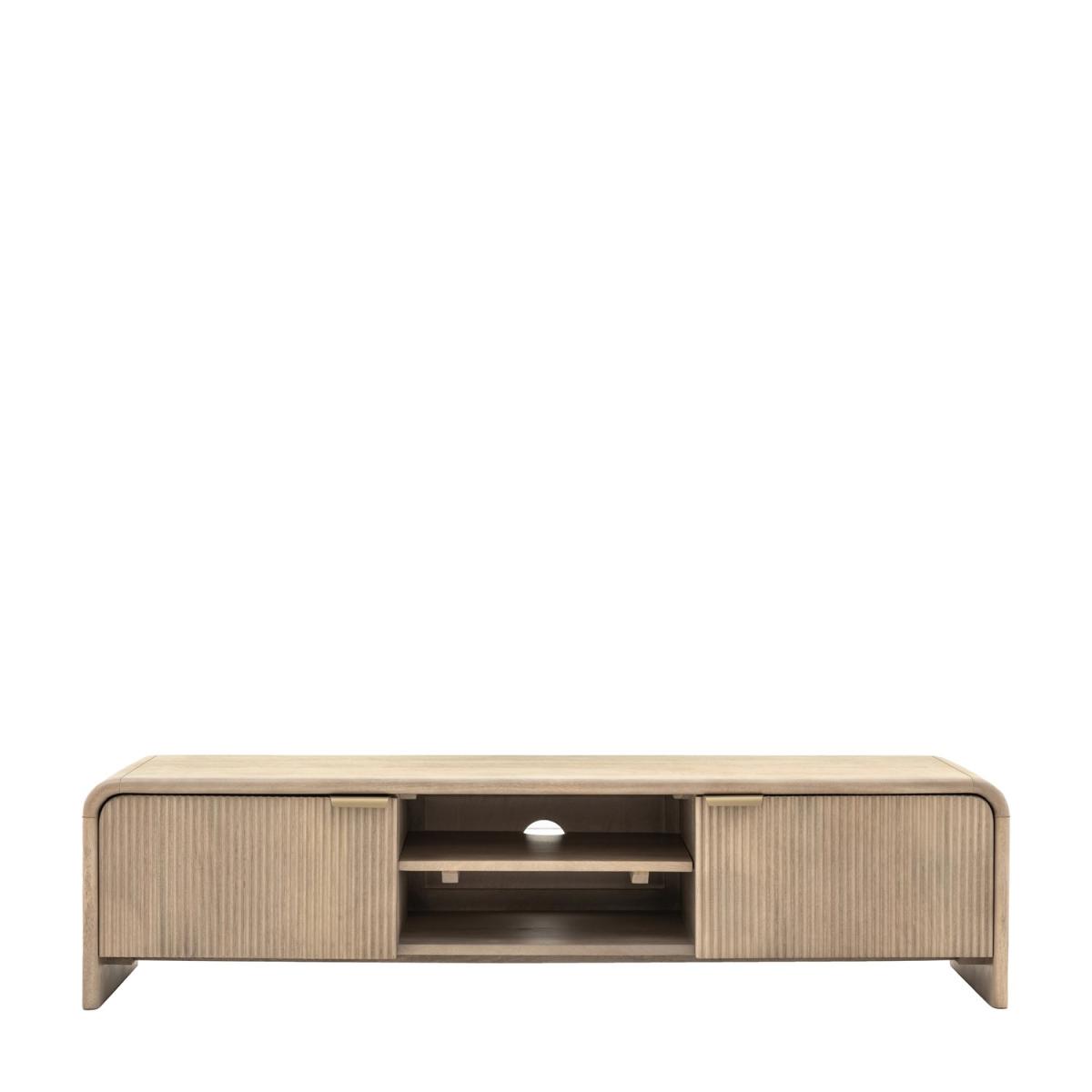 A beautifully designed media unit that combines storage and aesthetics effortlessly. Enhances the unit’s modern appeal with a refined textured finish. Features two concealed compartments and open shelving for all your entertainment essentials. Keeps wires neatly organized for a clean, clutter-free look. Constructed from high-quality wood for stability and longevity. Upgrade your living space with this elegant media unit, designed to bring organization and sophistication to your home. The curved top and fluted detailing create a modern yet timeless appeal, while the spacious storage compartments and open shelving keep your entertainment setup neat and stylish. Whether you’re storing media devices, gaming consoles, or decorative pieces, this unit is a perfect fit for any contemporary or classic interior. Dimensions: H35 x W140 x D40 cm Package dimensions (Box 1): H47 x W147 x D50 cm Maximum TV size: Up to 55" Weight: 28.24 kg Material: Wood Finish: Mango Wood Colour: Brown Assembly required: Yes
