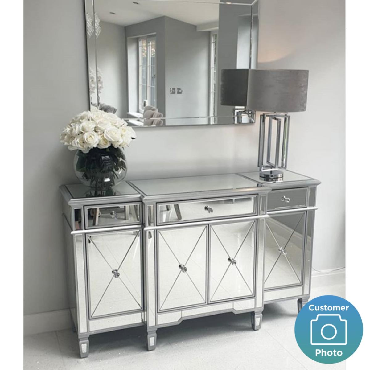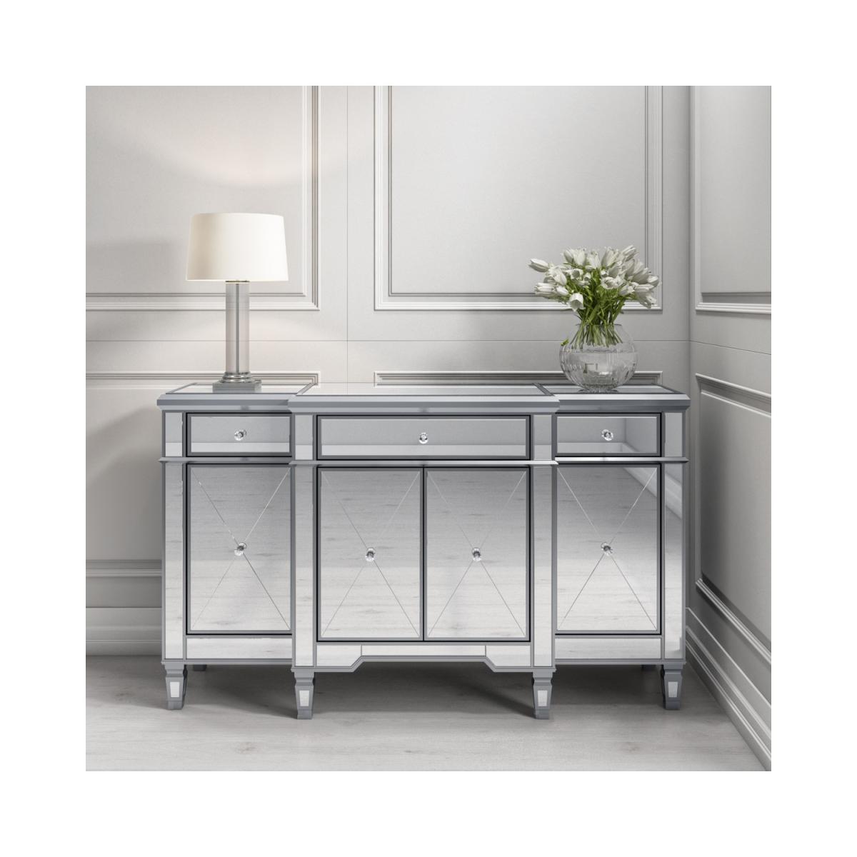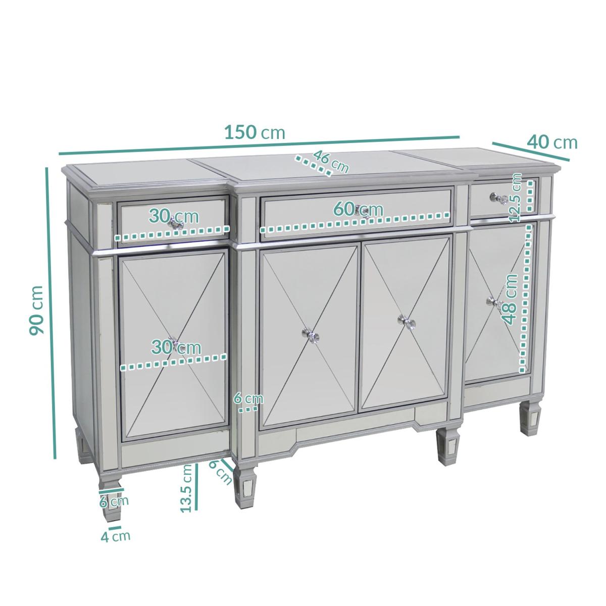 Features we love Adds a stylish Gatsby twist to a modern contemporary home. Fully mirrored panels and bevelled detailing reflects beautifully and catches the eye Ample storage space with three drawers one double-cupboard and two single cupboards. Sparkling crystal handles add a final finishing touch. Matching pieces available in the Jade Boutique collection All about me. Make a bold statement with this Jade Boutique sideboard. A striking balance between a simple piece of furniture and understated glamour thanks to the fully mirrored exterior and Gatsby inspired detailing. It reflects beautifully creating an illusion of space and it'll brighten the darkest of rooms. It'll look fabulous taking centre stage in your living room or dining room for an immediate focal point. There's plenty of storage space. There're three drawers one double-cupboard and two single cupboard spaces for keeping clutter at bay and your essentials organised; it would even make a great drinks cabinet. The top surface area is perfect for standing a fresh vase of flowers ornaments photos a stylish lamp or even a TVNeed to know. Overall dimensions. W150 x D46 x H90 cm Each end drawer internal dimensions. W28 x D36 x H9 cm Middle drawer internal dimensions. W58 x D42 x H9 cm Number of drawers. 3 Number of cupboards. 4 (2 end cupboards and 1 double cupboard) Colour. Silver Finish. Mirror Material. Wood construction mirror and crystal (handles) Weight. 73kg Assembly required. No.