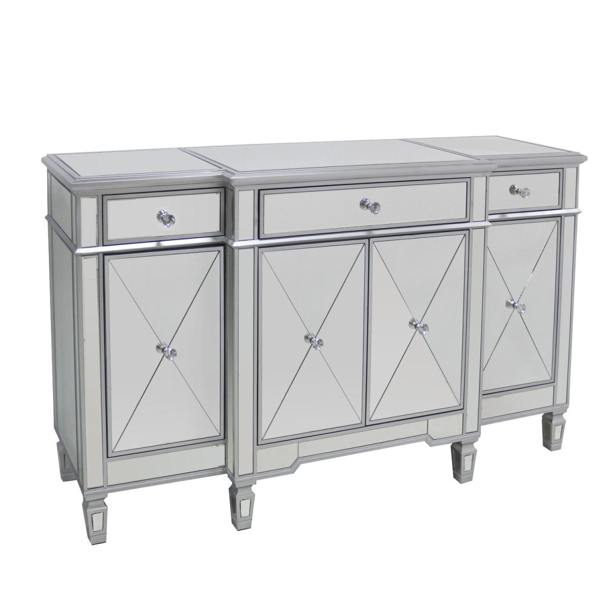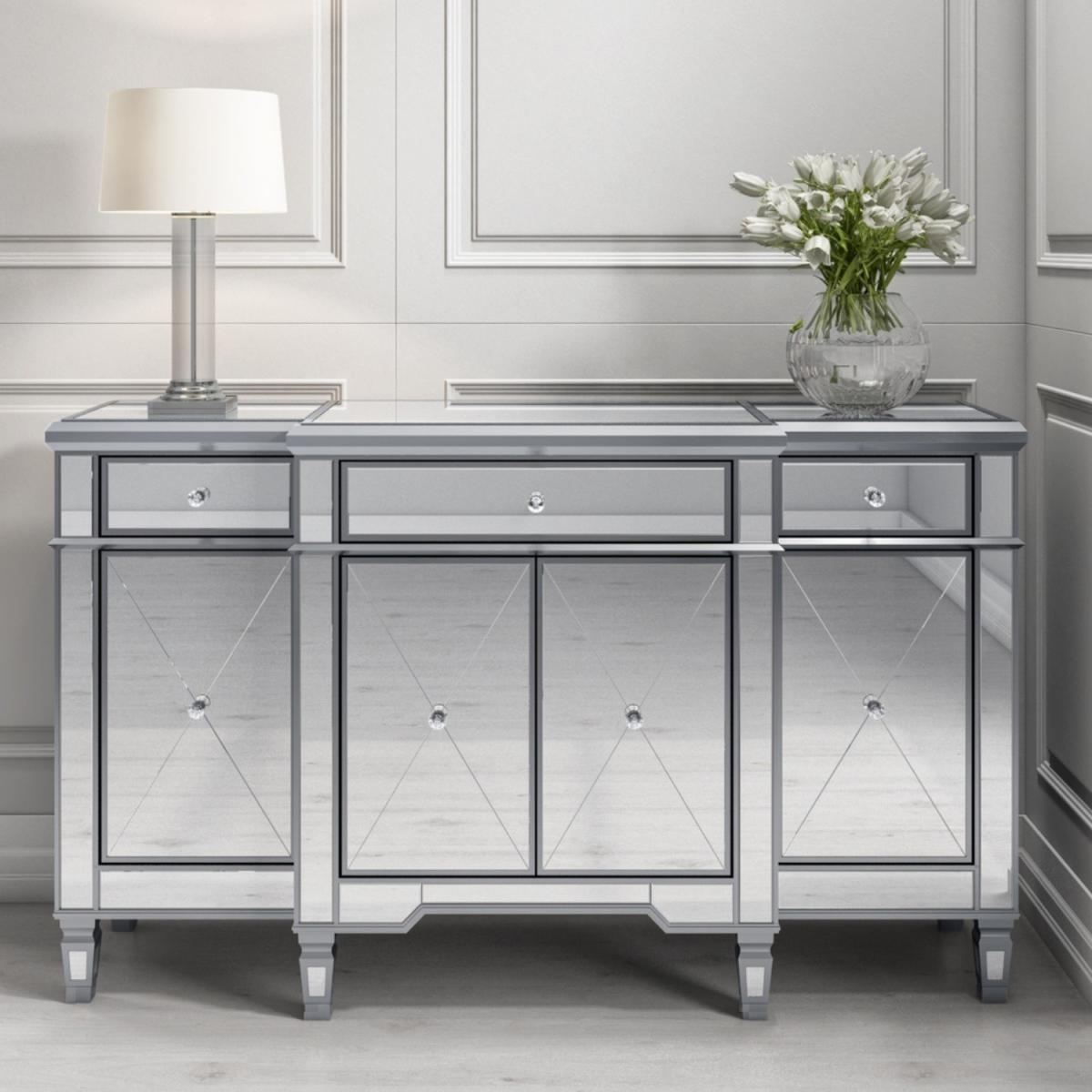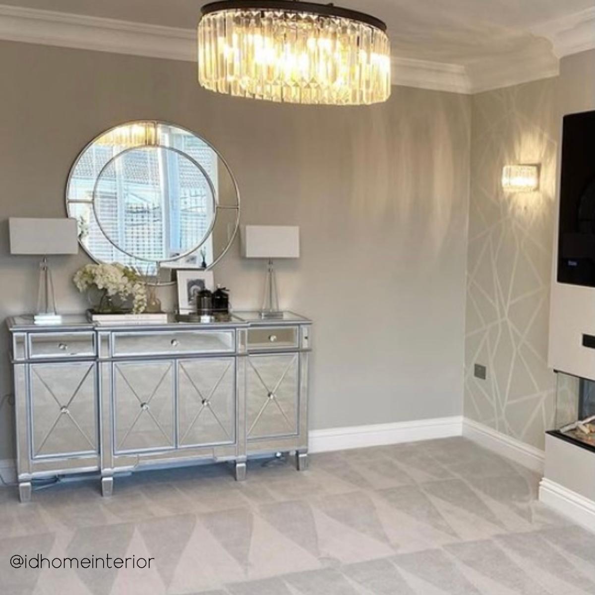 Features we love Adds a stylish Gatsby twist to a modern contemporary home. Fully mirrored panels and bevelled detailing reflects beautifully and catches the eye Ample storage space with three drawers one double-cupboard and two single cupboards. Sparkling crystal handles add a final finishing touch. Matching pieces available in the Jade Boutique collection All about me. Make a bold statement with this Jade Boutique sideboard. A striking balance between a simple piece of furniture and understated glamour thanks to the fully mirrored exterior and Gatsby inspired detailing. It reflects beautifully creating an illusion of space and it'll brighten the darkest of rooms. It'll look fabulous taking centre stage in your living room or dining room for an immediate focal point. There's plenty of storage space. There're three drawers one double-cupboard and two single cupboard spaces for keeping clutter at bay and your essentials organised; it would even make a great drinks cabinet. The top surface area is perfect for standing a fresh vase of flowers ornaments photos a stylish lamp or even a TVNeed to know. Overall dimensions. W150 x D46 x H90 cm Each end drawer internal dimensions. W28 x D36 x H9 cm Middle drawer internal dimensions. W58 x D42 x H9 cm Number of drawers. 3 Number of cupboards. 4 (2 end cupboards and 1 double cupboard) Colour. Silver Finish. Mirror Material. Wood construction mirror and crystal (handles) Weight. 73kg Assembly required. No.