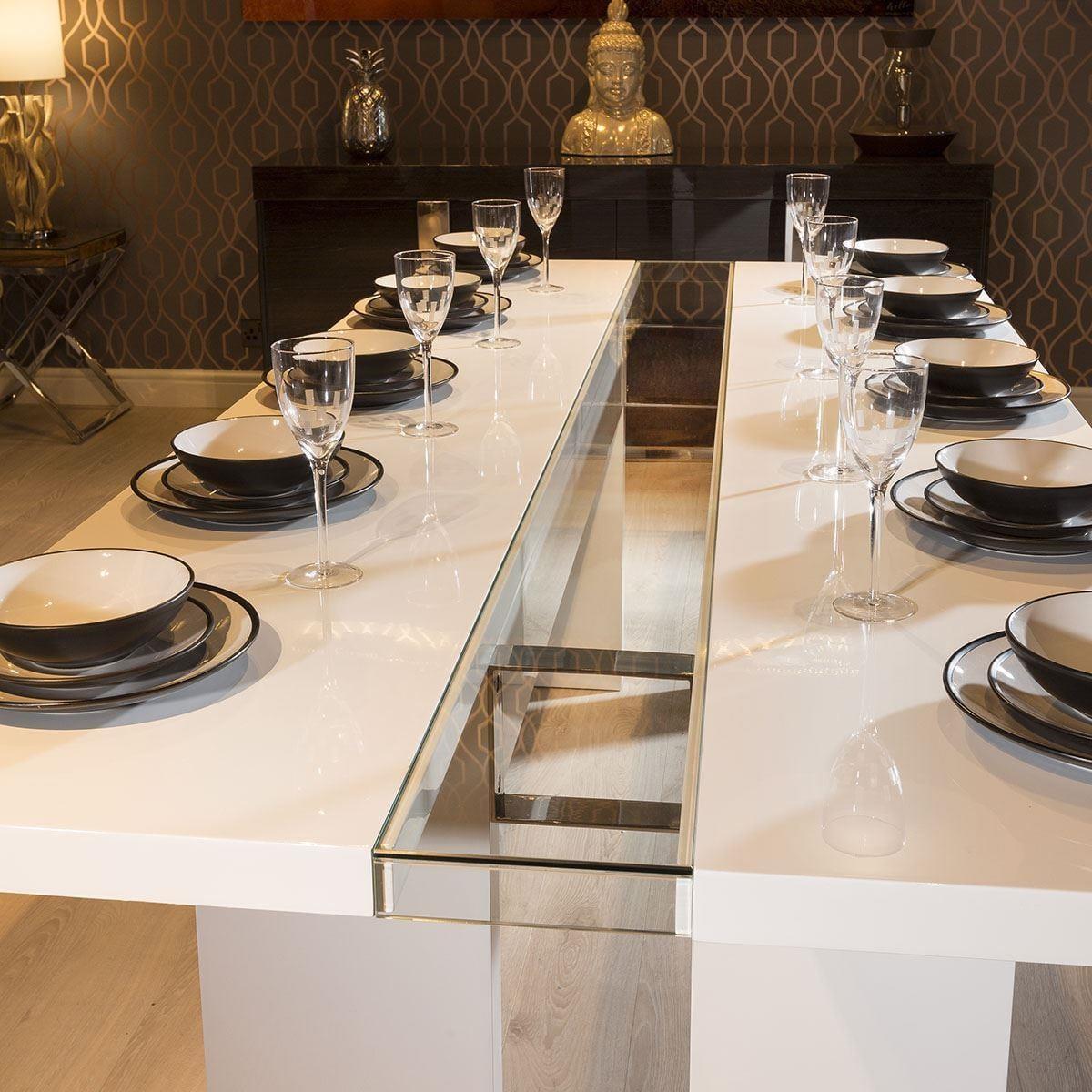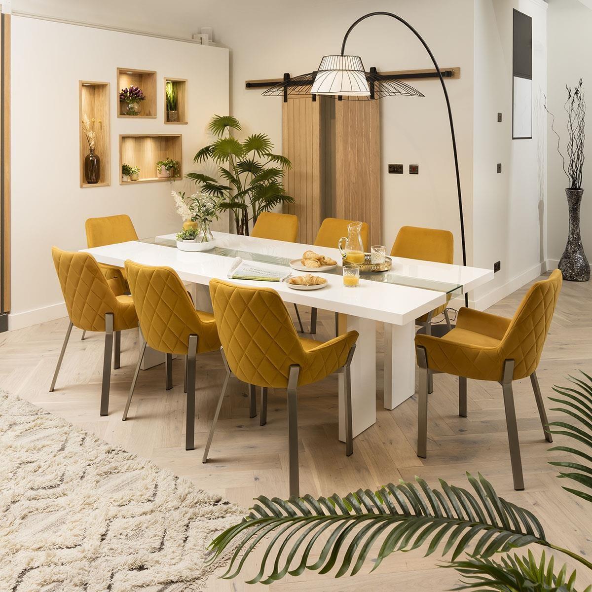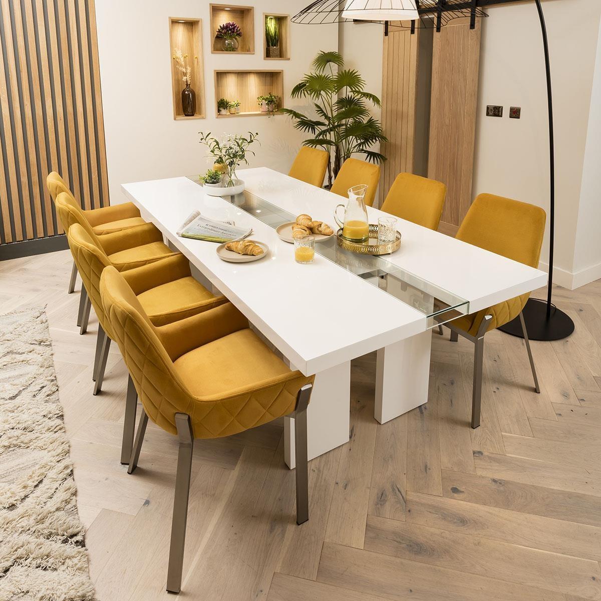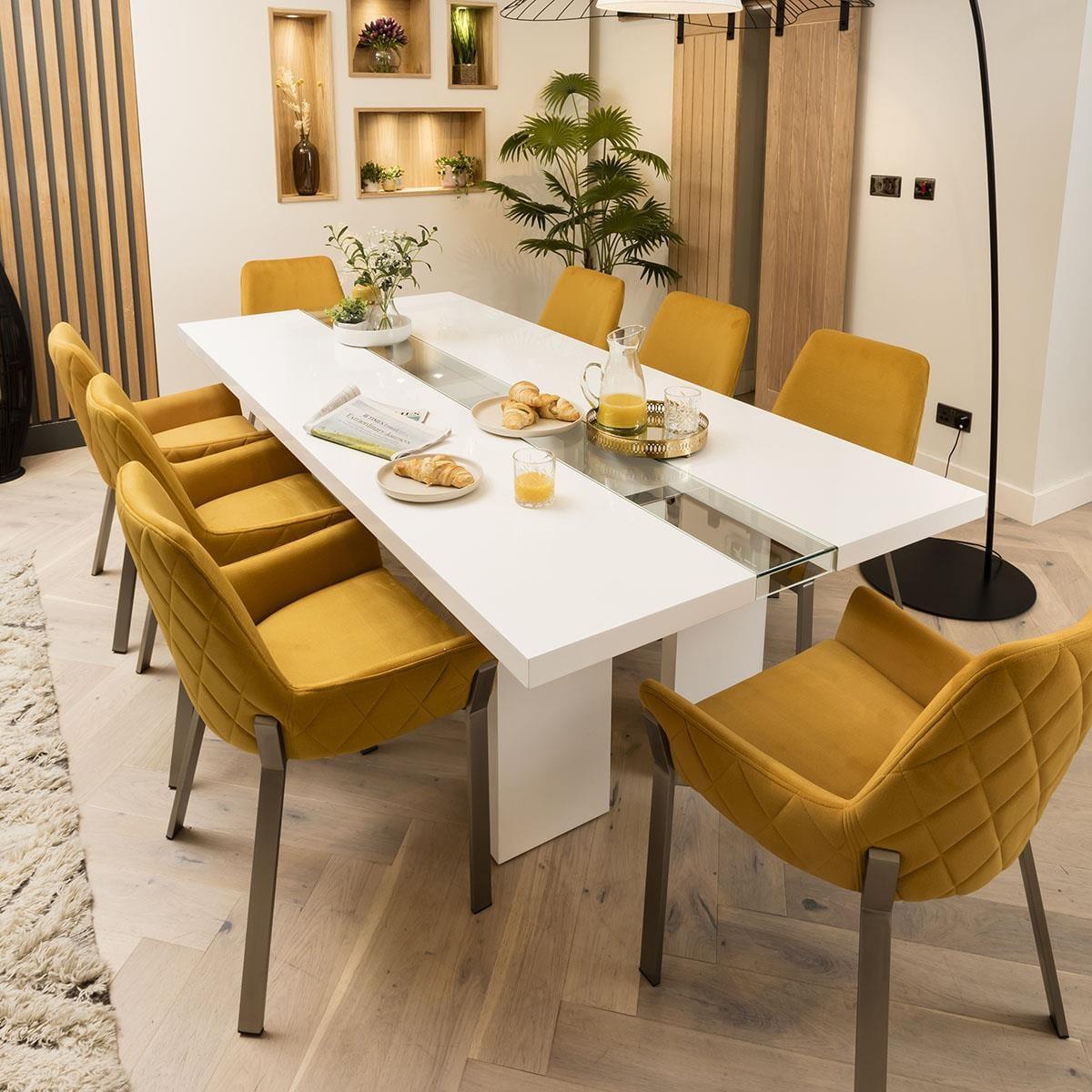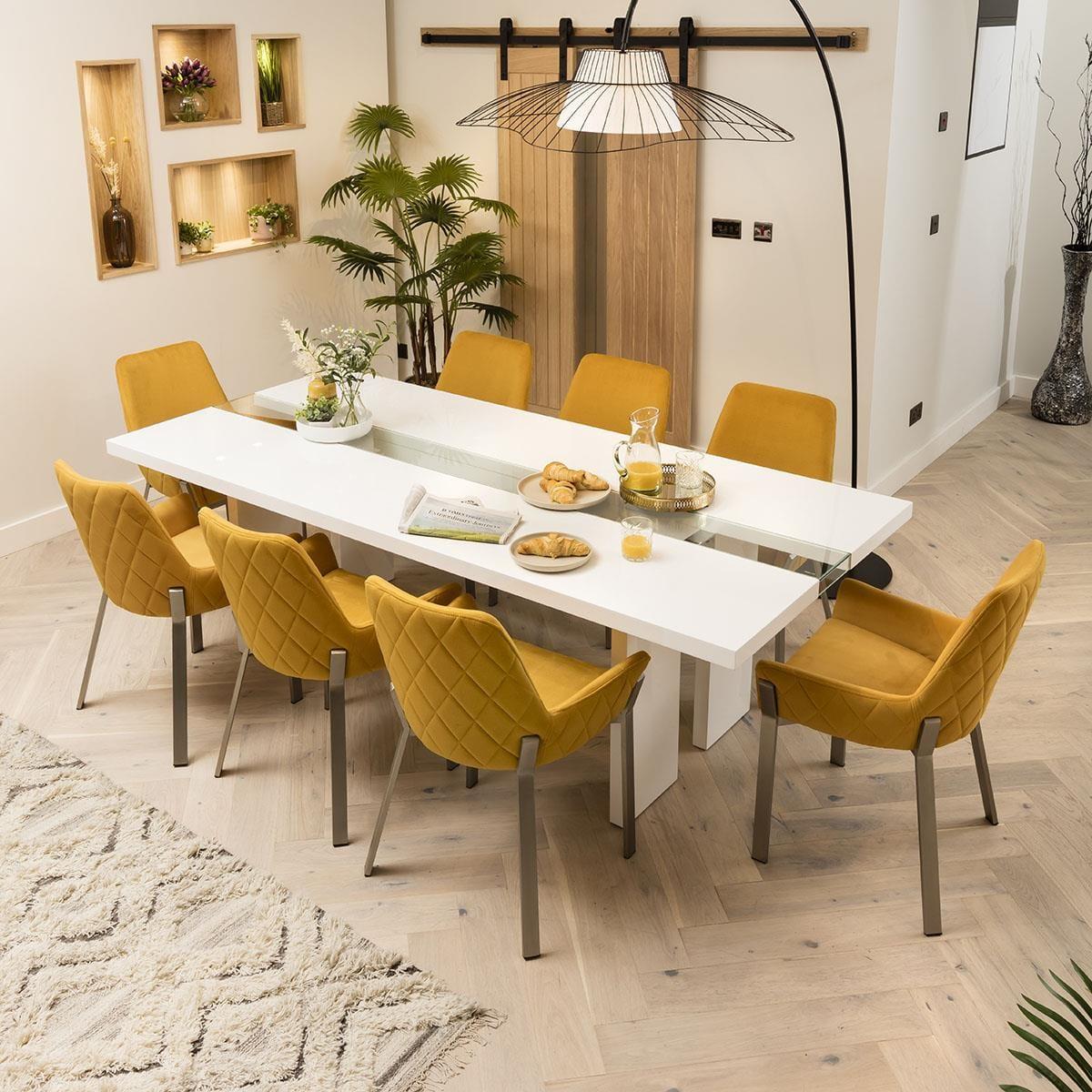 This white gloss ultra-modern chic dining table is Quatropi's rendition of a luxury river table featuring a stunning toughened glass 'river' centre. The 10 seater dining table is expertly crafted with a premium gloss white finish and decorated with glass in the middle, which makes it an incredibly modern eye-catcher, and stylish piece that is perfect for contemporary home decor. In keeping with the clean lines of the 240cm dining table, the straight legs tie in beautifully with the tabletop for a distinctly unique and contemporary look. Visually striking with their ultra-modern design and luxurious presence, the Quatropi Exclusive 1649 carver dining chairs demand designer credibility due to their shape, style and overall sleek appearance. Upholstered in a soft, fine mustard yellow fabric, featuring a stunning diamond quilted design. Complemented by the angled supportive arms, atop expertly crafted brushed metal legs. W240cm D110cm H75cm Chairs also available as matching bar stools Set includes the dining table and 8 carver chairs