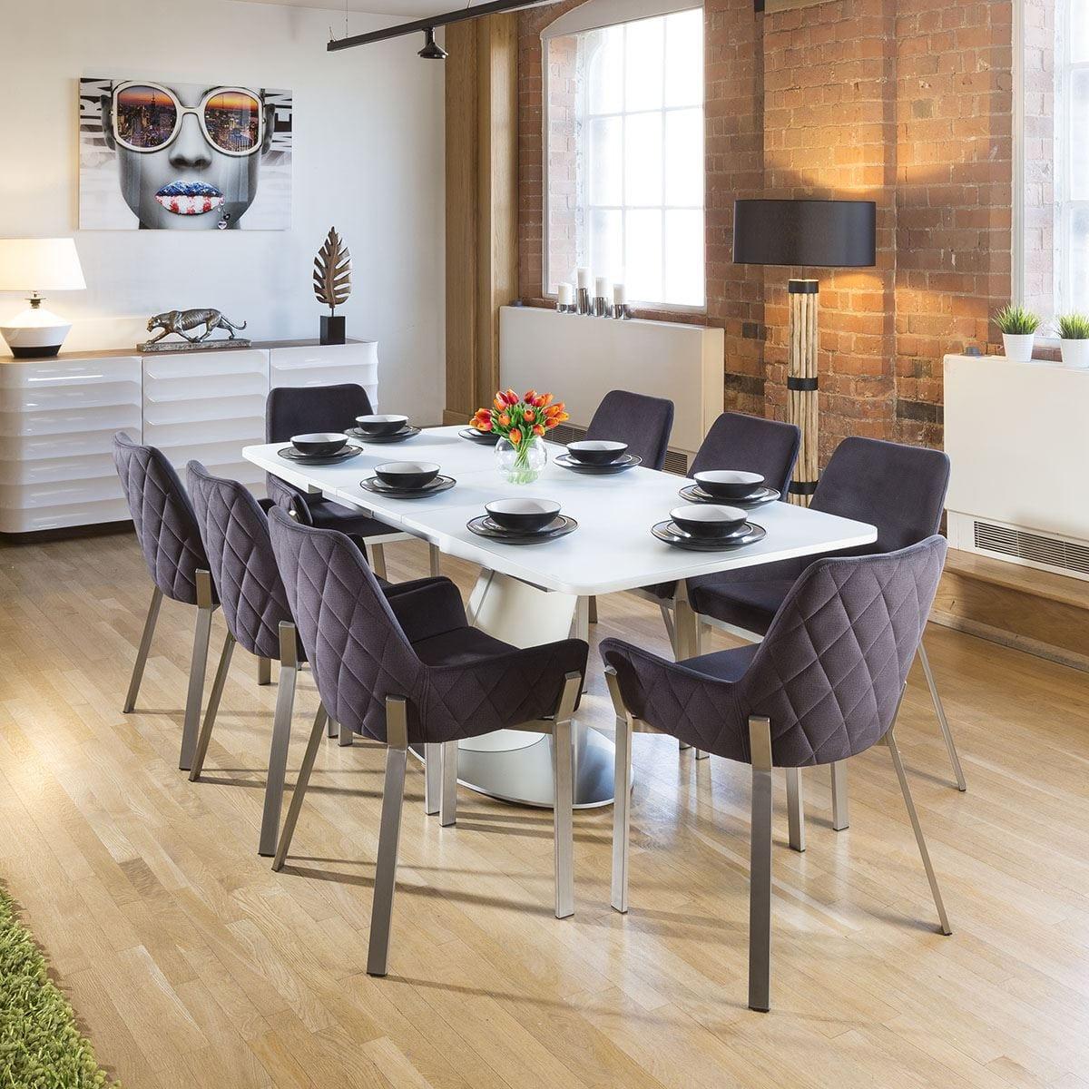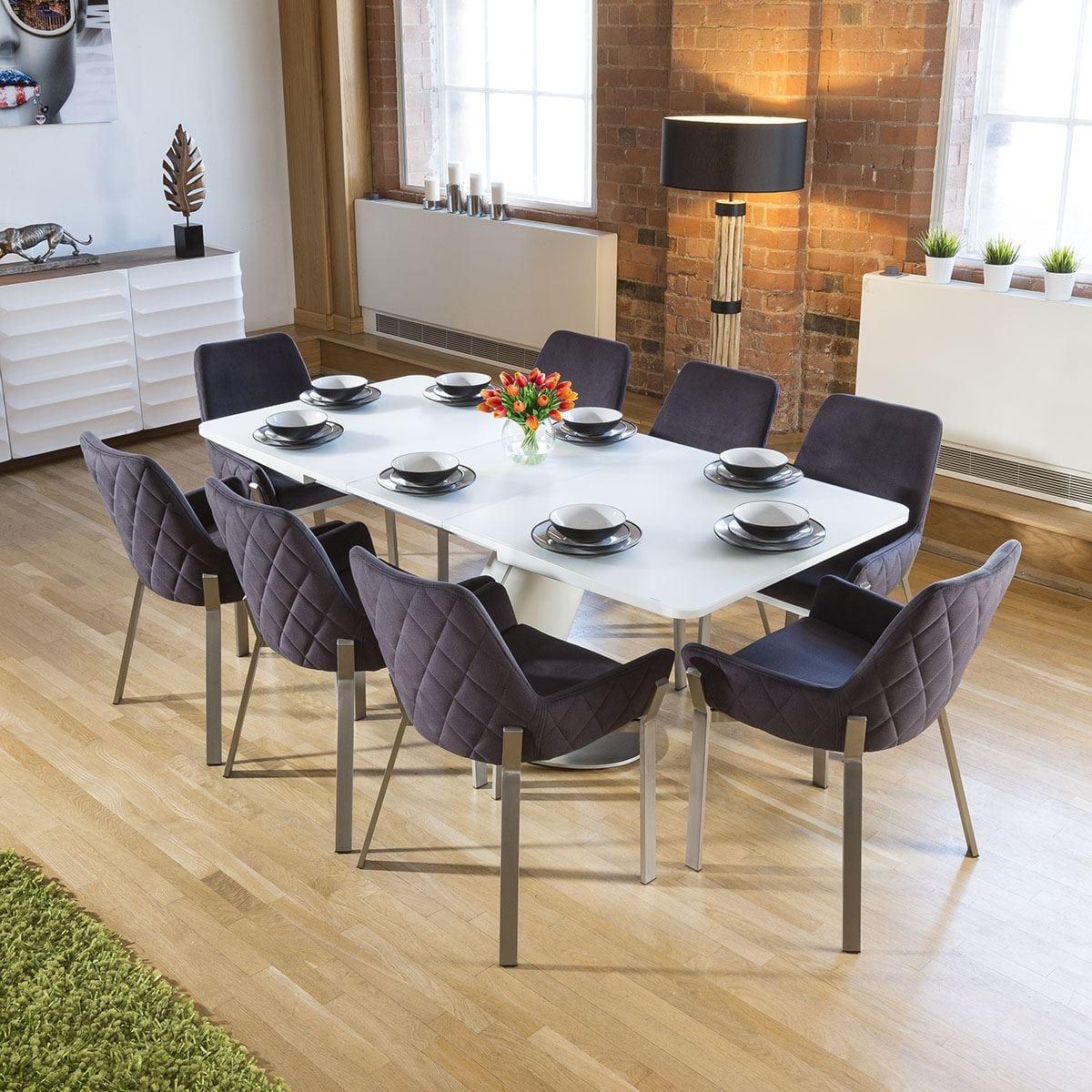 Large Modern 8 Seater Extending Glass Dining Set White Charcoal Fabric