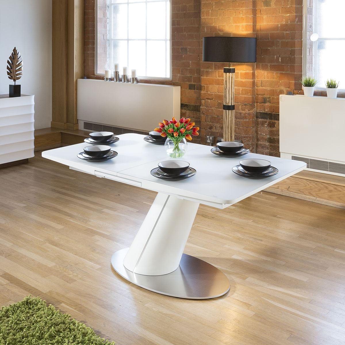 Large White Glass Topped Extending Dining Table with Angled Stem Plus 8 Dark Grey Carver Chairs with Stainless Steel Legs. This lovely table features a matt white glass top, feature angled stem and brushed stainless steel base. The thick padded chairs are comfortable, strong and extremely well made. The leaf is held under the main table when not in use. W90cm D200cm H76cm Modern 8 Seater Dining Set Premium Quality Furniture