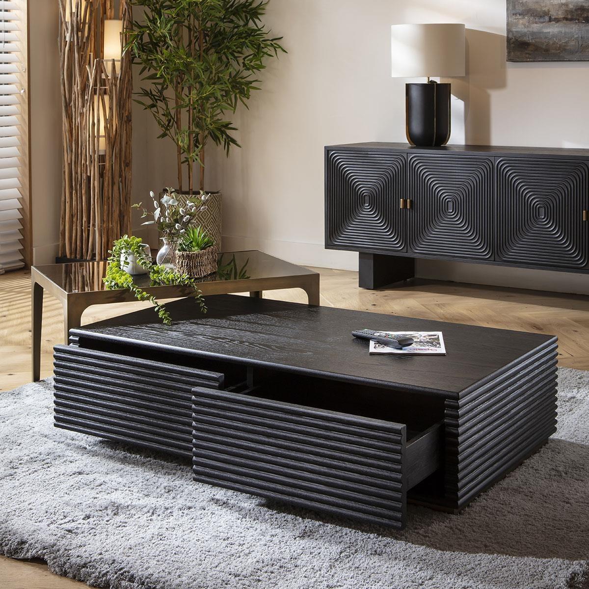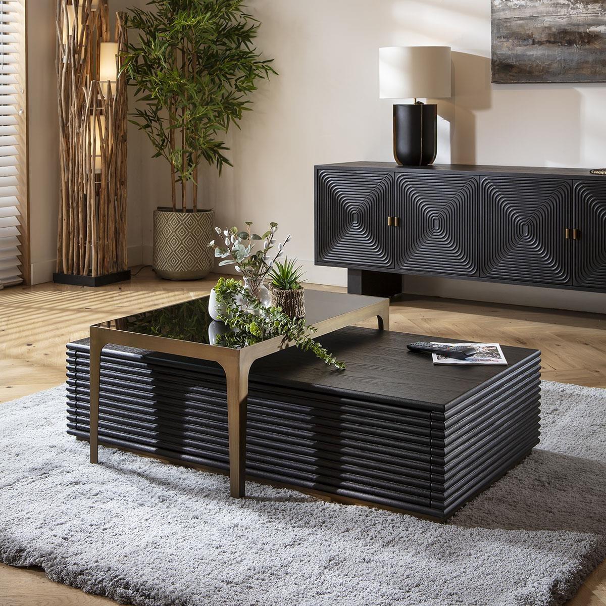 This modern nested coffee table set combines sleek design with versatility. Featuring a large black oak coffee table with two drawers and a glass coffee table on top, it offers functionality and style. The black and glass coffee table duo fits any living space, perfect for contemporary interiors. The rectangular glass and wood coffee table set includes two parts: a durable black oak table with a sturdy top, and a smaller black glass coffee table with a brushed brass metal frame that sits on top. Both tables offer flexibility as they can be used together or separately, enhancing the versatility of your living room. The black oak coffee table body boasts a sophisticated fluted design, adding texture and depth to the piece. The fluted pattern complements the modern aesthetic, while the durable black oak top ensures long-lasting use. This oak coffee table combines style with practicality. No assembly required! The nested coffee table set arrives preassembled in two boxes, one containing the black oak table, and the other holding the glass coffee table. Simply unbox and enjoy the convenience of a ready-to-use, stylish piece of furniture. W120cm D65cm H30cm Drawer Size W51cm D35cm H14cm Glass Table Size W80cm D50cm H40cm