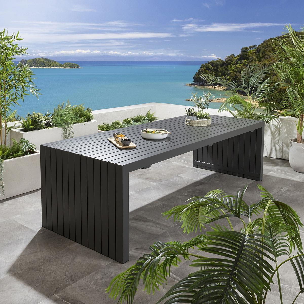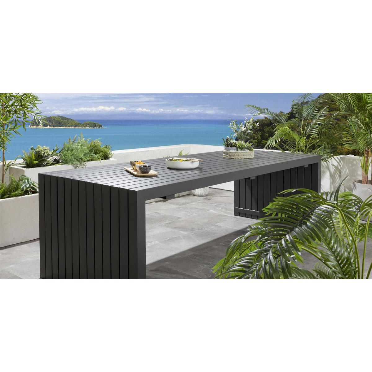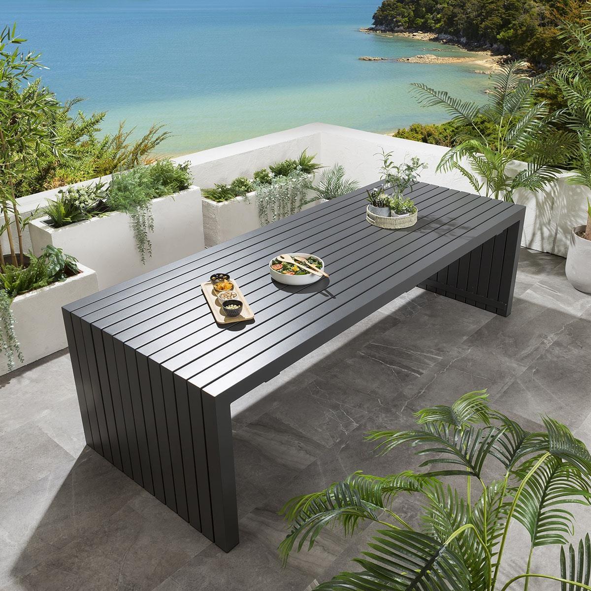 The premium Sun garden table in grey by Quatropi is an ultra-modern 2.6m x 1m outdoor garden dining table with an aluminium frame and a striking wrap around design - part of the unique designer range of garden patio furniture exclusive to Quatropi. This table emcompases a subtle wow-factor that is sure to impress, as well as the simplicity of a functionalist approach that will make it work with so many different styles. This simple design provides users with plenty of space to engage with others and manoeuvre. Also, ongoing maintenance of the table is easy, the frame and tabletop can easily be cleaned with warm soapy water. If you need more information about this product, use the Live Chat service to speak to the team or send us a message. Spread the cost our with interest-free finance options. Minimum spend applies. W260cm D100cm H75cm Unique Design Delivered Fully Assembled