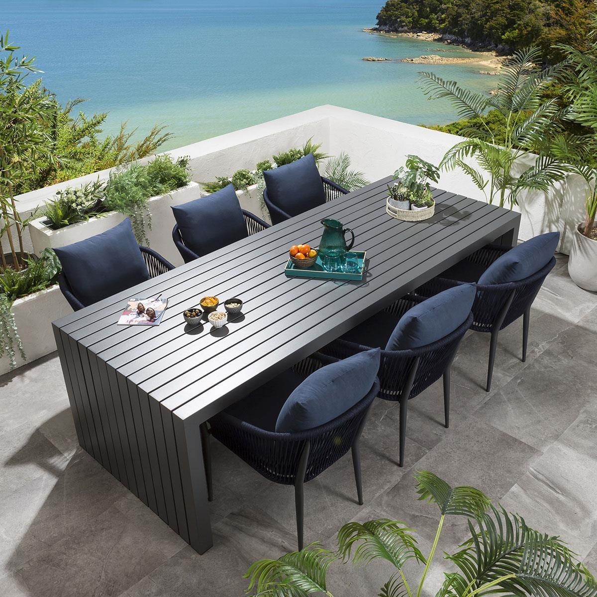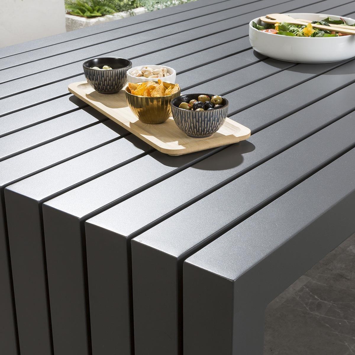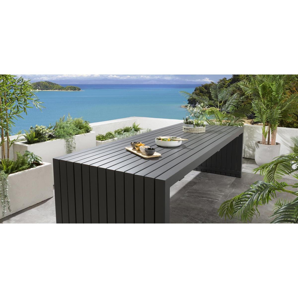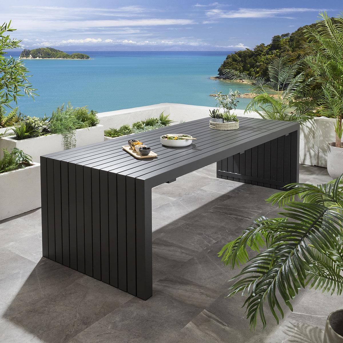 The premium Sun garden table in grey by Quatropi is an ultra-modern 2.6m x 1m outdoor garden dining table with an aluminium frame and a striking wrap around design - part of the unique designer range of garden patio furniture exclusive to Quatropi. This table emcompases a subtle wow-factor that is sure to impress, as well as the simplicity of a functionalist approach that will make it work with so many different styles. This simple design provides users with plenty of space to engage with others and manoeuvre. Also, ongoing maintenance of the table is easy, the frame and tabletop can easily be cleaned with warm soapy water. If you need more information about this product, use the Live Chat service to speak to the team or send us a message. Spread the cost our with interest-free finance options. Minimum spend applies. W260cm D100cm H75cm Unique Design Delivered Fully Assembled