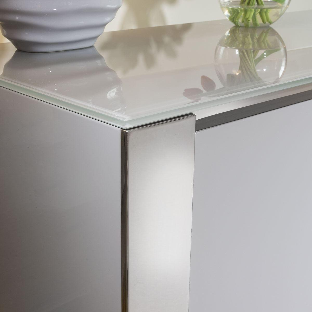 A harmonious combination of clean lines and shiny stainless steel, the Sophie 220cm wide TV stand with storage, a perfect blend of modern design and premium functionality for your living space setup. This sleek and stylish TV cabinet unit boasts a stunning grey gloss finish that effortlessly elevates any living space. With its spacious design, the Sophie TV stand caters to all your storage needs. Equipped with two cupboards, a convenient drawer, and an open shelf (W120cm D40cm H17 cm ), you'll find ample space to neatly organise your media equipment, gaming consoles, and more. The stainless steel accents not only add a touch of elegance but also enhance the overall sturdiness of the stand. This harmonious fusion of materials and design elements creates a focal point that complements various interior styles. Embrace the future of entertainment organisation with our modern TV cabinet unit. Its 220cm width provides ample room to accommodate larger screens, making it an ideal choice for home theaters and living rooms. The gloss grey finish exudes an air of sophistication, while the stainless steel accents offer a contemporary contrast that catches the eye. Whether you're a minimalist enthusiast or a fan of chic interiors, this TV stand is designed to seamlessly integrate into your space while offering unparalleled functionality. Elevate your home entertainment experience with a TV unit that redefines style and convenience. With its generous storage options, refined stainless steel touches, and pristine grey gloss exterior, our TV stand stands as a testament to the marriage of aesthetics and practicality. Upgrade your living space today with this exceptional piece that embodies the essence of modern design and premium craftsmanship. W220cm D45cm H48cm Stainless Steel Detailing With a glass top for added durablility