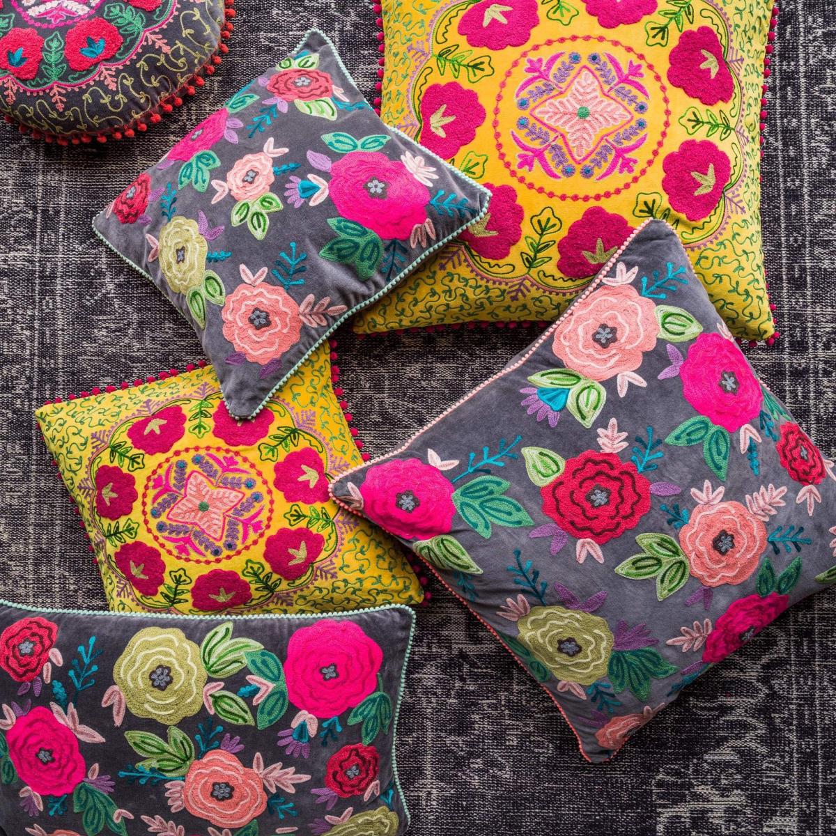 Beautifully embroidered with rows of small stitches and crafted by skilled artisans, this colourful velvet cushion adds a pop of colourful Mexicana style.