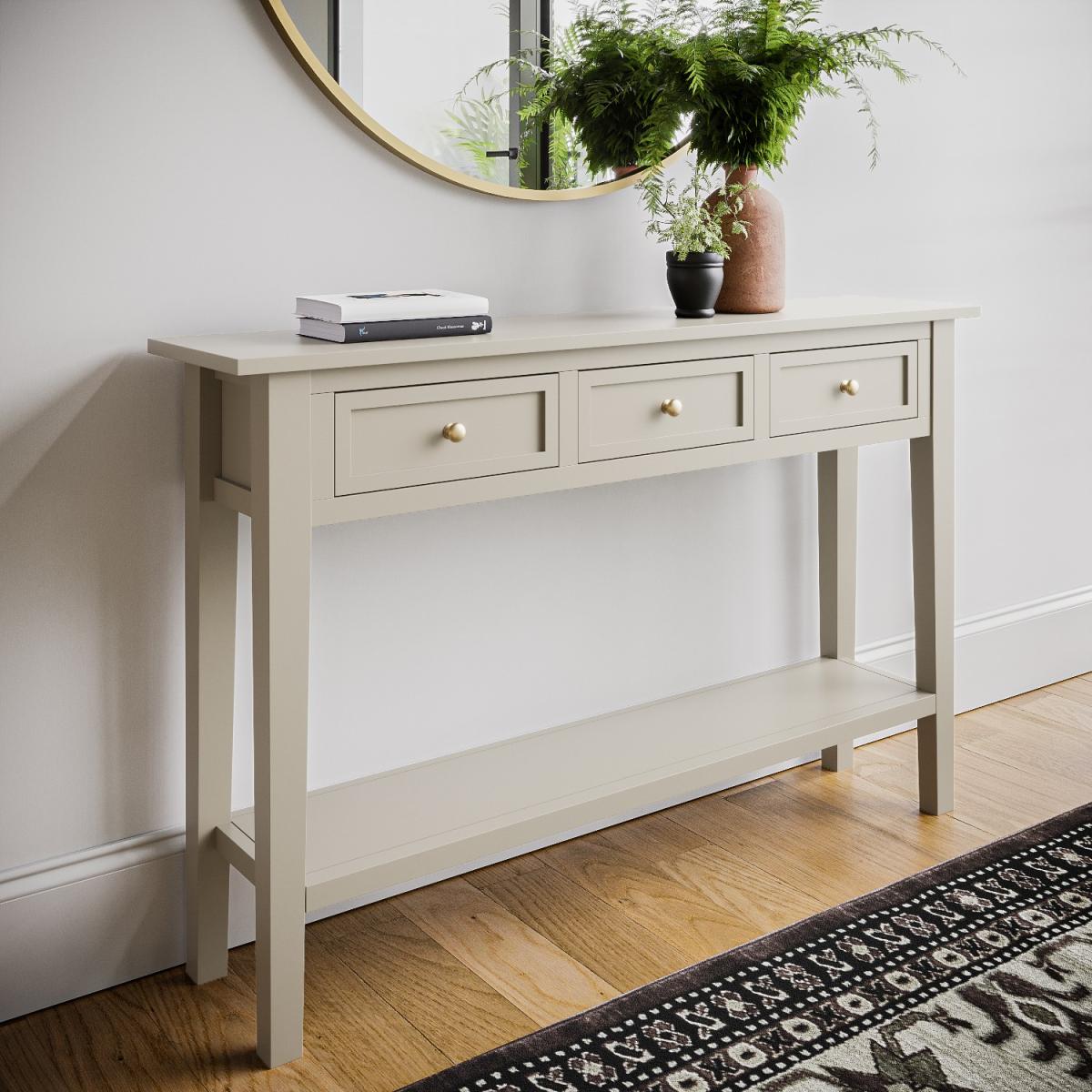 All about me Maximise your space, and discover the perfect finishing touch for any hallway. This narrow console table has been beautifully finished in a sleek beige with two options for your handles, to complement most room themes and colour palettes. Pick and choose how or where you store your items across three levels of convenient storage; on the top, concealed behind drawers or on the lower shelf. In your product's packaging, we provide 2 colour options for your 3 delicate handles. During assembly, you can choose between silver or gold, the perfect way to cater to any decor. Need to know Dimensions: H82 x W125 x D27 cm Package dimensions: H41 x W132 x D34 cm Product weight: 17kg Material: Acacia and MDF wood combination Finish: Beige Drawers: 3 Assembly required: Yes