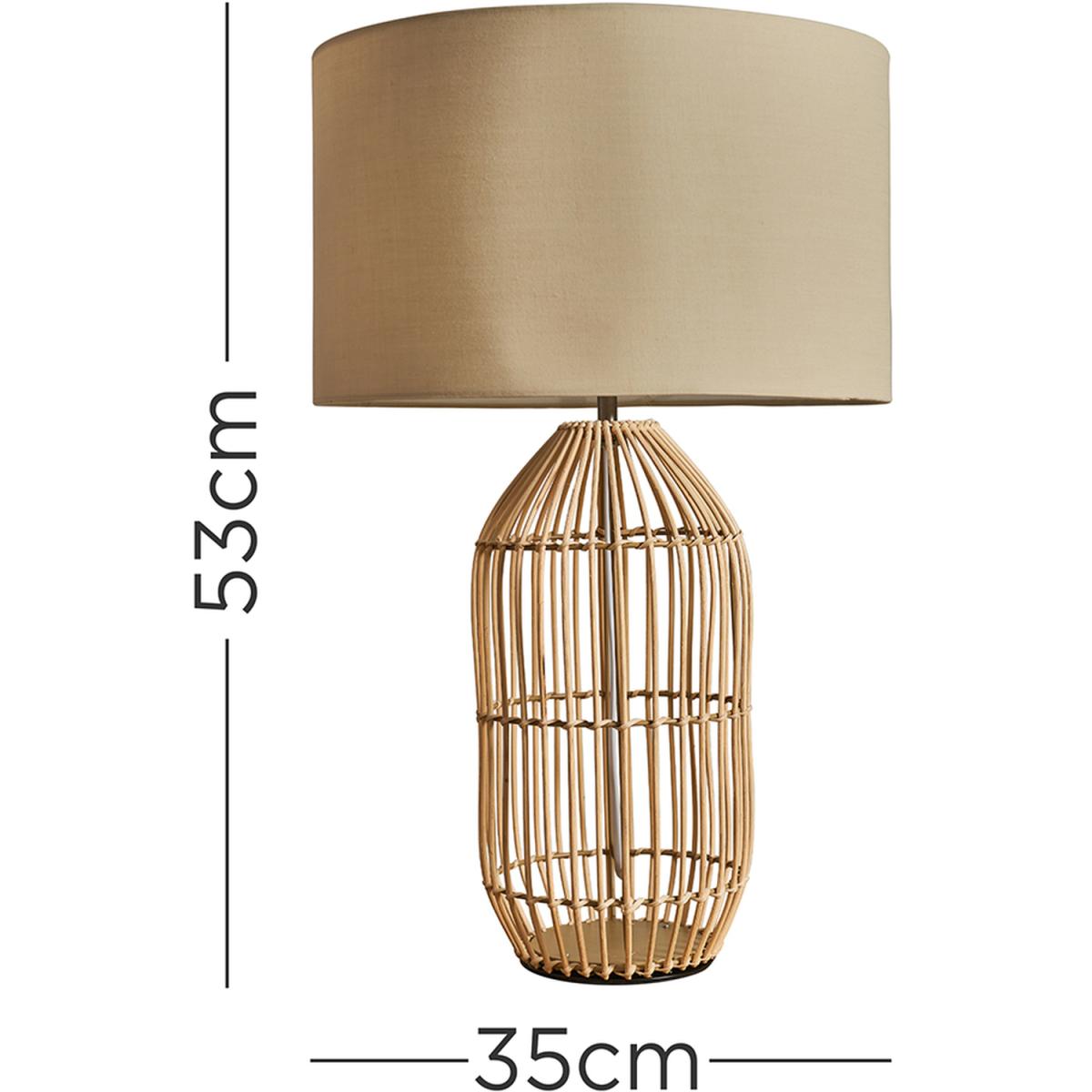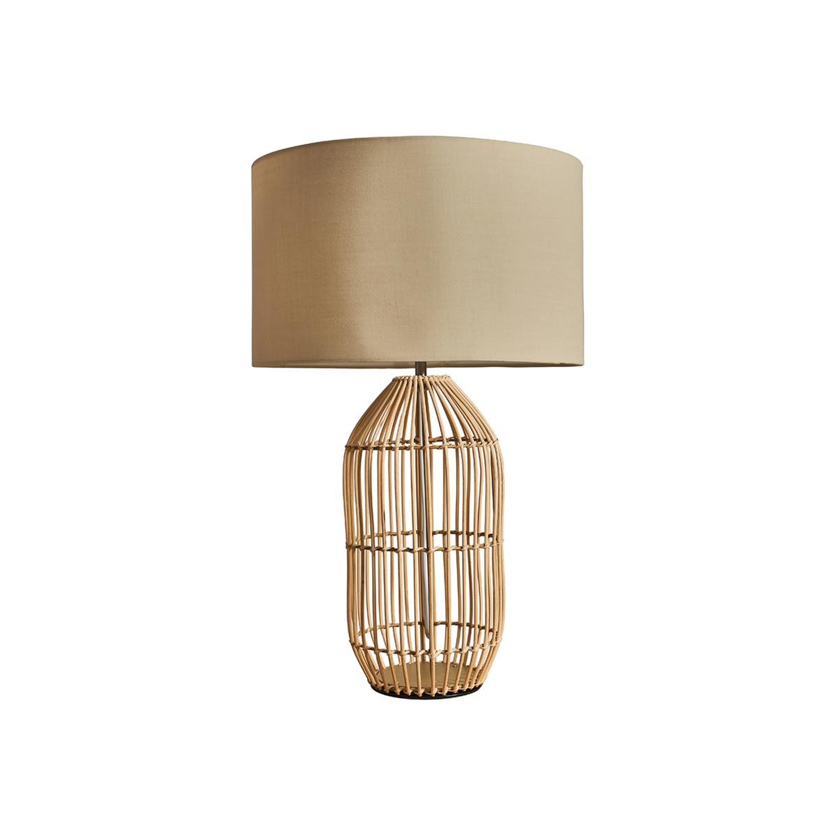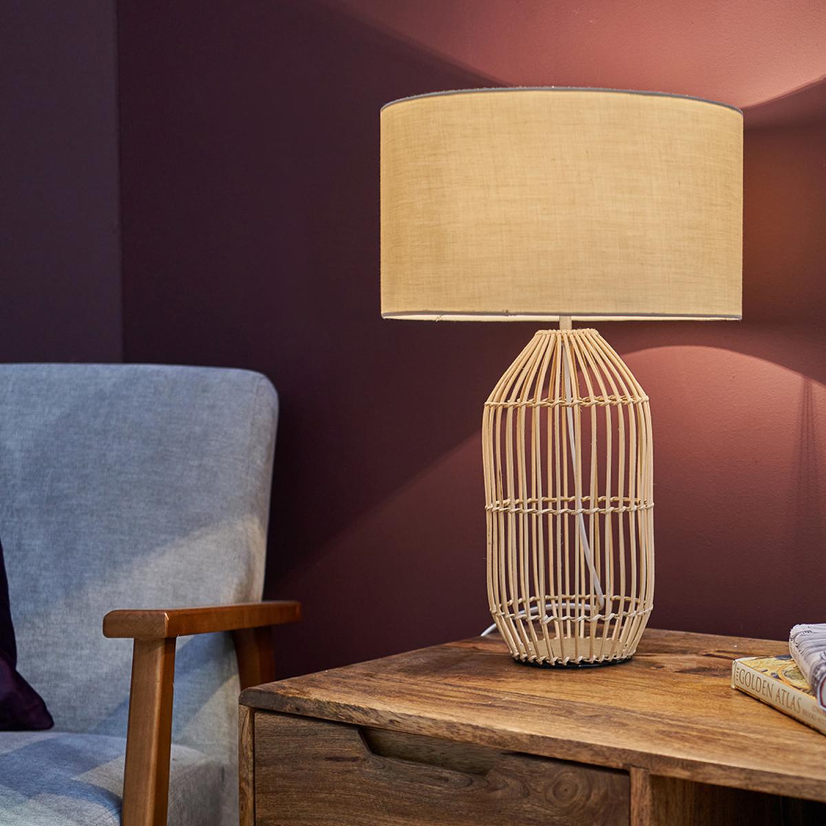 Bring some global style to your home with the large natural Hollins table lamp with mink Reni shade. Choose a natural or matt black finish for this rattan table lamp, that features delicately woven natural rope that forms the base of this exotic looking table lamp. The Hollins is perfectly paired with a range of drum shades to compliment your colour scheme. The carefully woven base and warm light of the Hollins table lamp brings instant texture and interest to your decor. Requires one 40W ESE27 bulb or LED equivalent