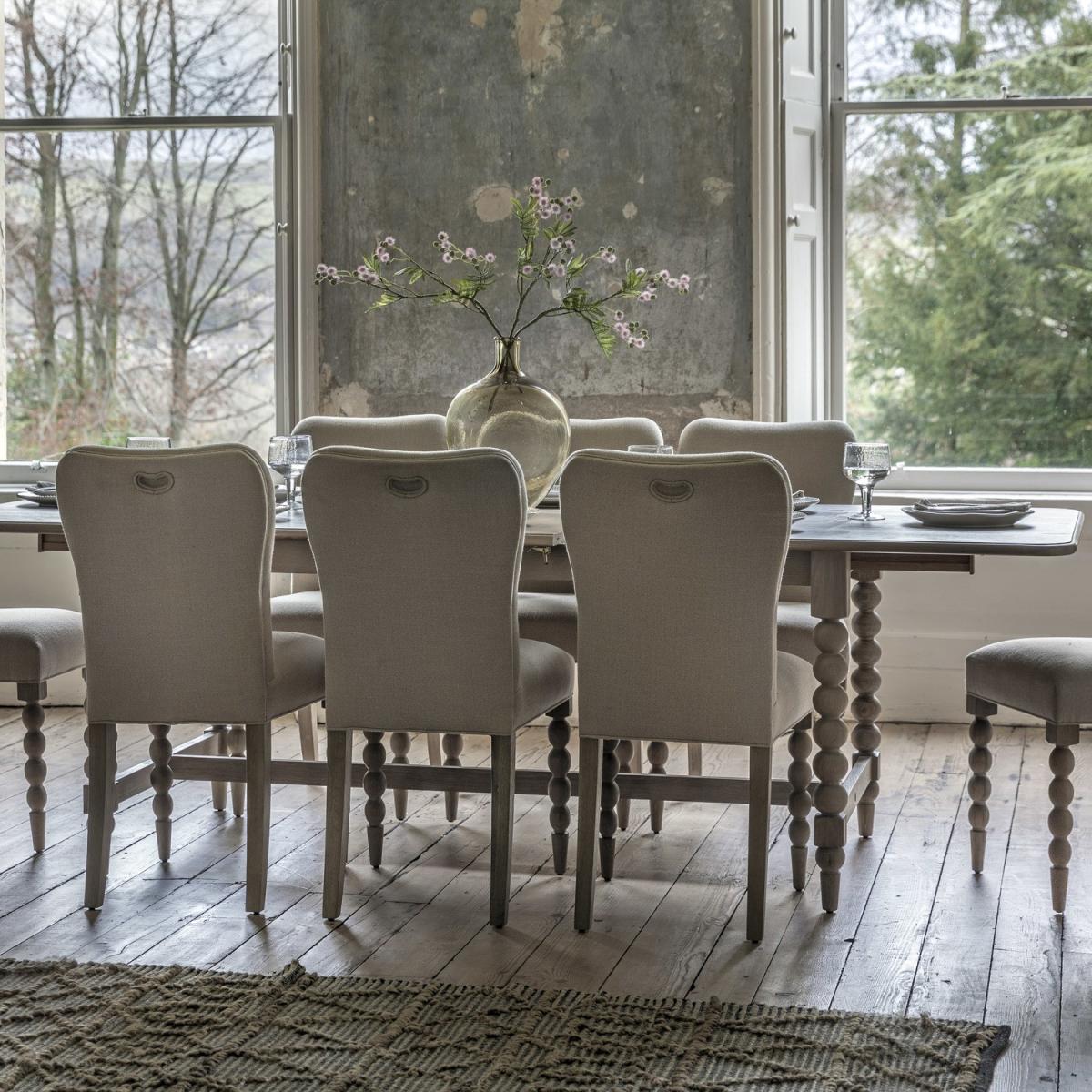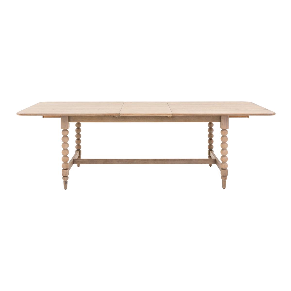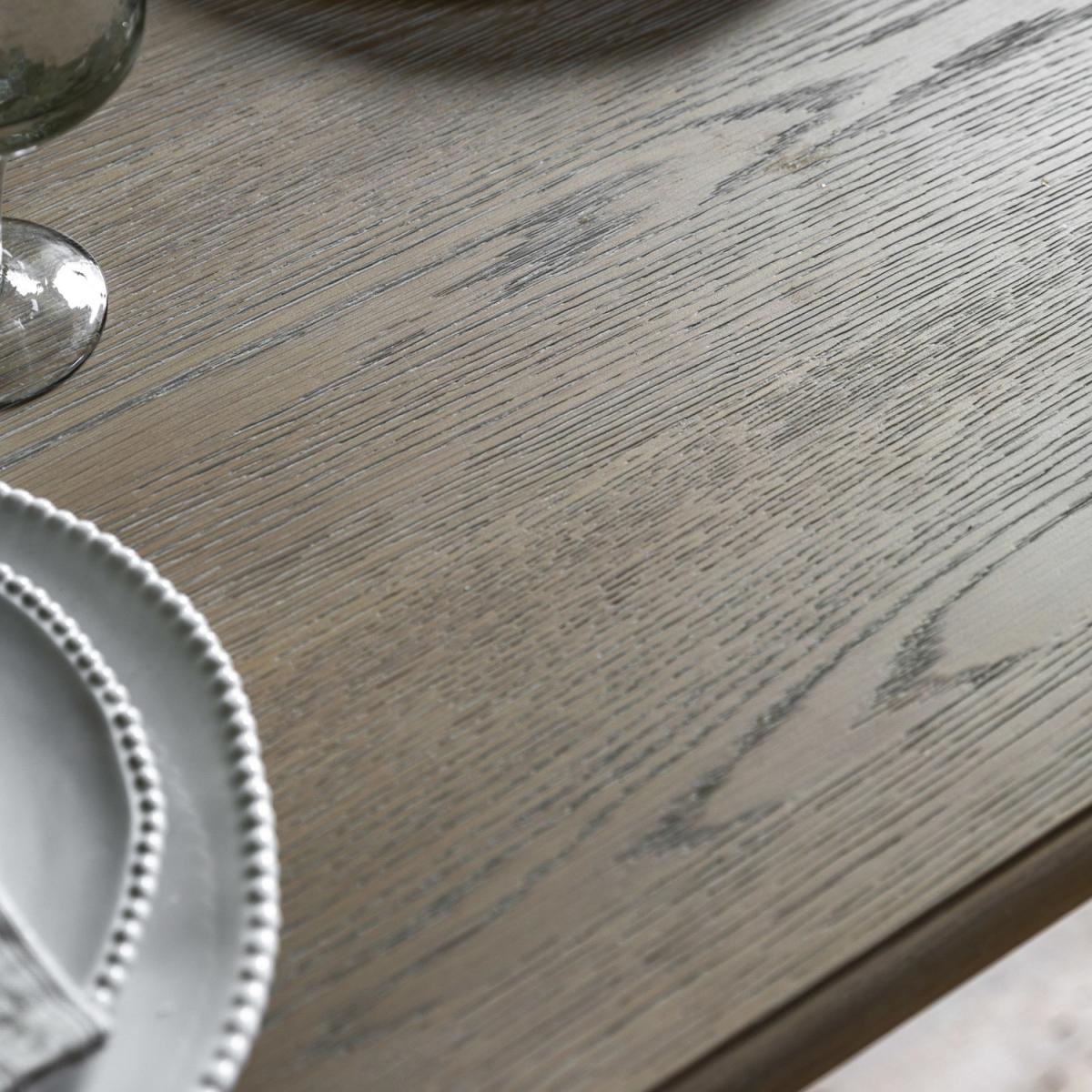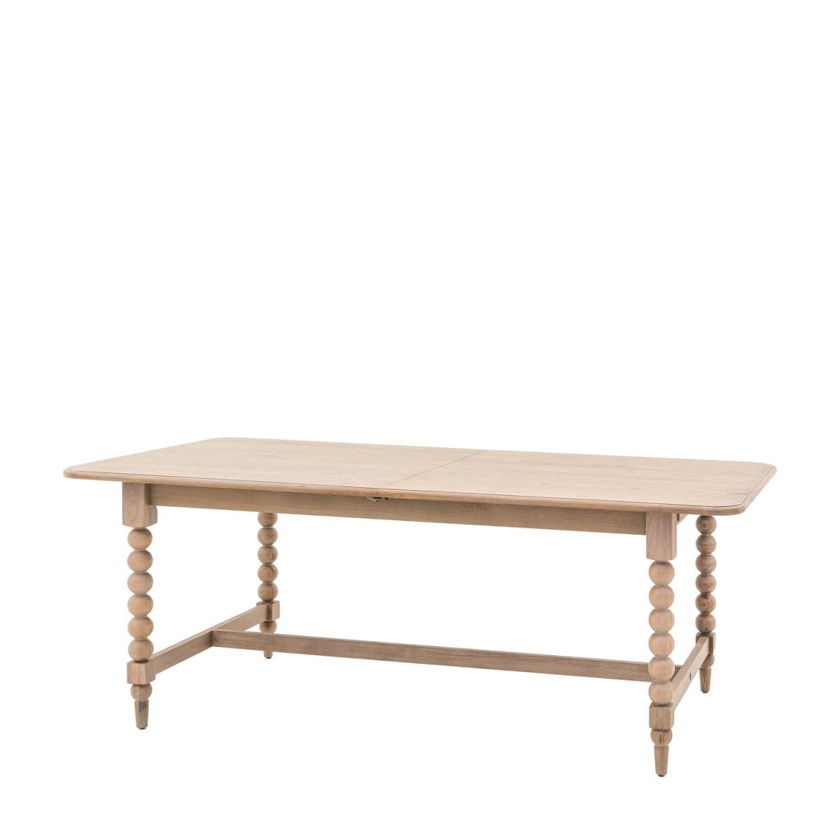 Dimensions:W200/250 x D100 x H75 cm This stunning dining table will make a classy addition to any dining room, and with its extending top it is both beautiful and practical. The legs feature hand-crafted bobbing detail which is created by turning the wood on a lathe, a task carried out by the finest craftsmen. The table is made using beautiful oak solids and veneers where practical, with a very subtle lime wash tone to the finish which is soft and mellow. Matching pieces are available. Features: Natural oak Feet Height 72.5cm bobbing detail legs Seats 8 Rectangle Matching items available Some assembly required