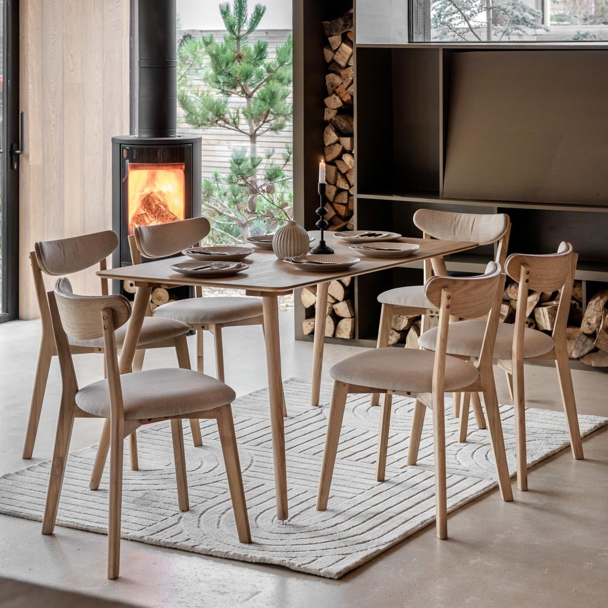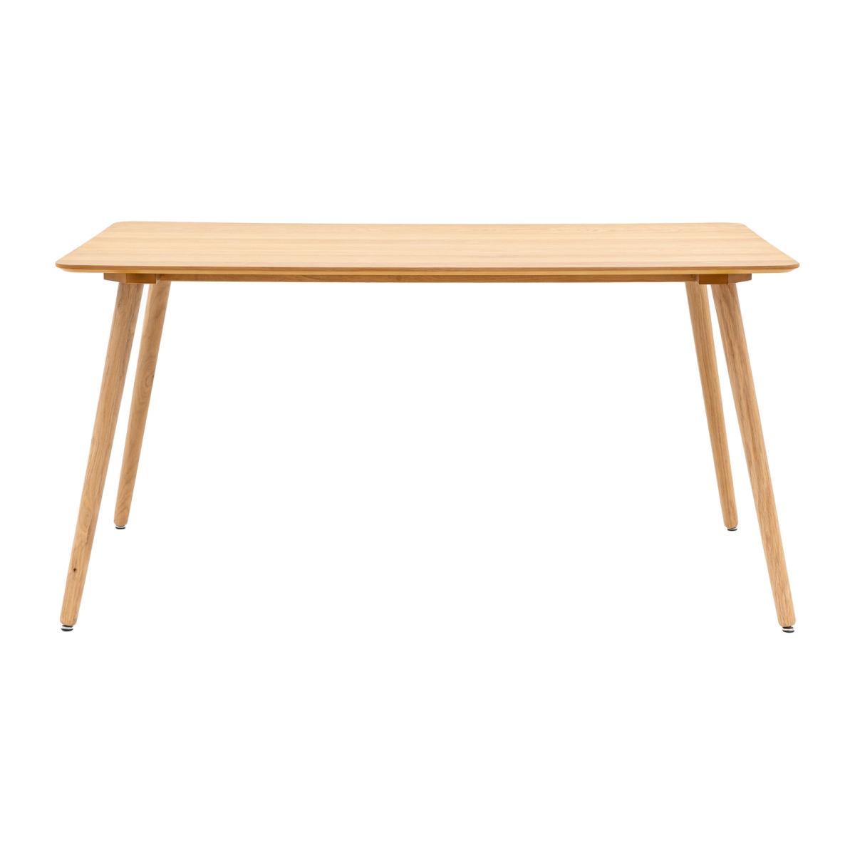 Combines a nostalgic aesthetic with modern functionality, featuring elegant, clean lines and gently rounded corners. Durable and high-quality materials ensure a sturdy and stylish piece. Highlights the beautiful wood grain for a timeless and warm look, perfect for any dining space. Coordinate with other furniture items for a cohesive and polished interior design. Generous tabletop space accommodates dining and entertaining needs while maintaining a sleek profile. Elevate your dining experience with this retro-inspired dining table that blends mid-century charm with contemporary elegance. Crafted from premium oak veneers and rubberwood, this table is designed to bring warmth, durability, and timeless style to your home. Its natural finish highlights the intricate wood grain, adding a touch of rustic beauty that seamlessly fits into modern and classic interiors alike. The gently rounded corners and tapered legs evoke a nostalgic aesthetic while maintaining a sleek and sophisticated profile. For added versatility, this table is also available in a rich smoked oak finish, giving you the option to match your unique decor preferences. Dimensions: W150 x D80 x H75 cm Packaging dimensions: W156.6 x D86.5 x H10.5 cm Weight: 24 kg Seats: 6 people Colour: Brown Finish: Lacquered Material: Oak Veneer MDF and Oak Veneer Rubber Wood Assembly required: Yes