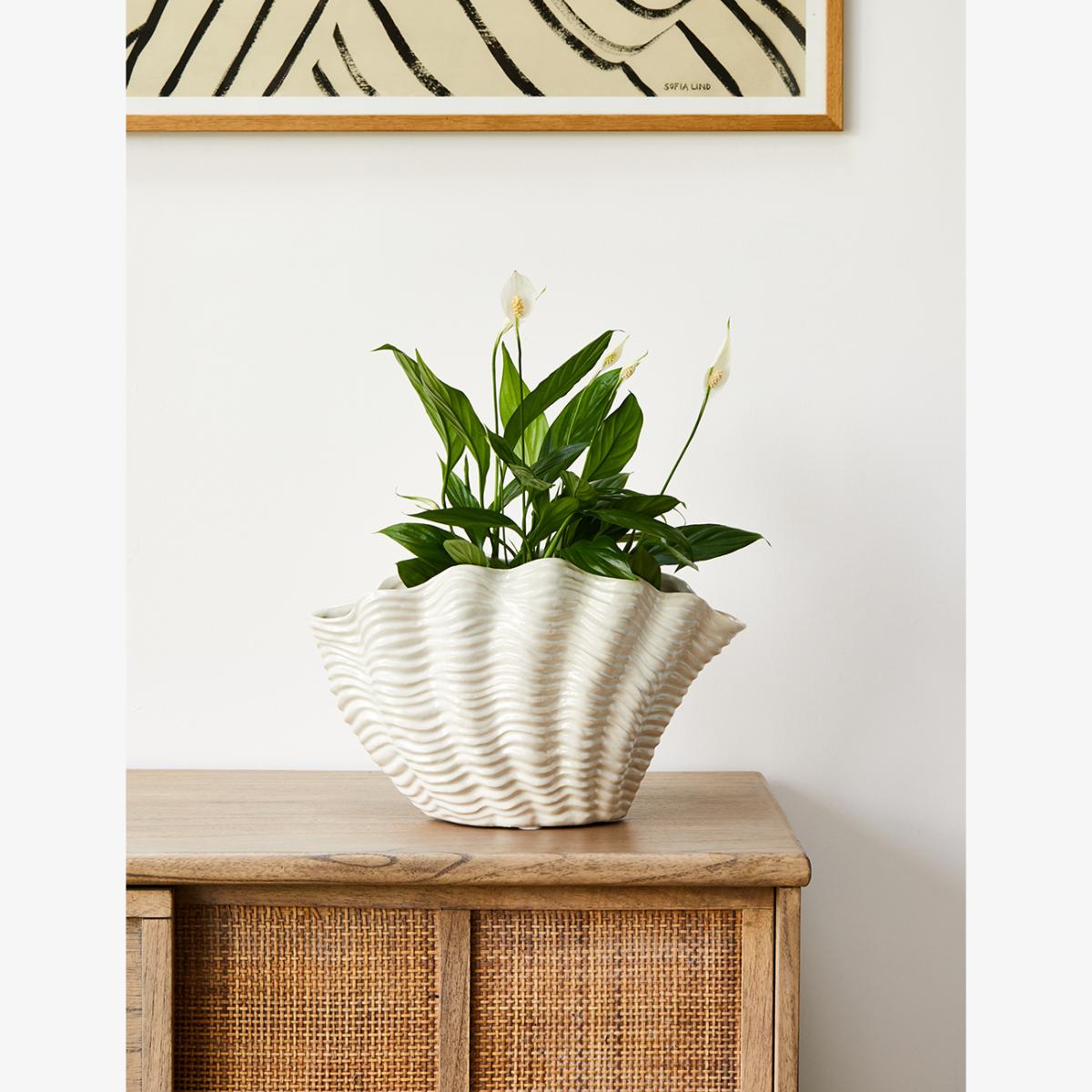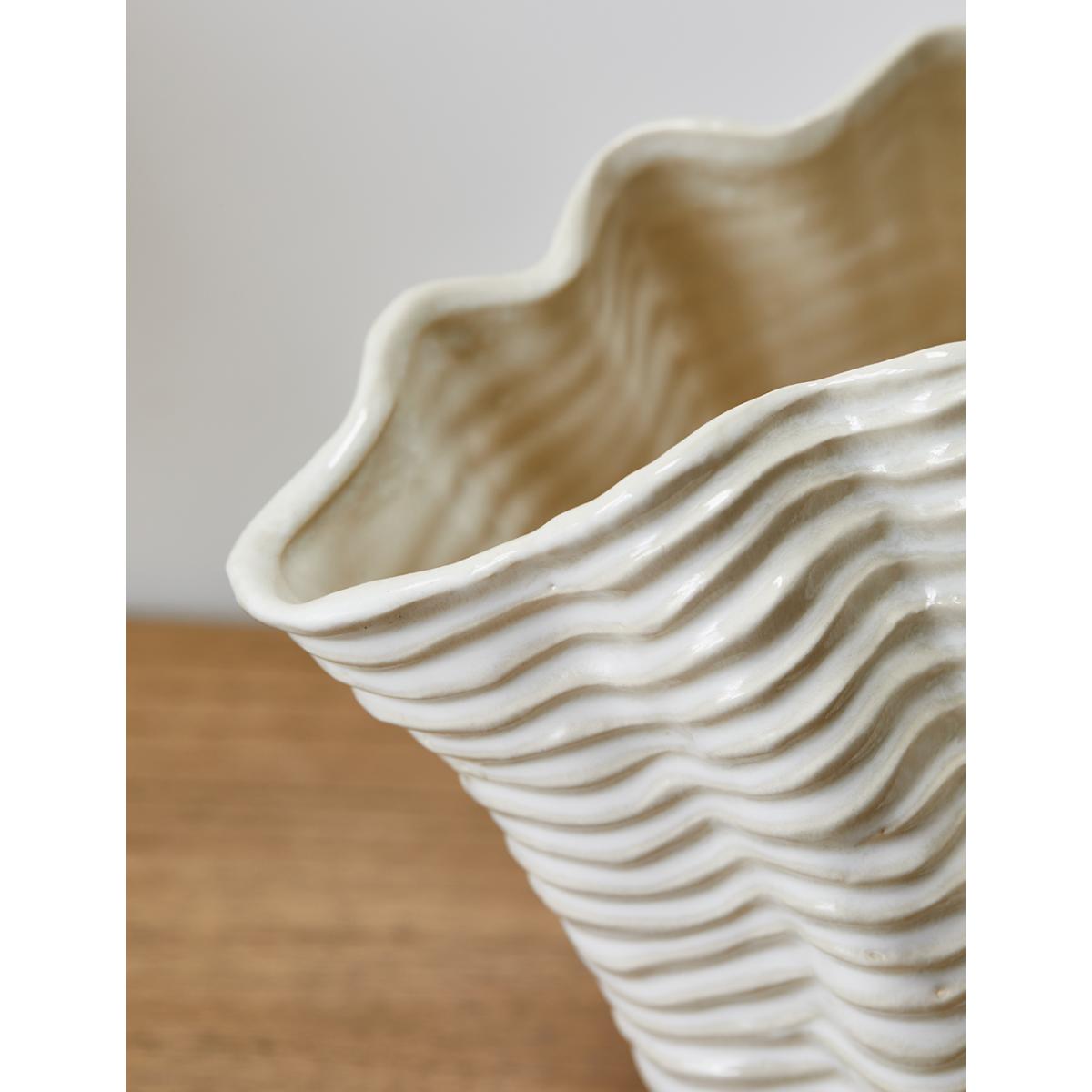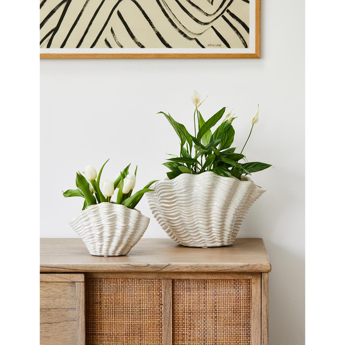 Add the finishing touches to your home with our Large Off White Shell Vase. Our shell shape vase is crafted from premium stoneware and finished with a white reactive glaze, so it holds up against most chips and scratches. It's the perfect companion for your fresh flowers and artificial plants. With its off-white hues and seashell-like texture, it looks beautiful as a stand-alone adornment. Pair with the matching Off White Shell Vase for a harmonious decorative style in your home.