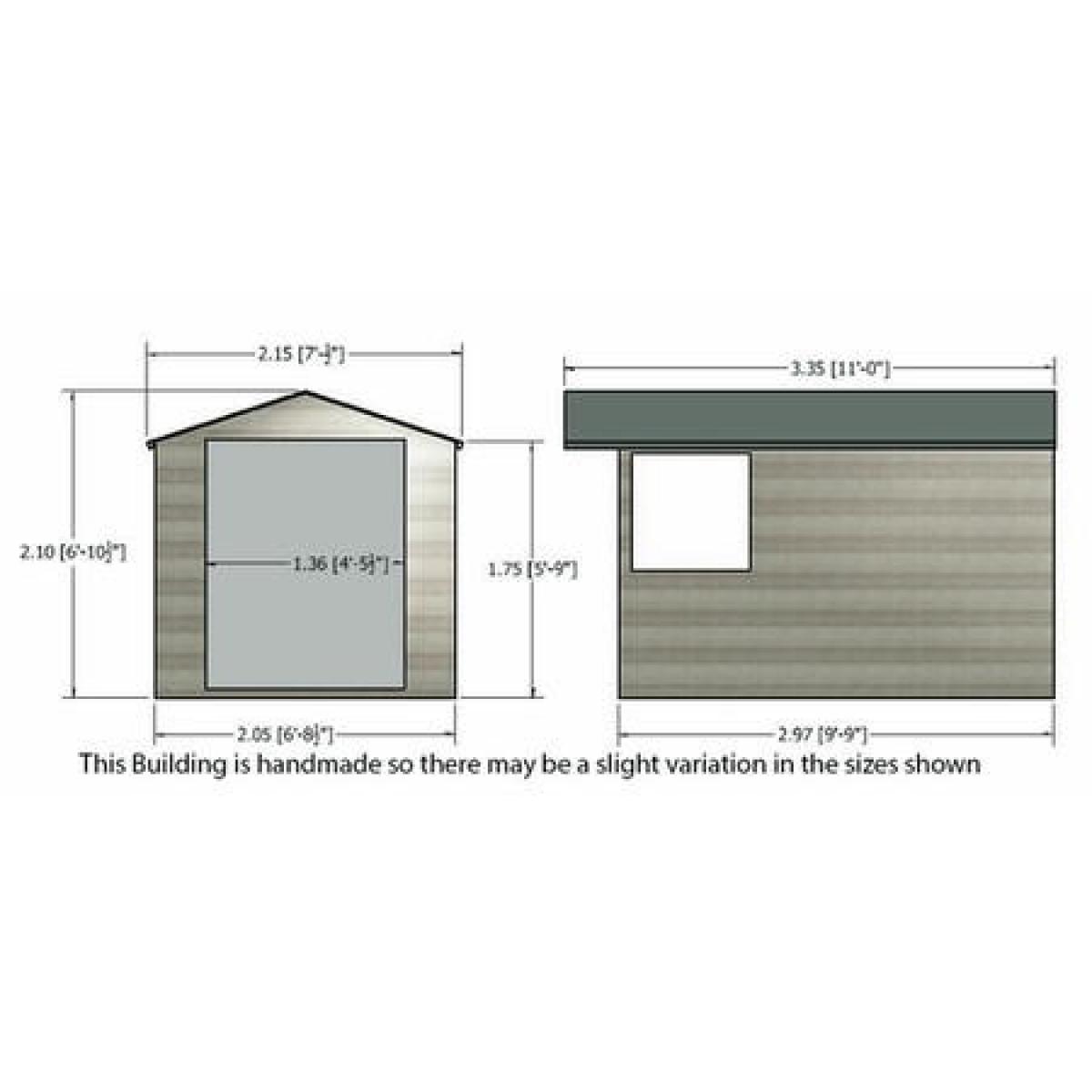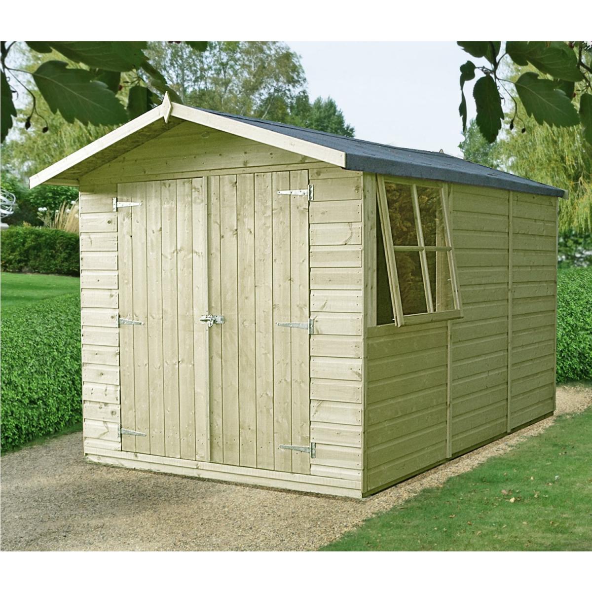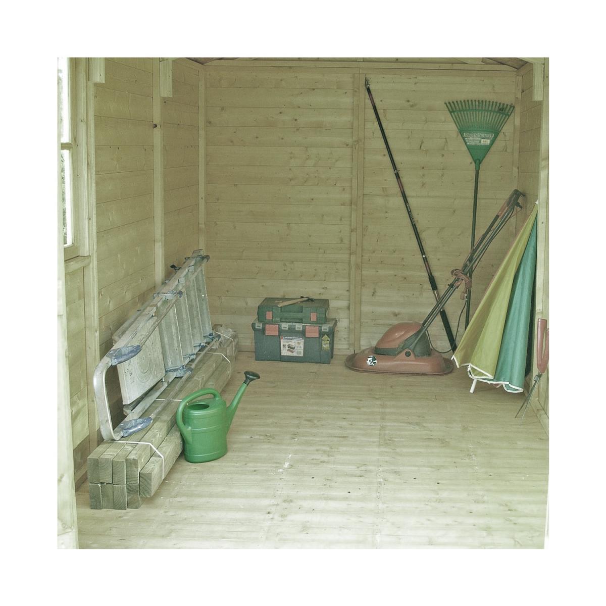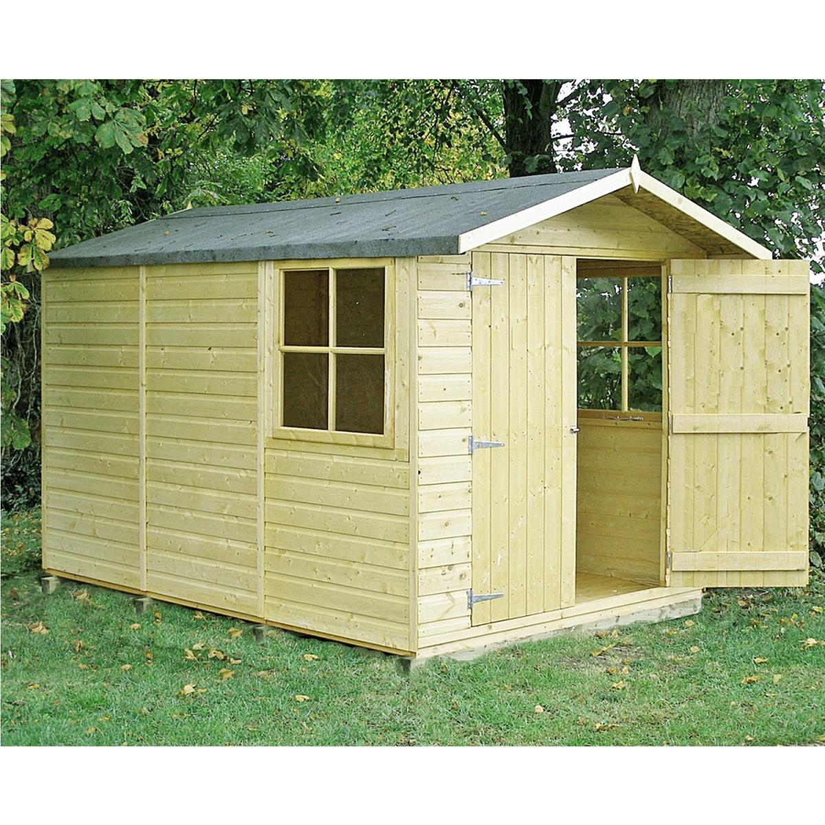 Please note We are unable to deliver to Ireland (NI and ROI). Apologies for any inconvenience. Features we love Attractive rustic appearance with spex style roof. Finished with traditional shiplap pine cladding. Fit a padlock to store all your belongings securely. Made in Britain from high-grade FSC certified pine. Different sizes and styles available in the Shire range *Imperial dimensions are approximate to the nearest foot please refer to the exact metric dimensions given. All about me. The 10' x 7' shiplap double door shed gives you generous storage space for your tools lawnmowers bikes or essentials. The Guernsey also has two opening mortise and tenon storm resistant windows and double doors for easy access. It is manufactured from slow-grown pine cladding boards on thick 34mm square framing with the roof made from solid sheet OSB. The high-quality wooden flooring is joined with tongue and groove panels. All the wood is also dip treated with a preservative basecoat ready for you to finish with your own choice of topcoat following assembly. If you’re worried about storing your belongings safely the door is fitted with a hasp and staple catch for you to secure with your own padlock so you can start using your shed straight away. For a quick and easy assembly all the required fixings are included alongside simple instructions. Need to know. Dimensions. H211.2 x W204.8 x D297 cm Guarantee. 12 months Assembly required. Yes.
