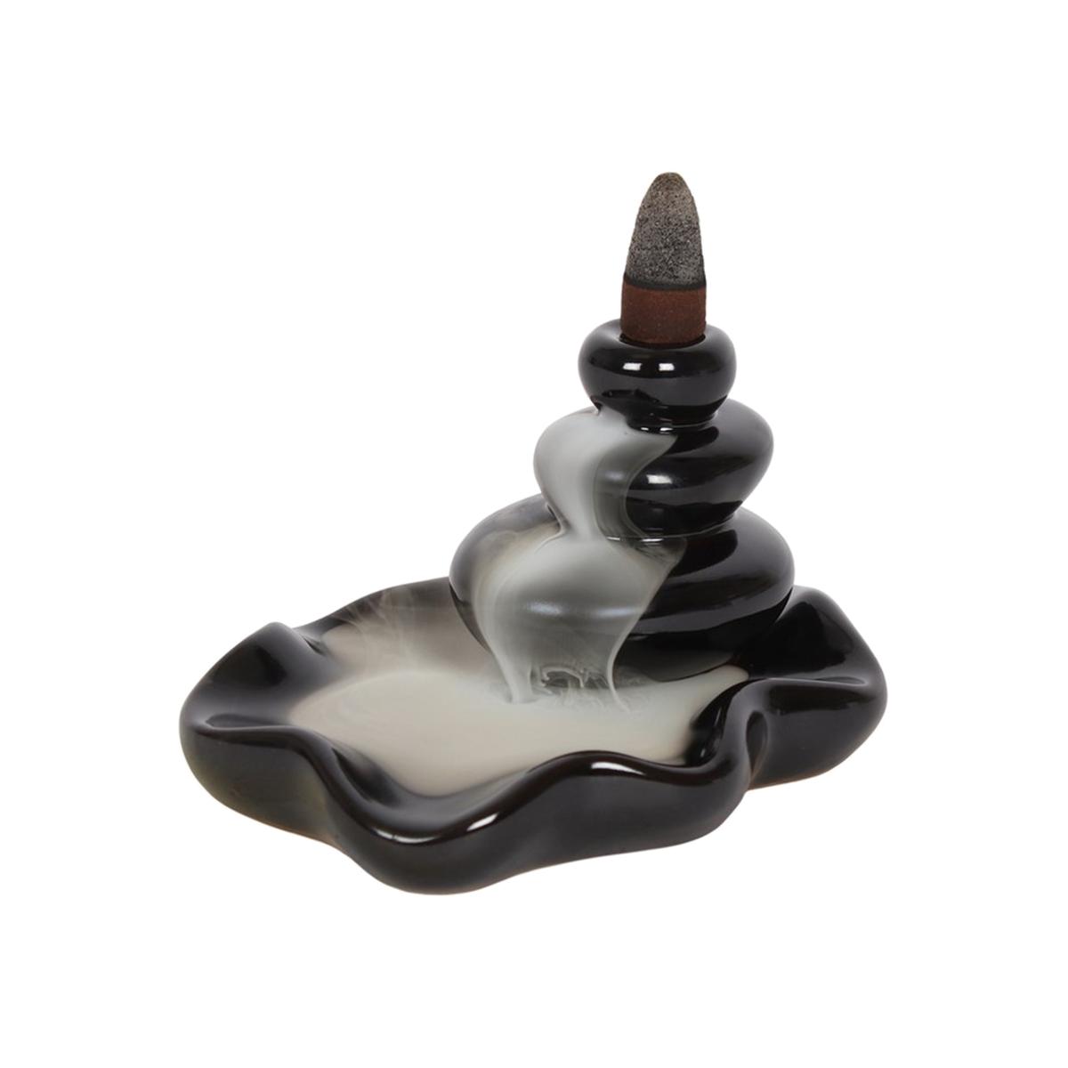 A stunningly simple backflow incense burner in a large black ceramic stacked pebble design. When the cone is lit the smoke from the cone cascades downwards in a mesmerising waterfall effect to pool at the bottom. Beautiful to watch. For best effects burn indoors in an area away from any sudden air movements. Please note that after burning it is normal for a light oily residue to appear on the oil burner, for this reason we recommend protecting any furniture it is placed upon suitably. The residue can be easily wiped off the burner with a damp cloth. Please exercise caution when burning incense. Only backflow incense cones should be used with this product, standard incense cones will not create the desired effect. It is normal for cones to take up to 10 minutes after being lit to start creating the smokingmist effect.