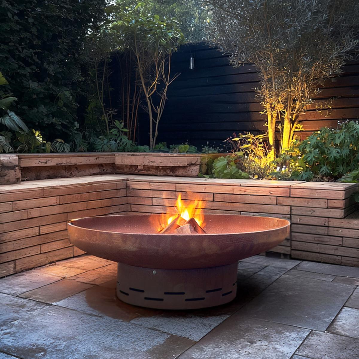 I love this fire pit for its industrial aesthetic and robust presence, making it an excellent statement piece in both contemporary and rustic outdoor spaces. Its large size and pre-rusted corten steel finish can enhance a modern garden with minimalist lines or add character to a more eclectic setting. When styling, consider pairing it with natural materials like timber furniture or stone pathways to emphasise its earthy tones. Practical tips include placing it on a level, non-flammable surface and pairing it with comfortable outdoor seating to create cosy, inviting outdoor living areas. The rusted finish ages beautifully over time, adding to its charm and helping it blend seamlessly into a relaxed, natural environment.